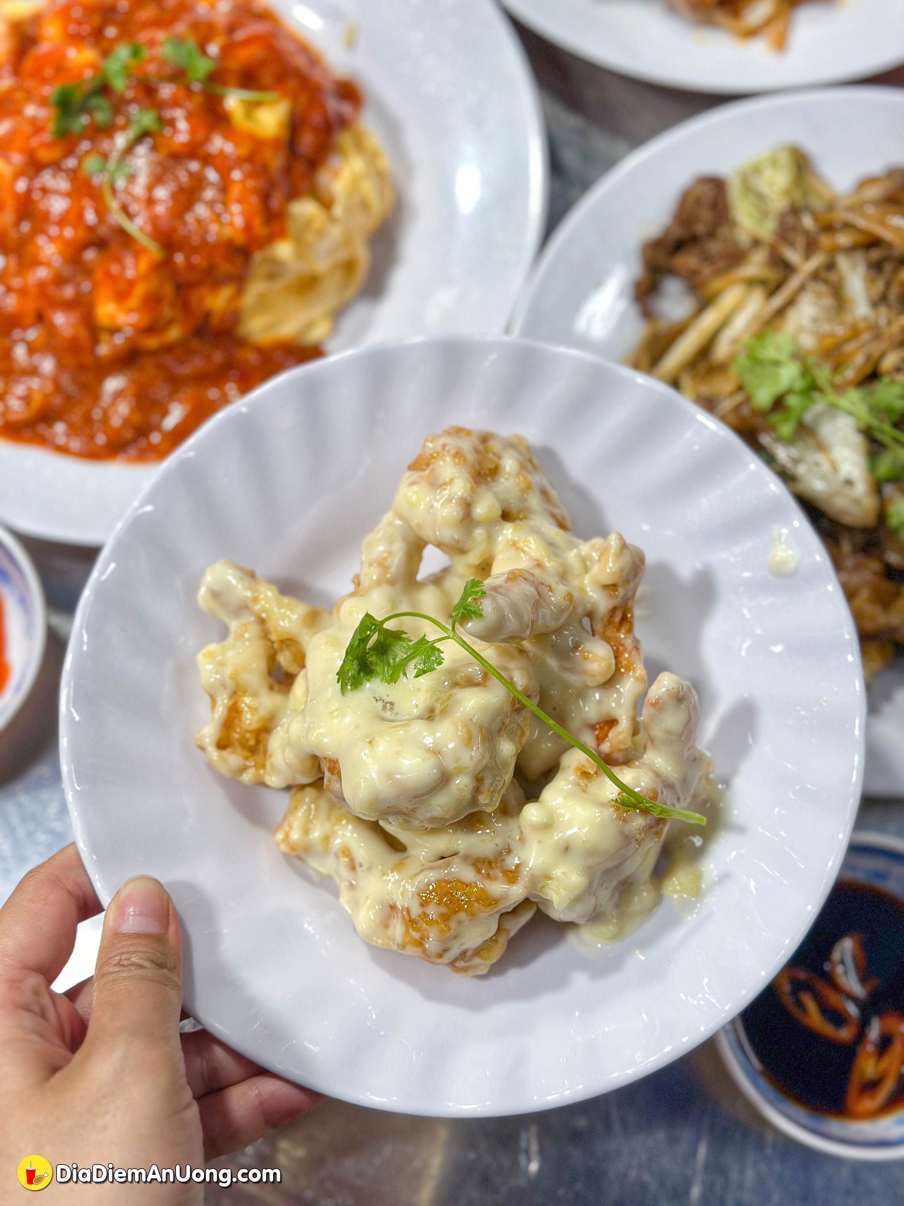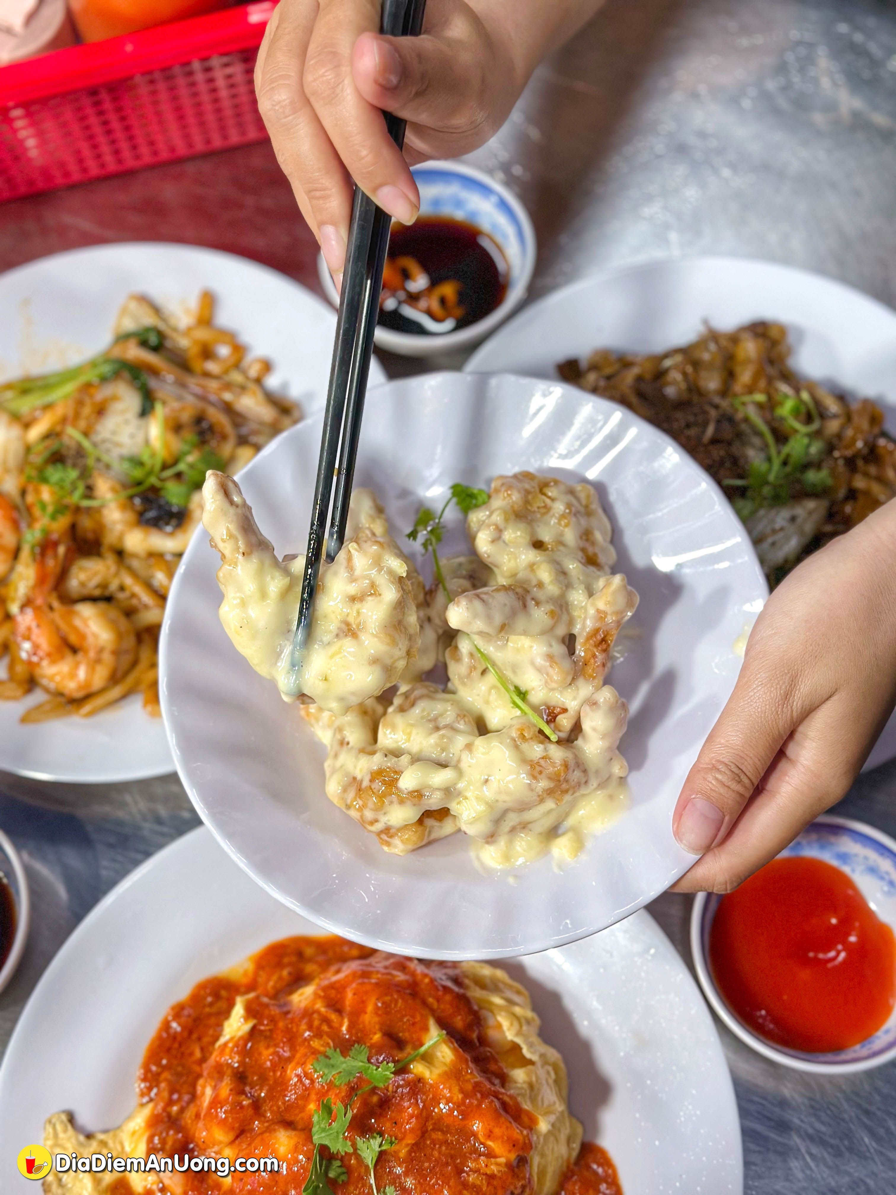 Ngoài món cơm best-seller, nổi bật nhất phải kể đến Tôm chiên bột sốt Mayo. Từng con tôm tươi được tẩm một lớp bột mỏng, chiên vàng giòn rồi phủ lên lớp sốt mayonnaise được pha cùng với nước ép thơm dậy mùi béo ngậy, thơm lừng. Vỏ tôm giòn rụm, thịt tôm bên trong săn chắc, ngọt tự nhiên, hòa quyện với vị béo của sốt mayo tạo nên một món ăn cực kỳ lôi cuốn.
