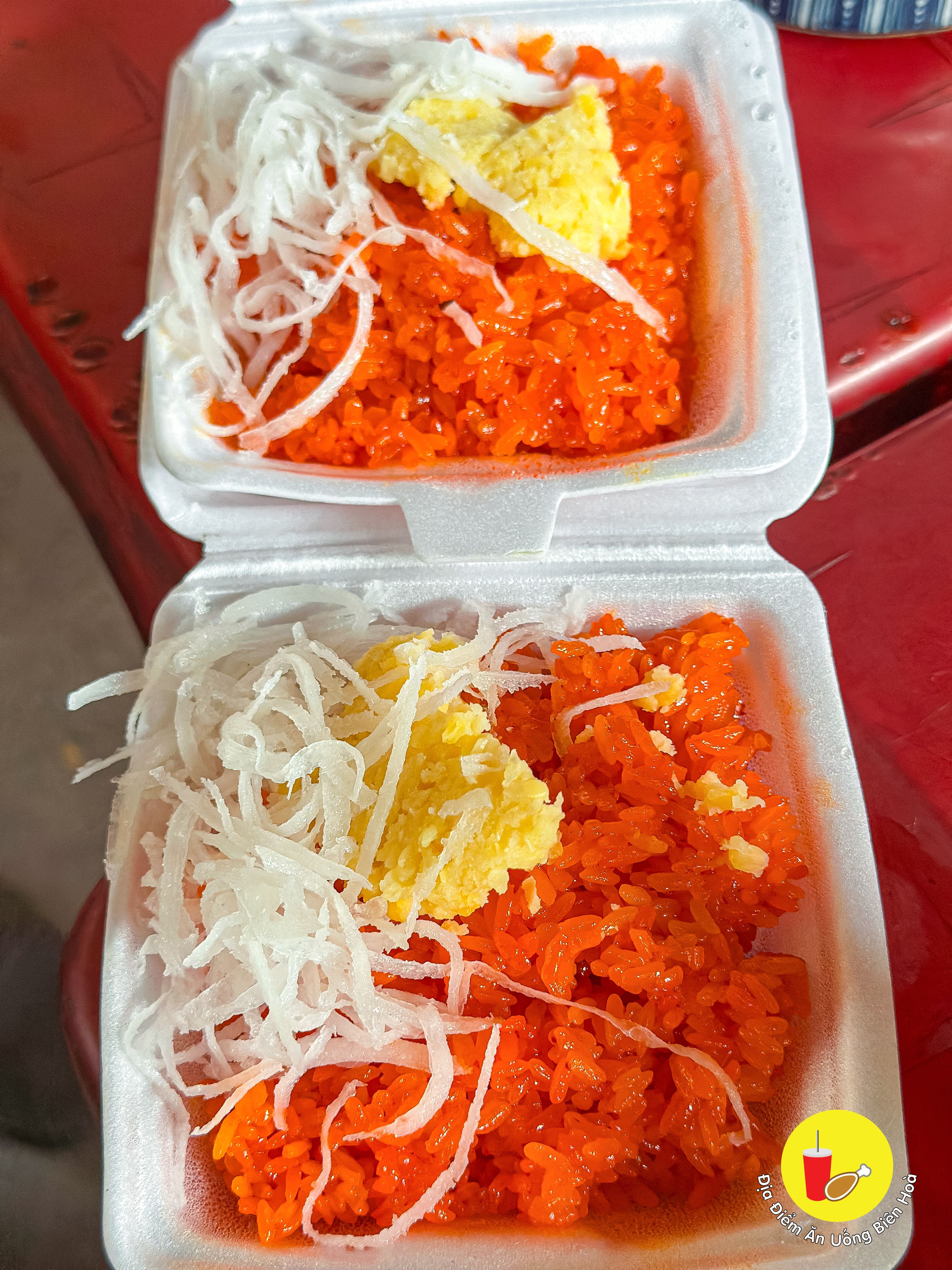 Thêm một món phụ khá bất ngờ là xôi gấc. Xôi dẻo, màu đỏ cam đẹp mắt, ăn bùi bùi và không quá ngọt. Mình lấy thử một hộp nhỏ khoảng 10k mà ăn cũng khá vừa miệng.