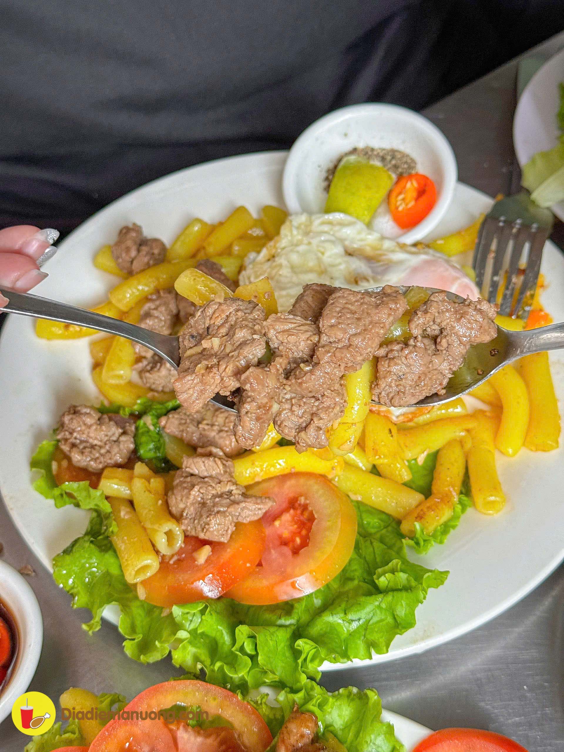 Mình gọi Nui bít tết, nui xào bò lúc lắc, nui xào sườn đều chỉ 35k, ăn kèm thêm trứng thì 40k. Bít tết thập cẩm có thêm patê và chả thì 45-50k thôi đó. Giá cả cực mềm với chất lượng món ăn luôn.