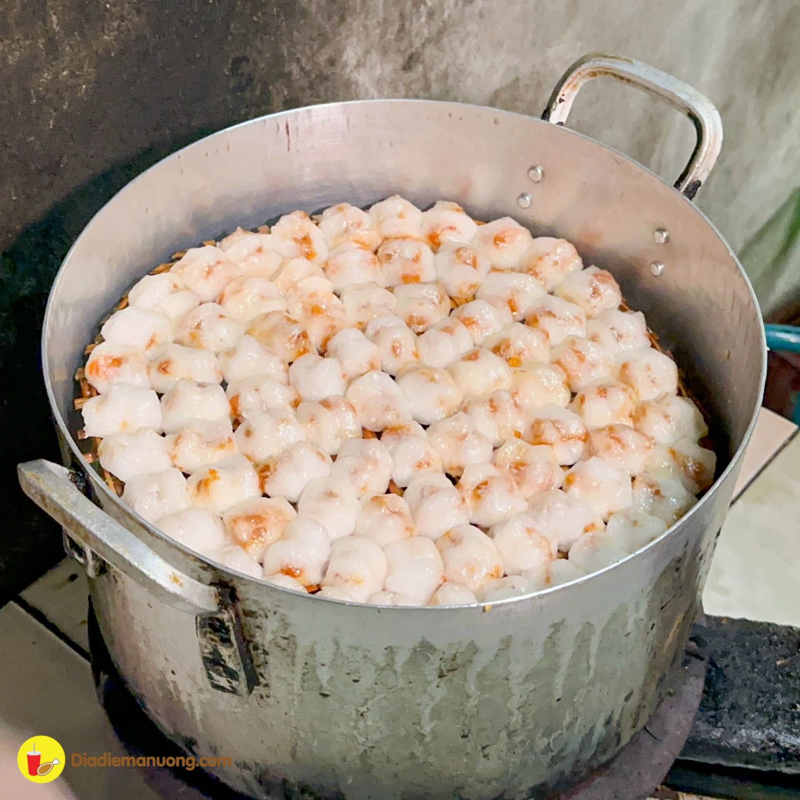 Khi nào khách ăn thì bên quán họ mới cho vào nồi hấp cách thủy trong 3 phút là bánh chín liền… do vậy nên bánh lúc nào cũng nóng hổi, dẻo ngon chứ không có bị sượn hay nguội nè :3