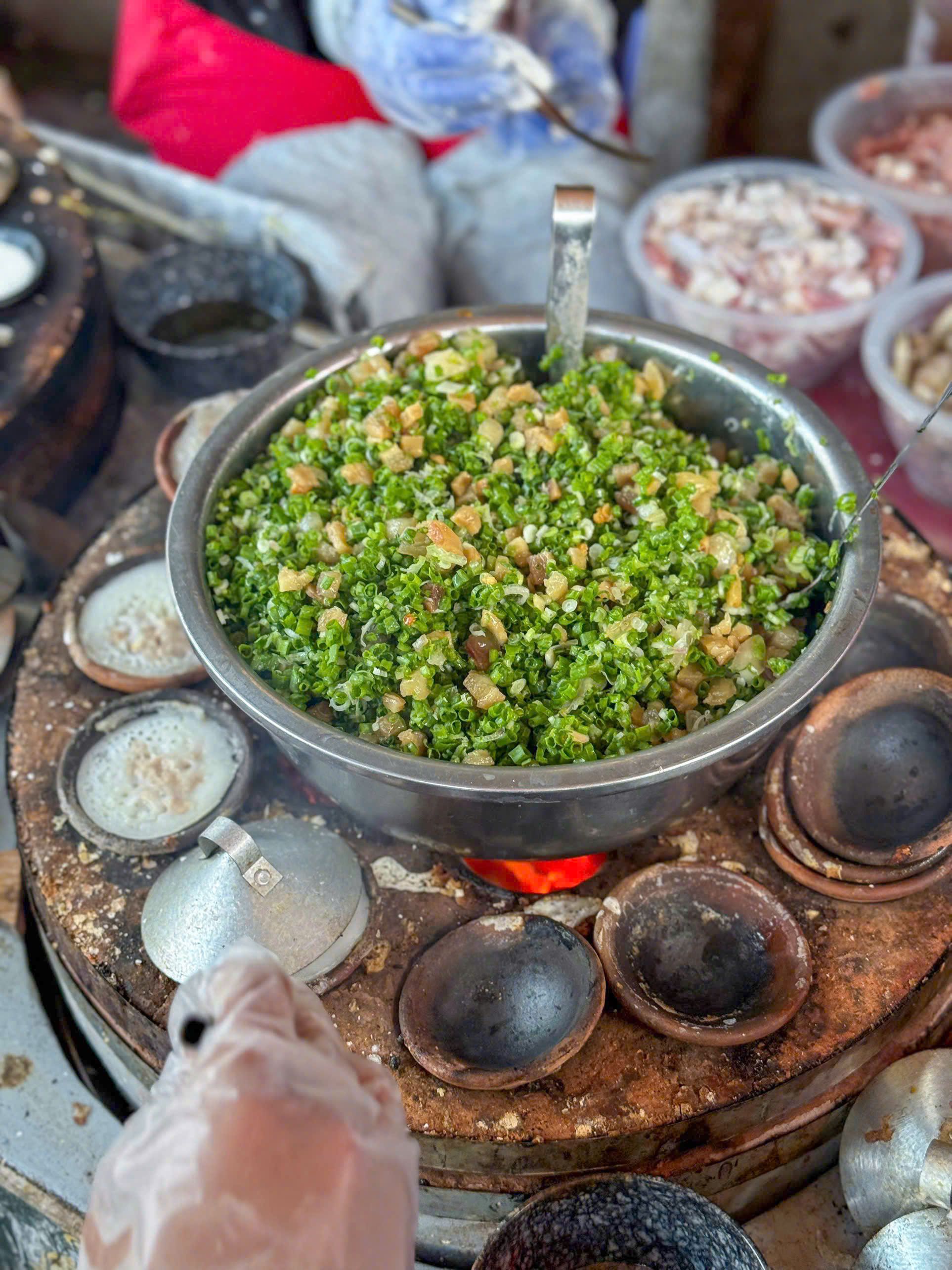 Quán bánh căn Bà Tám ngay góc đường Tạ Quang Bửu lúc nào đi ngang cũng đông nghẹt khách. Đập vào mắt là 6 lò bánh được đổ nóng liên tục, mới kịp bán cho khách.