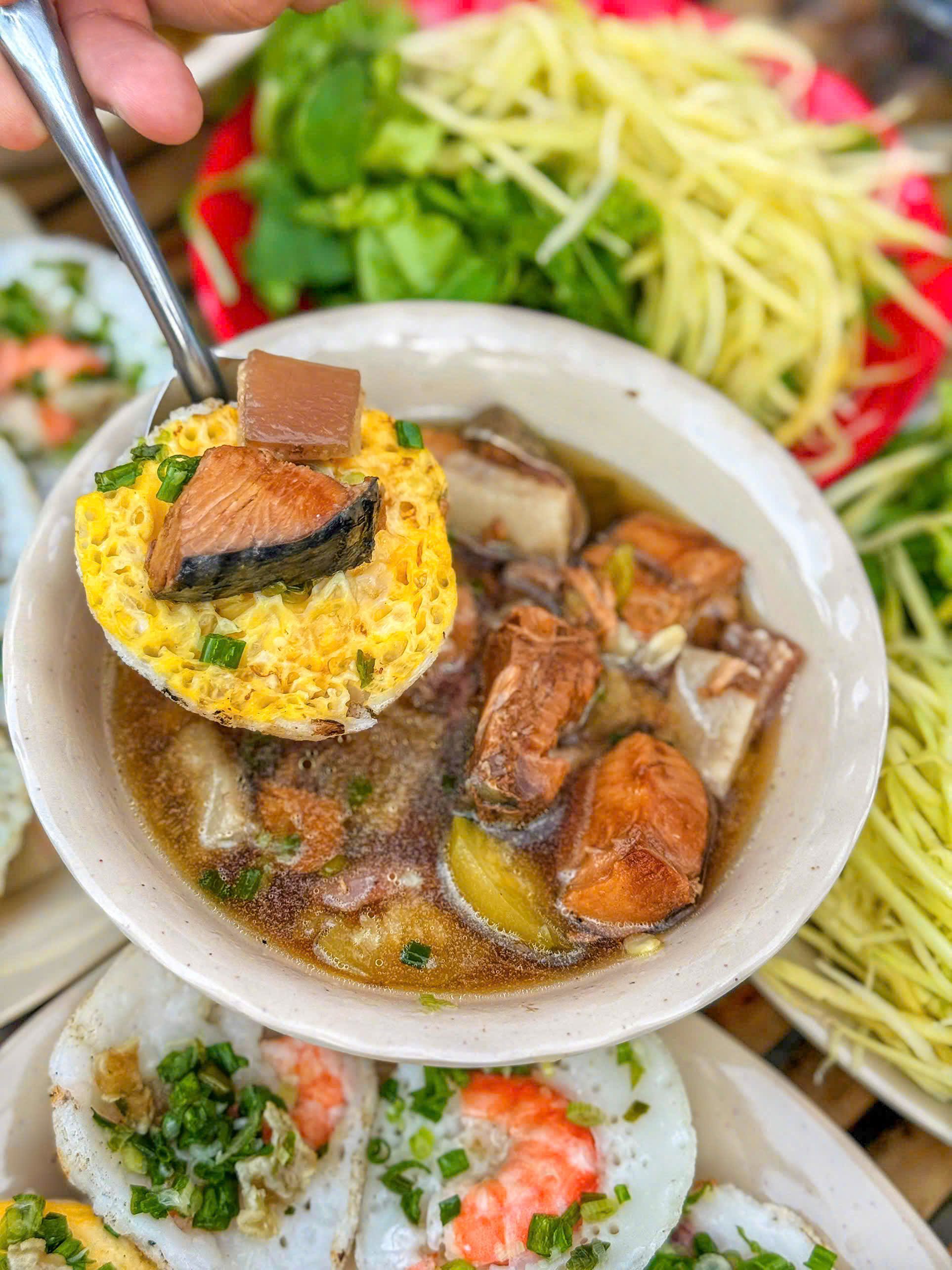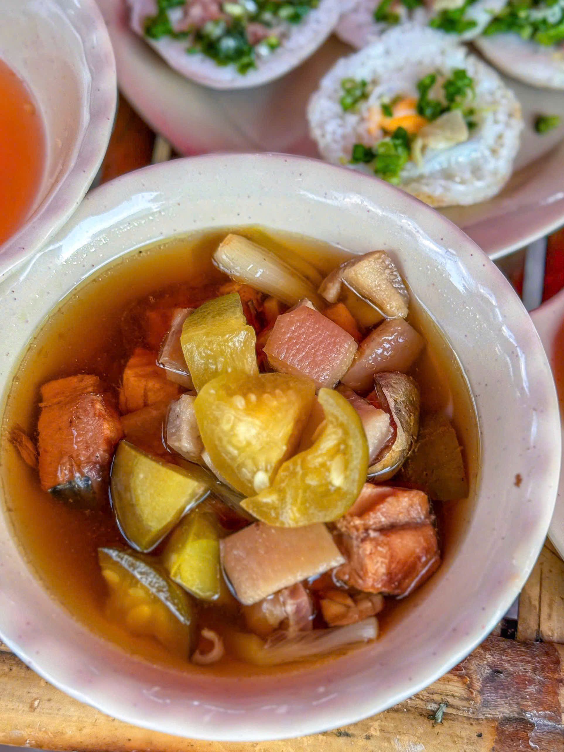 Mắm cá chén gọi thêm hình như 10k/chén á trong có cá hường, da heo, cà bung. Vị mắm cá thanh ngọt từ cá, chấm bánh căn cũng ngon lắm nha.