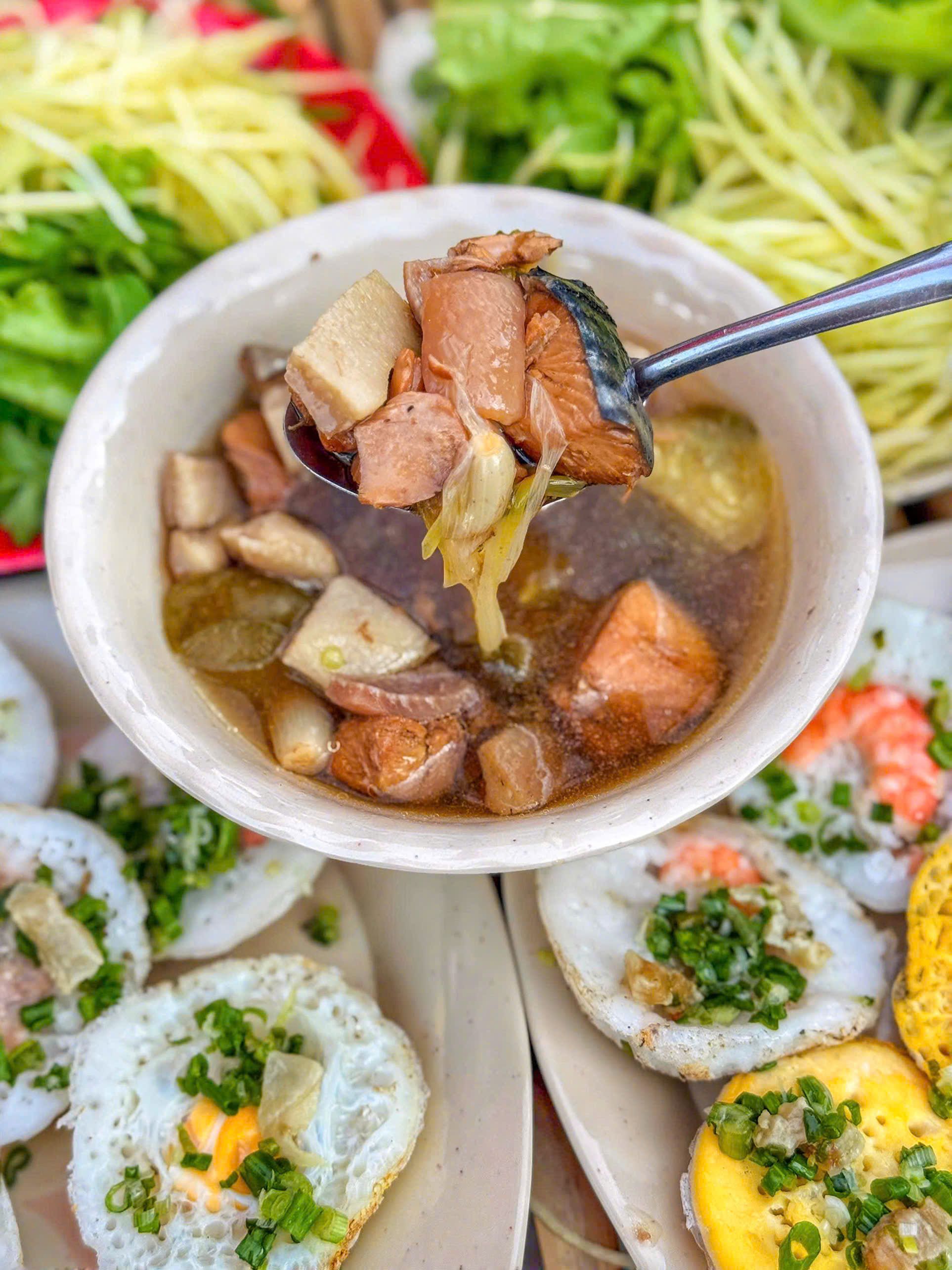 Bánh căn đồng giá 5k rau mắm ăn thoải mái - khách luôn đông kín từ lúc bán đến hết