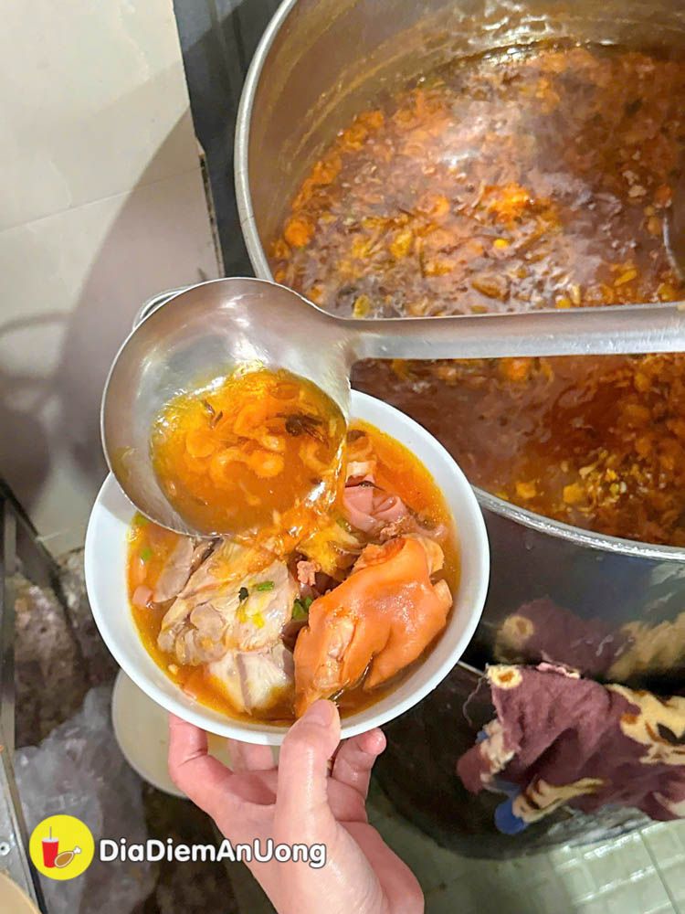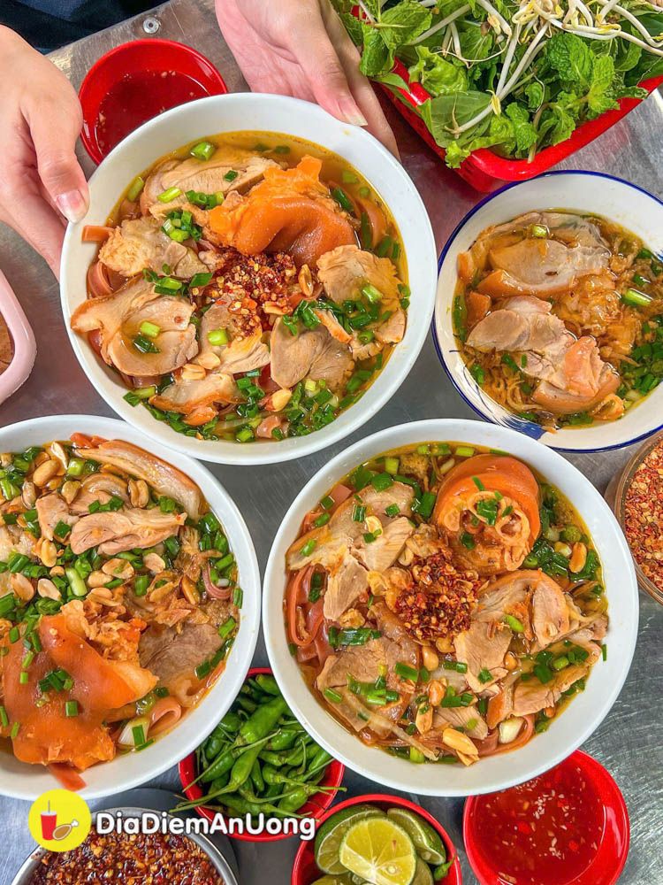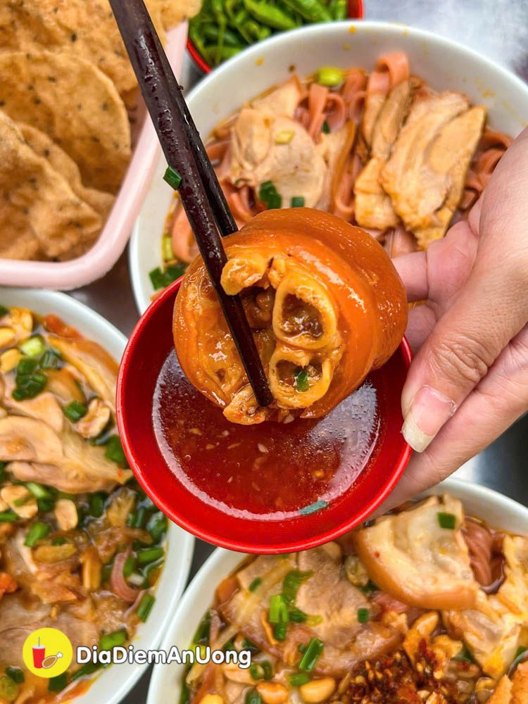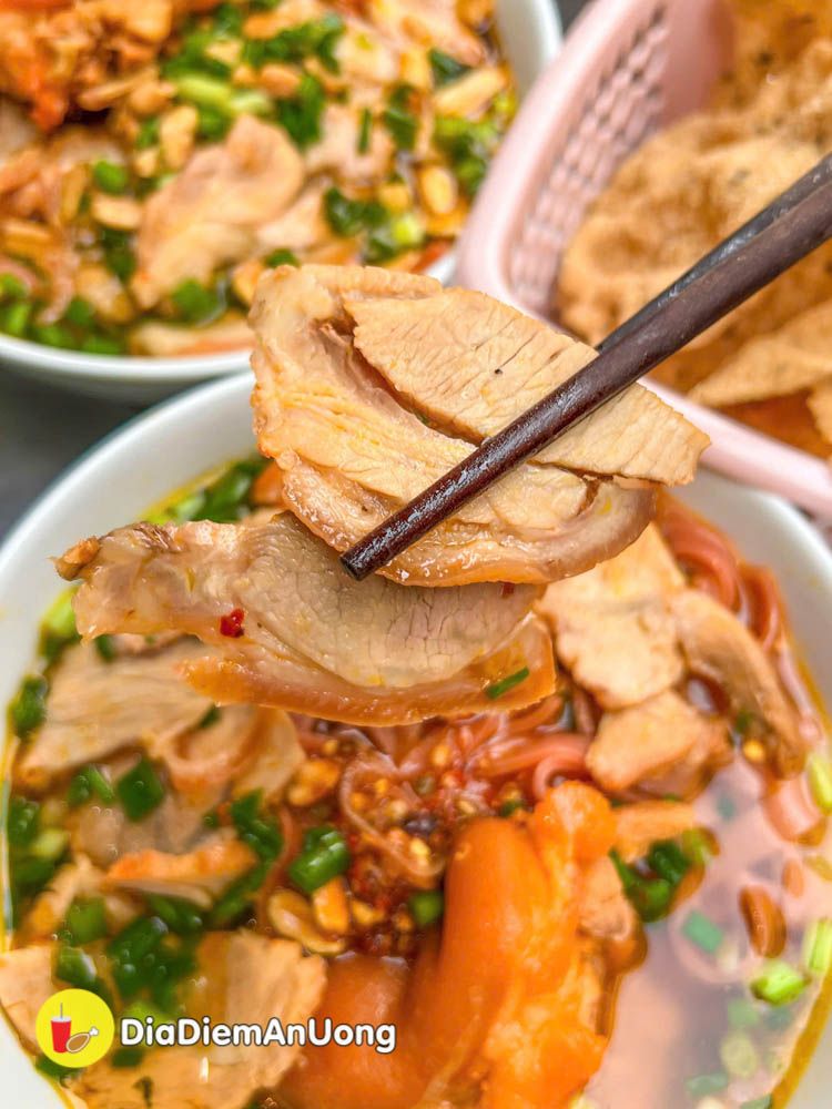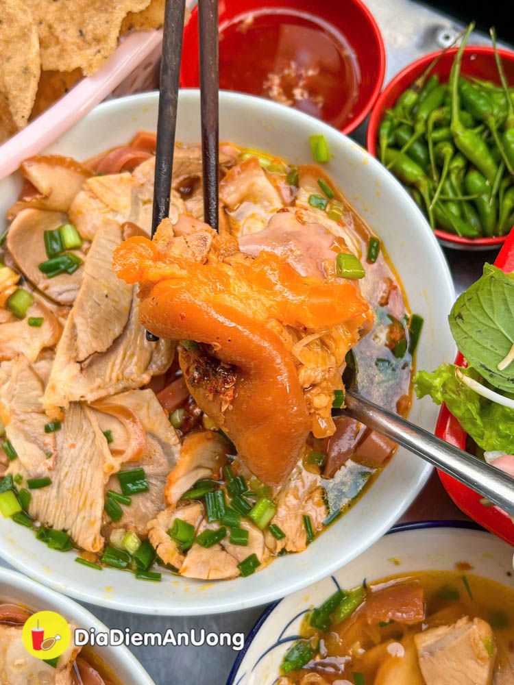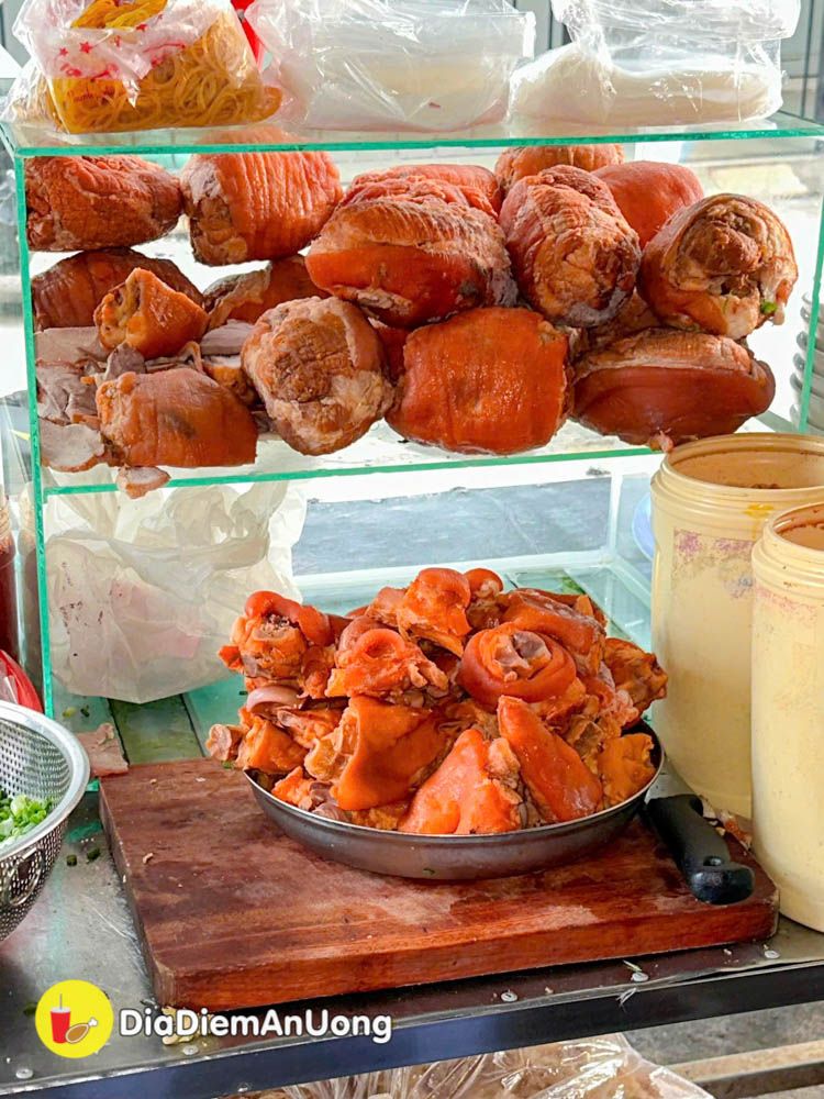 Đồ ăn ở đây chỉ có thịt bắp giò, giò heo, móng heo - phần bắp giò được bó chặt và nấu cùng nước dùng mì quảng