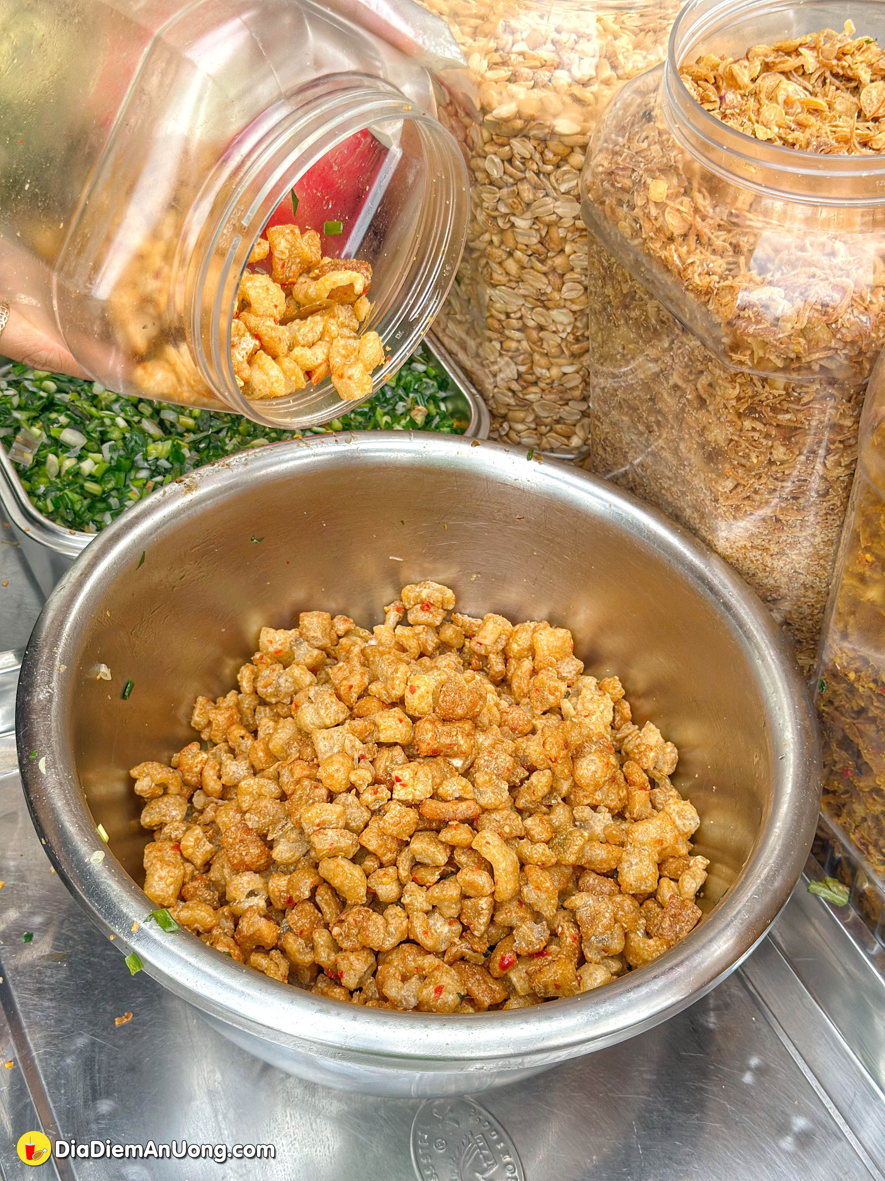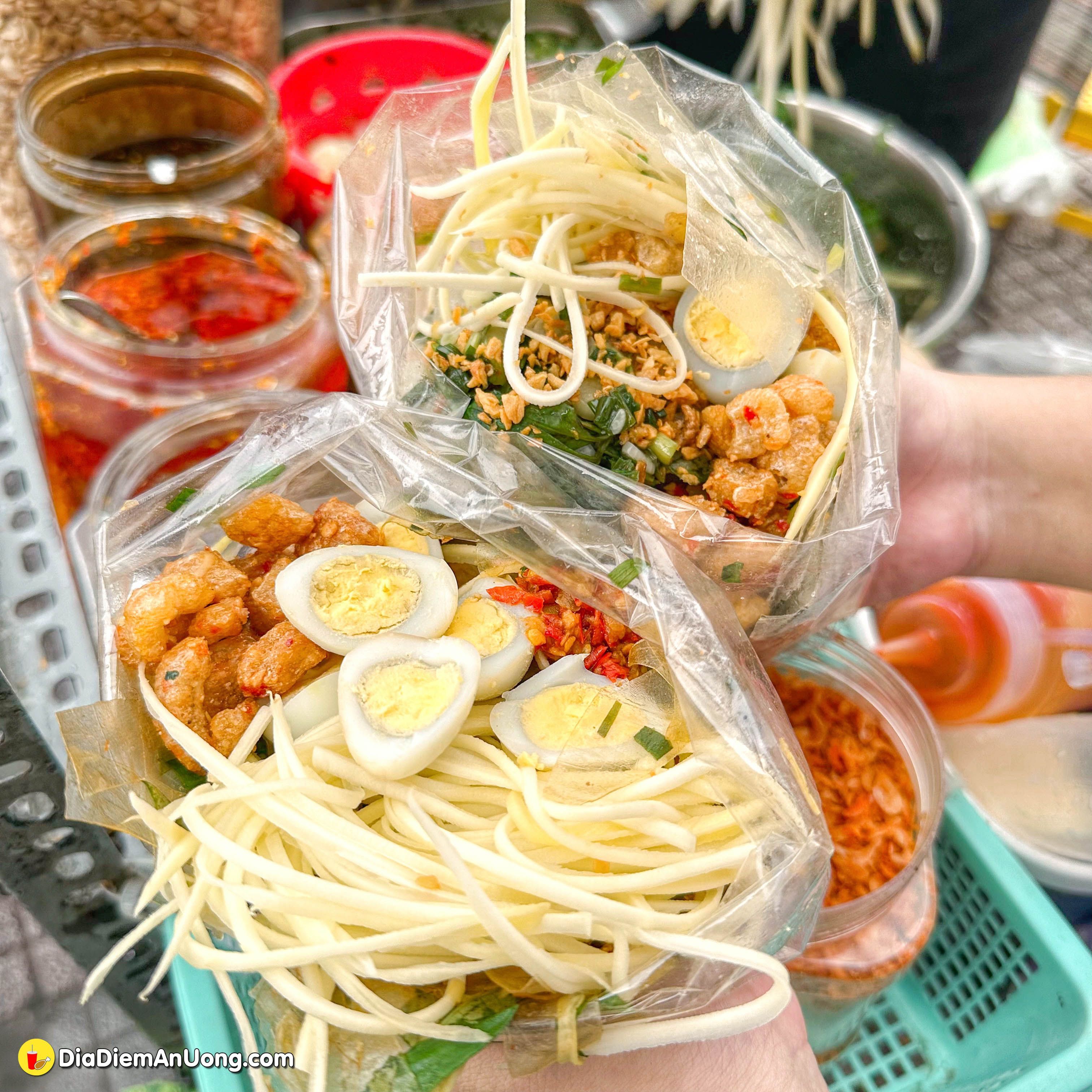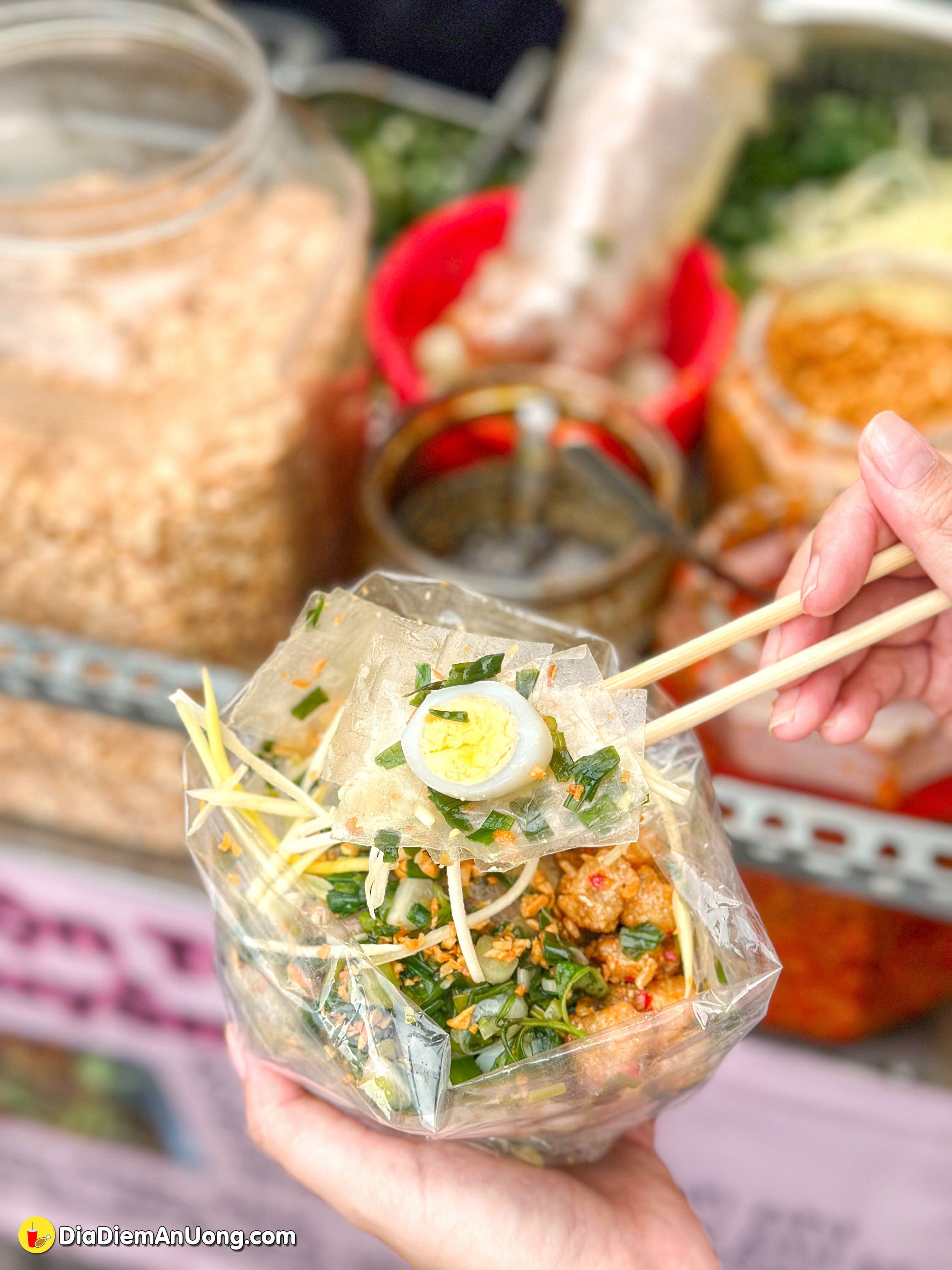 Bịch bánh tráng đầy ú ụ, ăn thấy topping không hề “tiết kiệm”: nào là trứng cút, xoài bào, rau răm, tỏi phi giòn rụm, đậu phộng béo bùi, các loại khô và cả da heo chiên giòn giòn. Đặc biệt, phần sa tế tỏi chính là “linh hồn” của xe bánh tráng này – cay nồng nhưng thơm, vừa ăn vừa hít hà, nhưng đã cay lại càng ghiền.