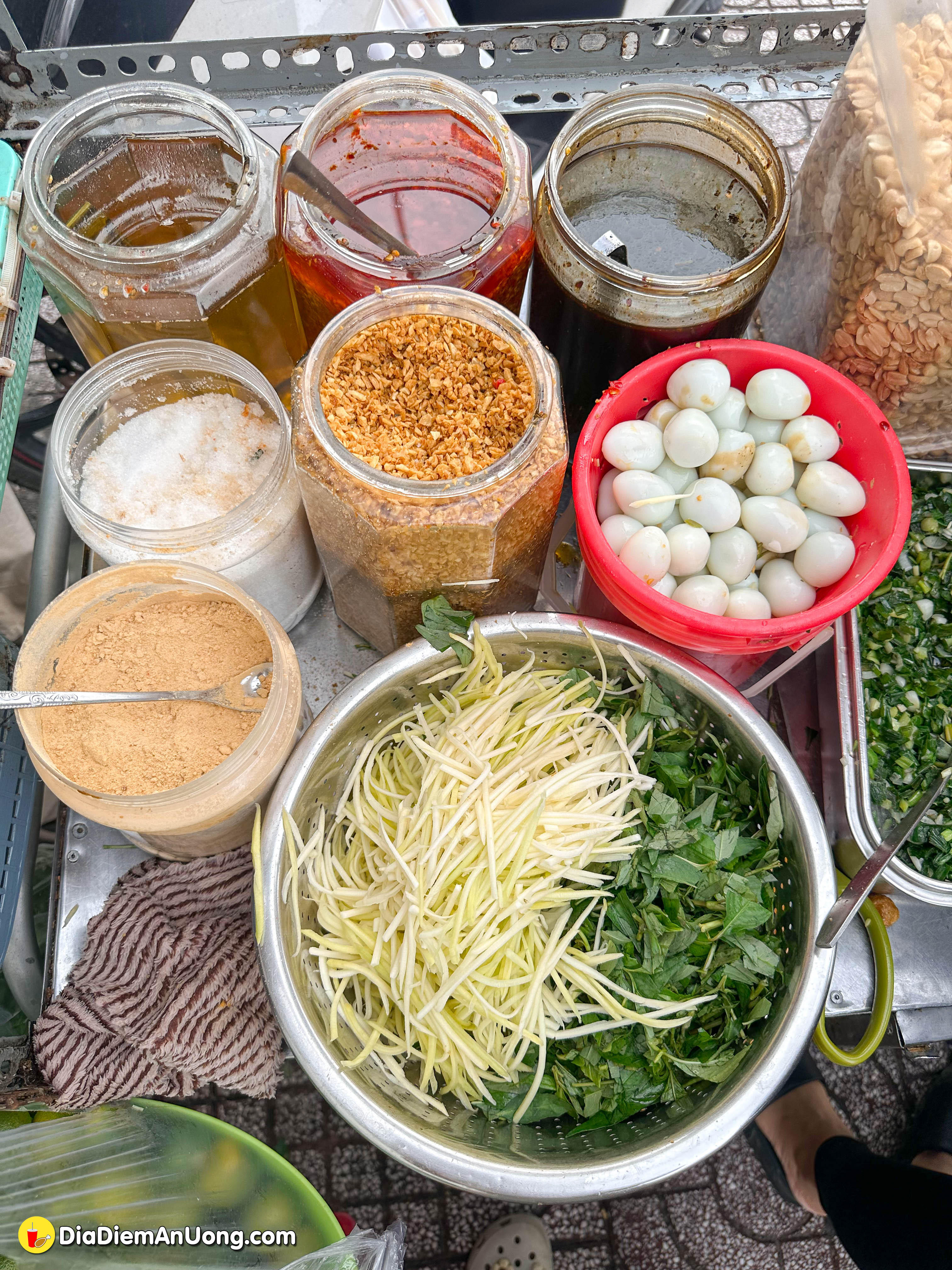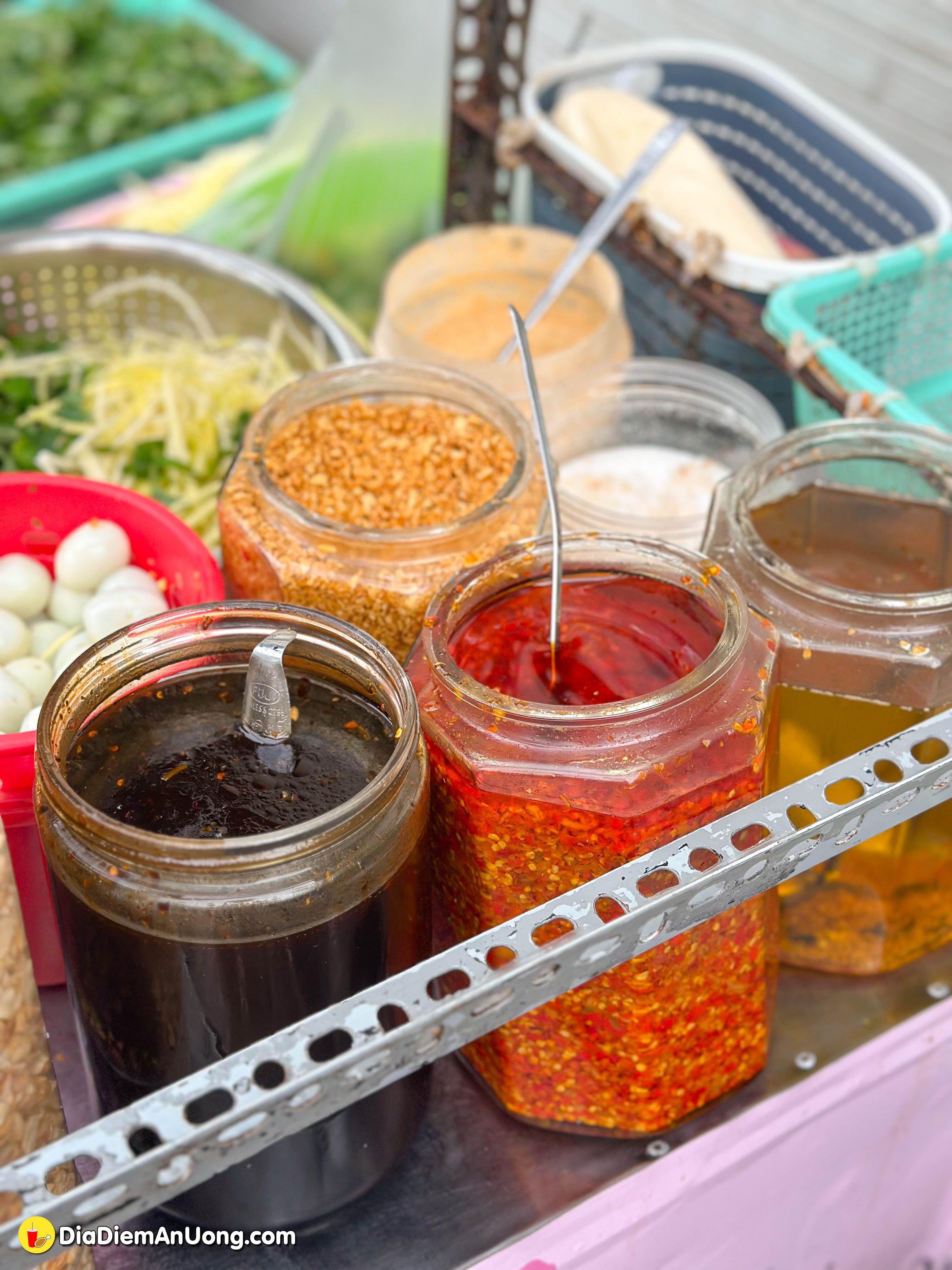 Nhìn qua tưởng bình thường, nhưng ai ăn rồi sẽ biết đây là một “gánh hàng nhỏ mà có võ”. Trên xe là đủ loại hũ gia vị hấp dẫn: sa tế đỏ rực, nước me, mắm ớt, hành phi, tỏi phi, đậu phộng rang thơm, đến cả mỡ hành cũng bóng bẩy mời gọi.