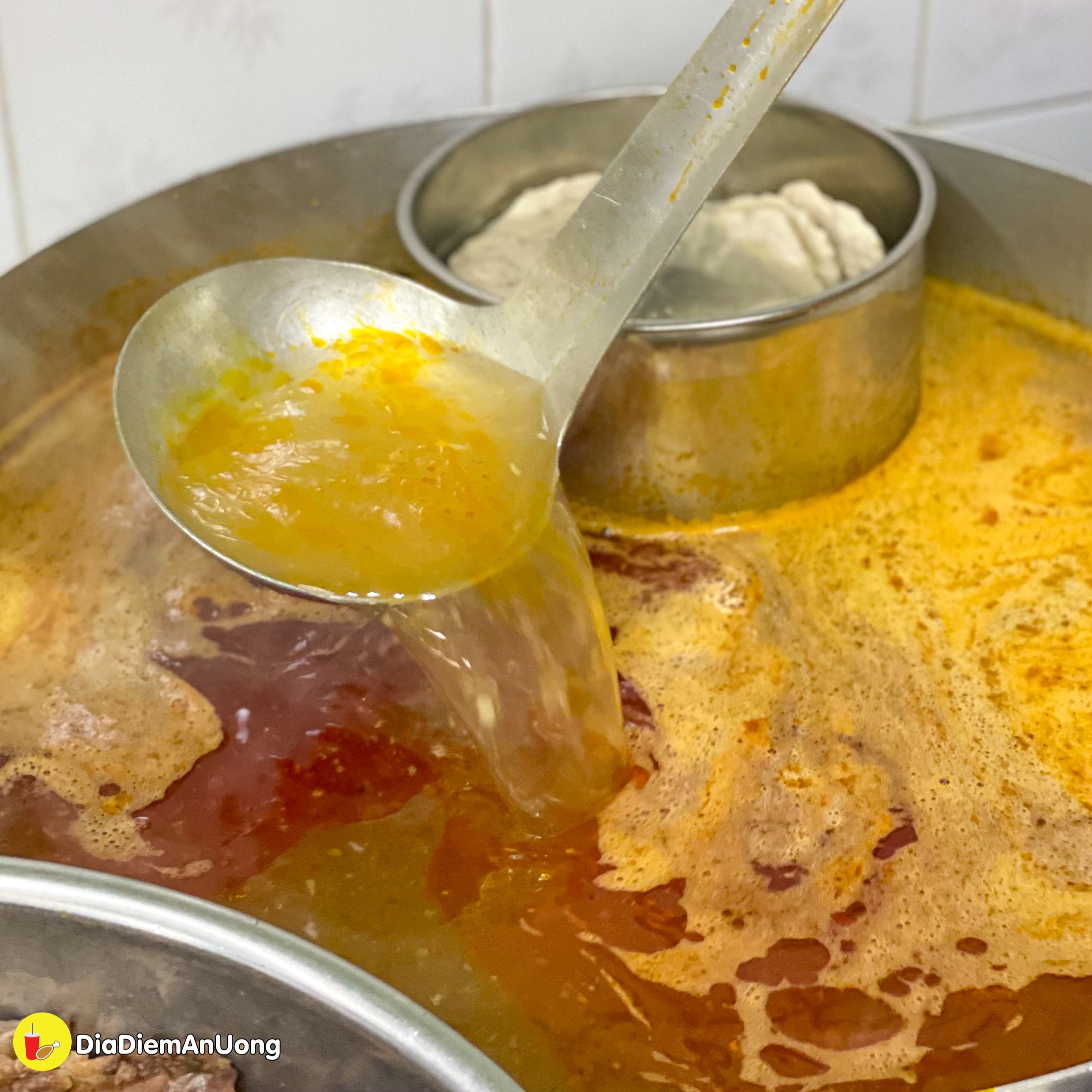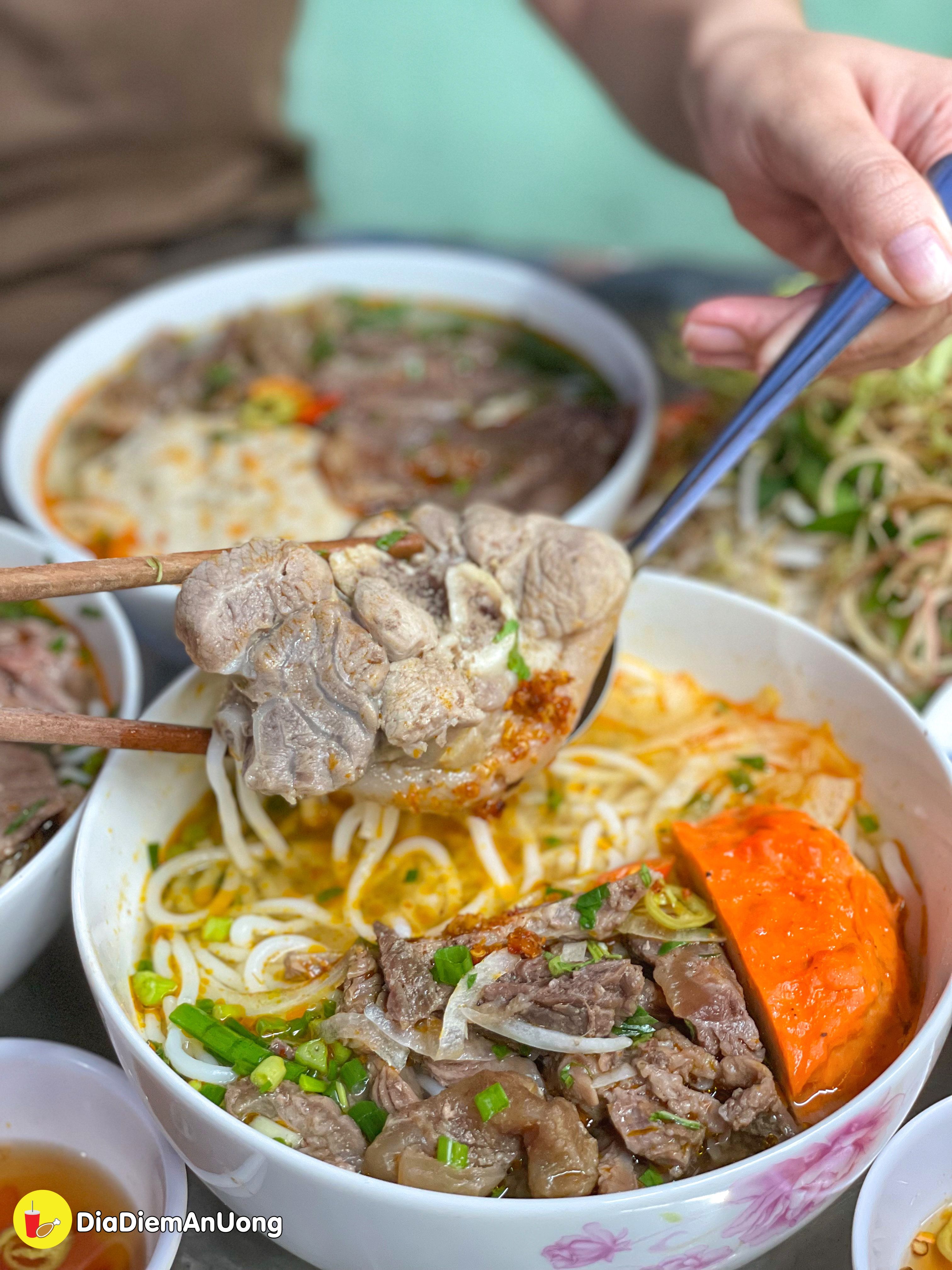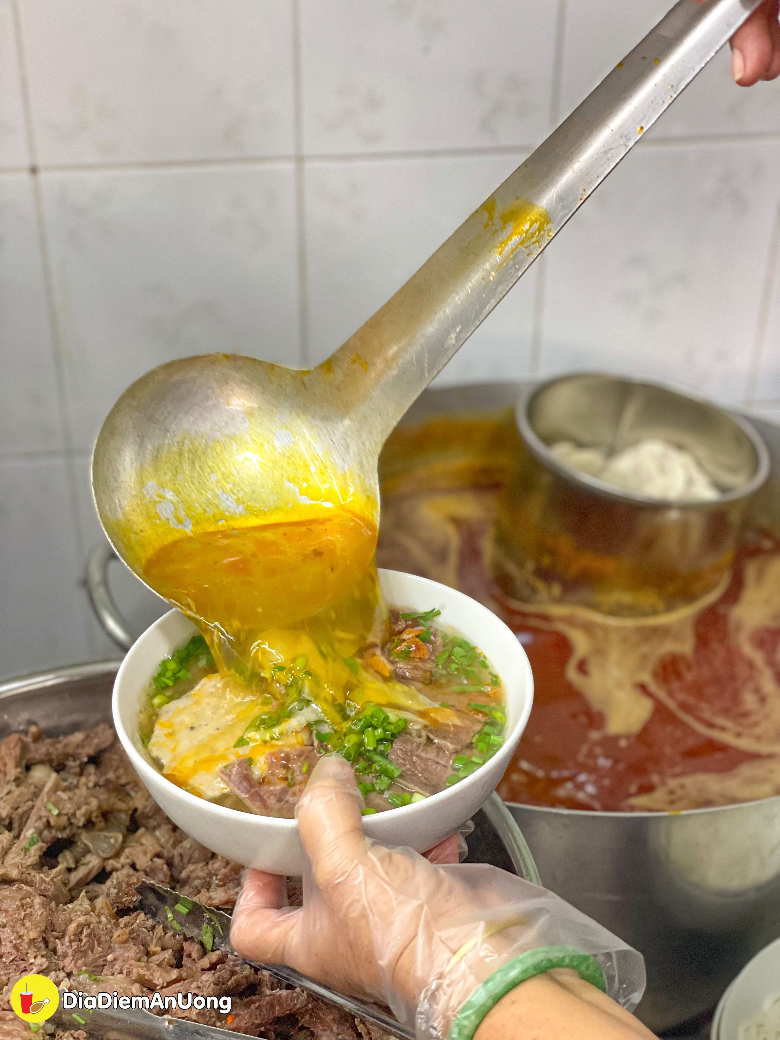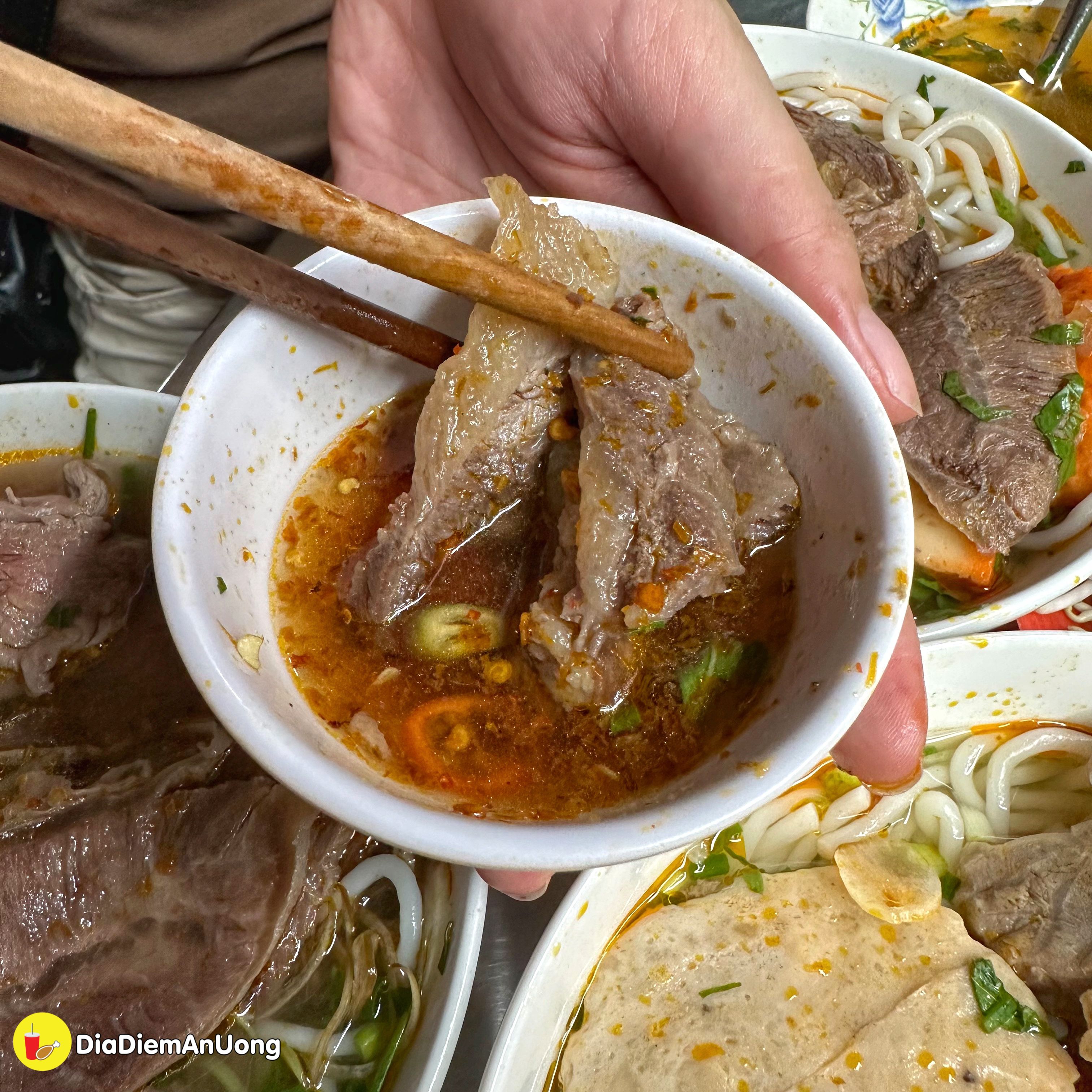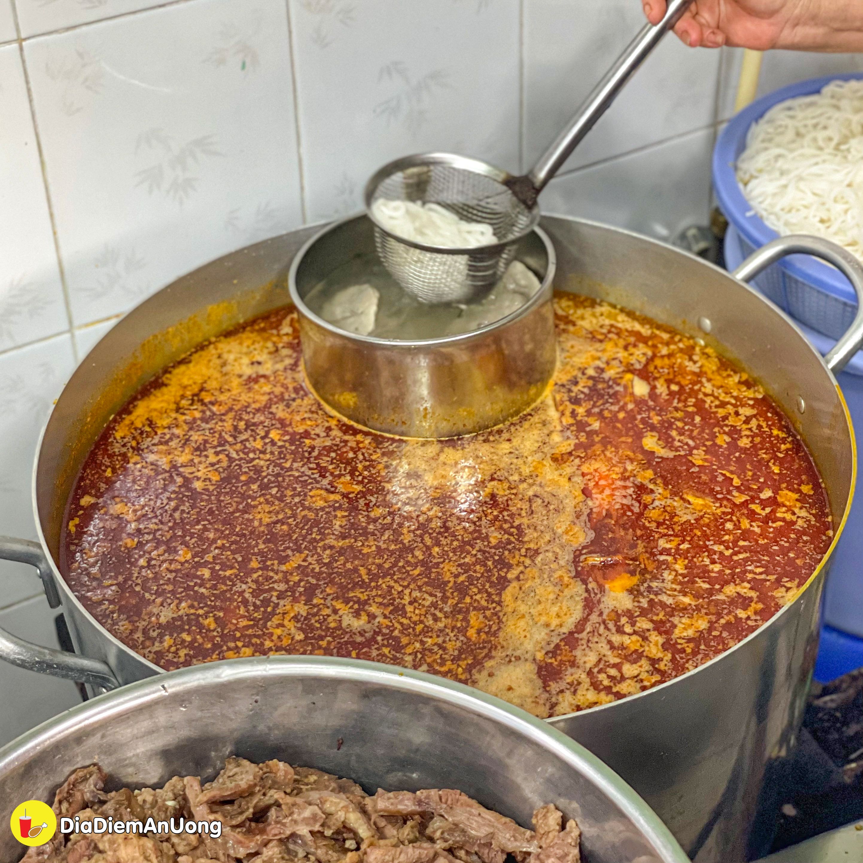 Nước lèo ở đây được nấu rất trong, thơm sả. Điều mình thích là nước lèo sẽ được nấu thanh nhẹ, không đậm mùi ruốc, ai mà gu nước lèo đậm đà chắc sẽ không thích vị của quán đâu nè. Riêng mình thì cực ưng vị nước lèo của cô chủ nấu, ngọt thanh từ các loại thịt bò hầm, thơm của sả và thoang thoảng mùi ruốc Huế, 10 điểm.