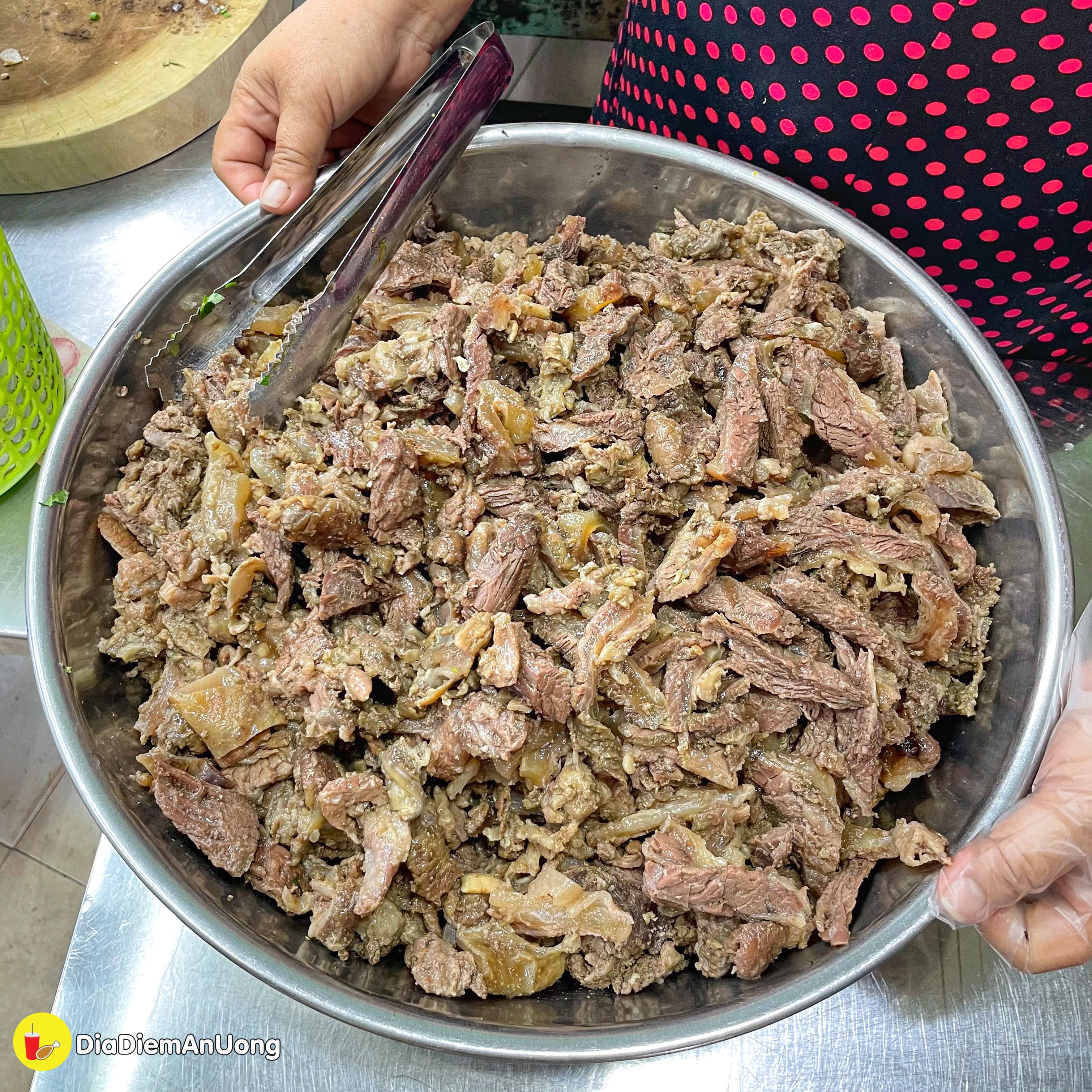 Bò ở đây cô chỉ sử dụng là nạm. tái và gân thôi ăn cùng sẽ có chả cua và chả heo ép. Thịt gân sẽ được cô cắt ra như trong hình nha, đặc biệt là gân bò ở đây sẽ trộn lẫn nạc gân, gân mềm ăn ngon lắm.