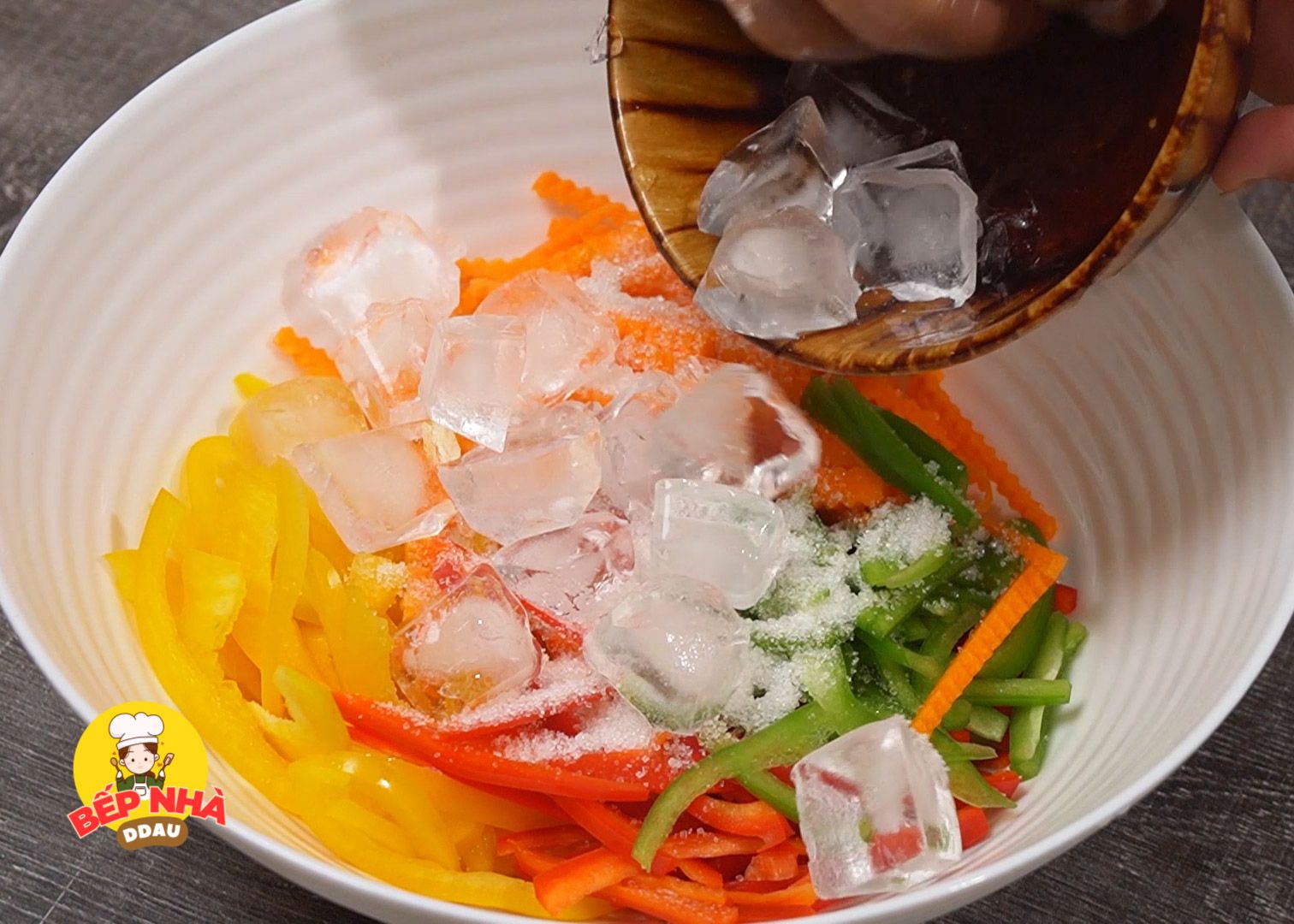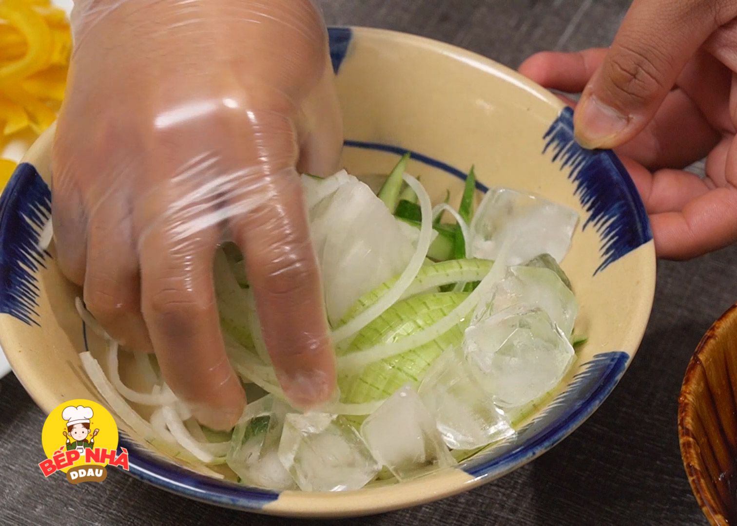 Với hành tây và dưa leo, các bạn ướp với nước đá để khử mùi hăng và 2 loại nguyên liệu này được giòn hơn.