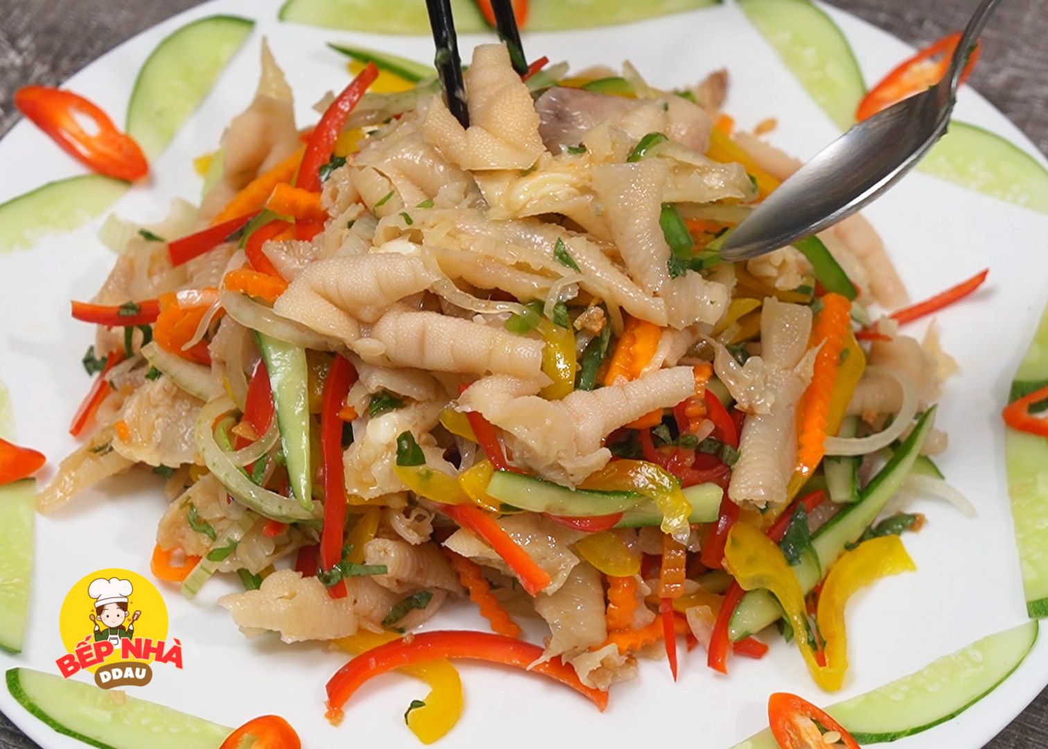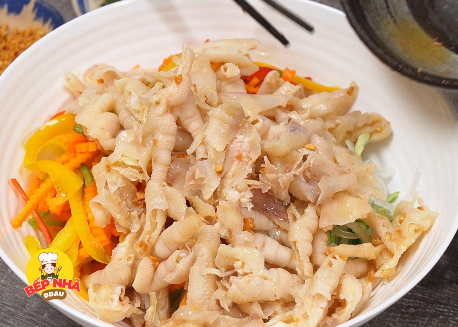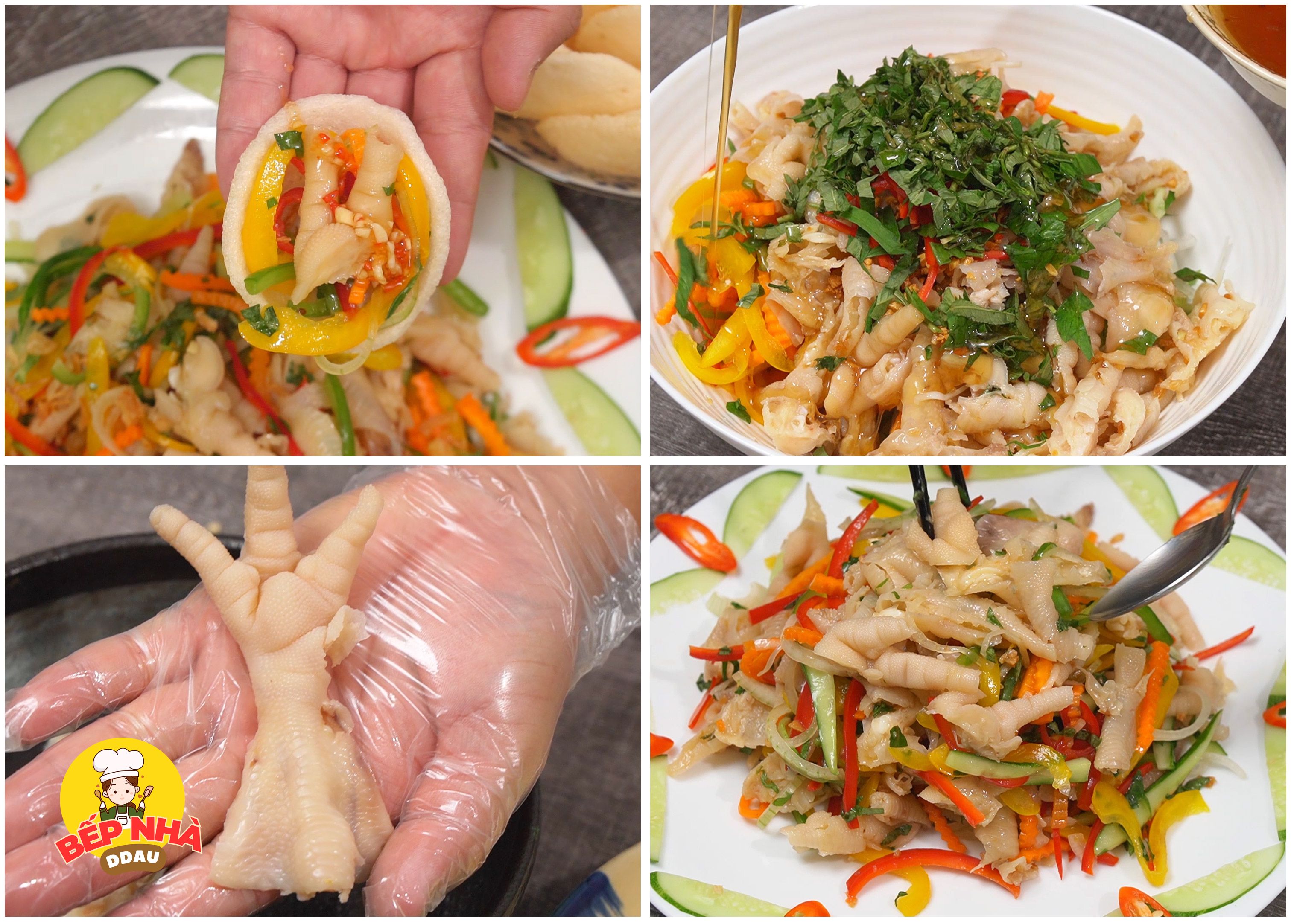 Cuối cùng là các nguyên liệu cũng đã ủ đủ thời gian. Phần ớt chuông, hành tây và dưa leo các bạn sẽ vắt sơ cho sạch nước; Tiếp tục cho chân gà + tỏi phi + ớt cắt sợi + rau răm cắt nhuyễn + 3mc nước tắc + 3mc nước mắm trộn gỏi. Trộn lên cho thật đều và nếm sao cho có vị chua - ngọt - mặn đều nhau.