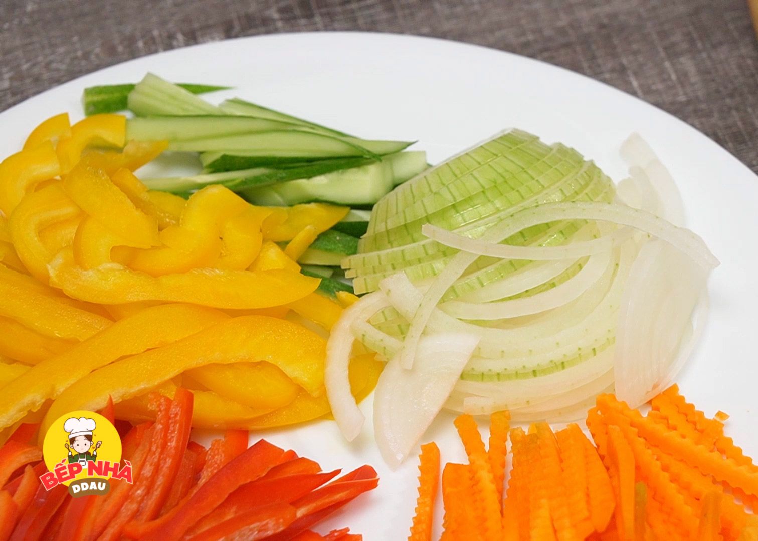 Các loại ớt chuông, hành tây và cà rốt: các bạn cắt thành sợi vừa ăn. Riêng dưa leo sẽ chỉ lấy phần thịt gần vỏ xanh và bỏ phần hột mềm đi, cũng cắt sợi vừa ăn.