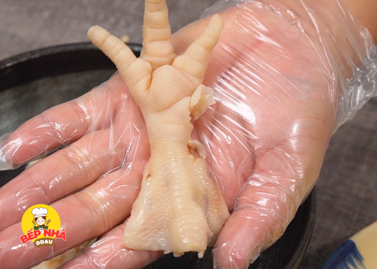 Chân gà sau khi ủ qua đêm trong tủ lạnh lúc này thịt cũng đã chắc lại, chúng ta dùng kéo thật bén lách vào các ngón chân gà và nạy xương ra. Chúng ta làm từng ngón và từ đầu móng trở vào phần lòng bàn chân.