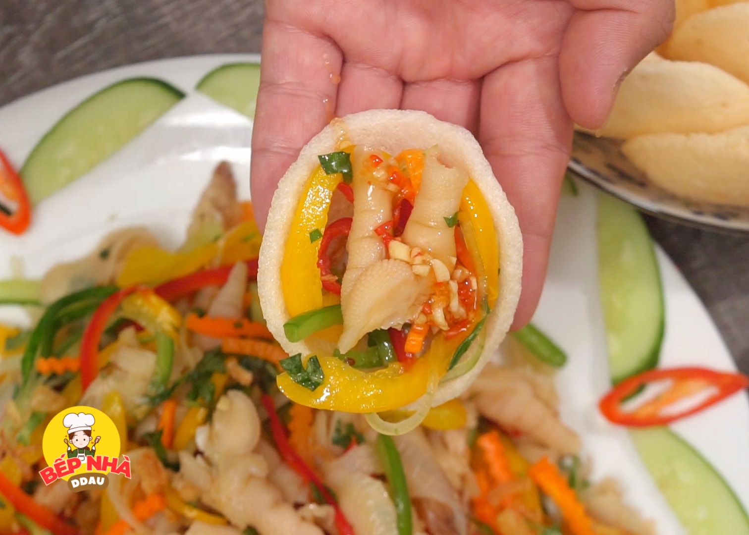 Cuối cùng là cho gỏi ra dĩa đã chuẩn bị, dọn kèm chút nước mắm chua ngọt và bánh phồng tôm.