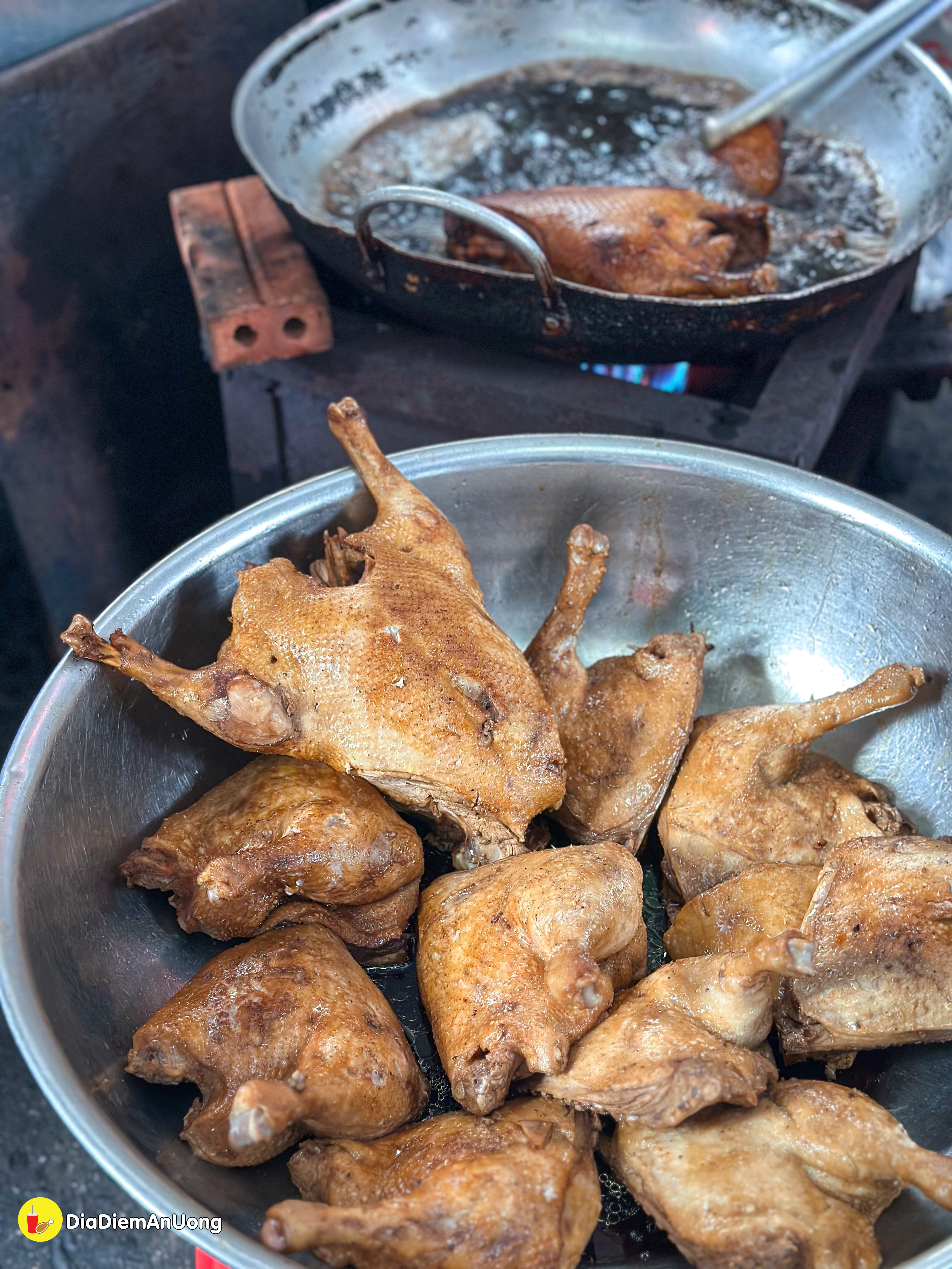 Vịt dày thịt, được luộc chín sau đó mới đem đi ướp với gia vị qua rồi mới đem lên chiên giòn. Mà vịt được chiên nóng liên tục chứ không làm sẵn nên khách đến ăn thịt vẫn nóng hổi. Một điểm trừ là thịt chiên hơi bị cháy một xíu á.