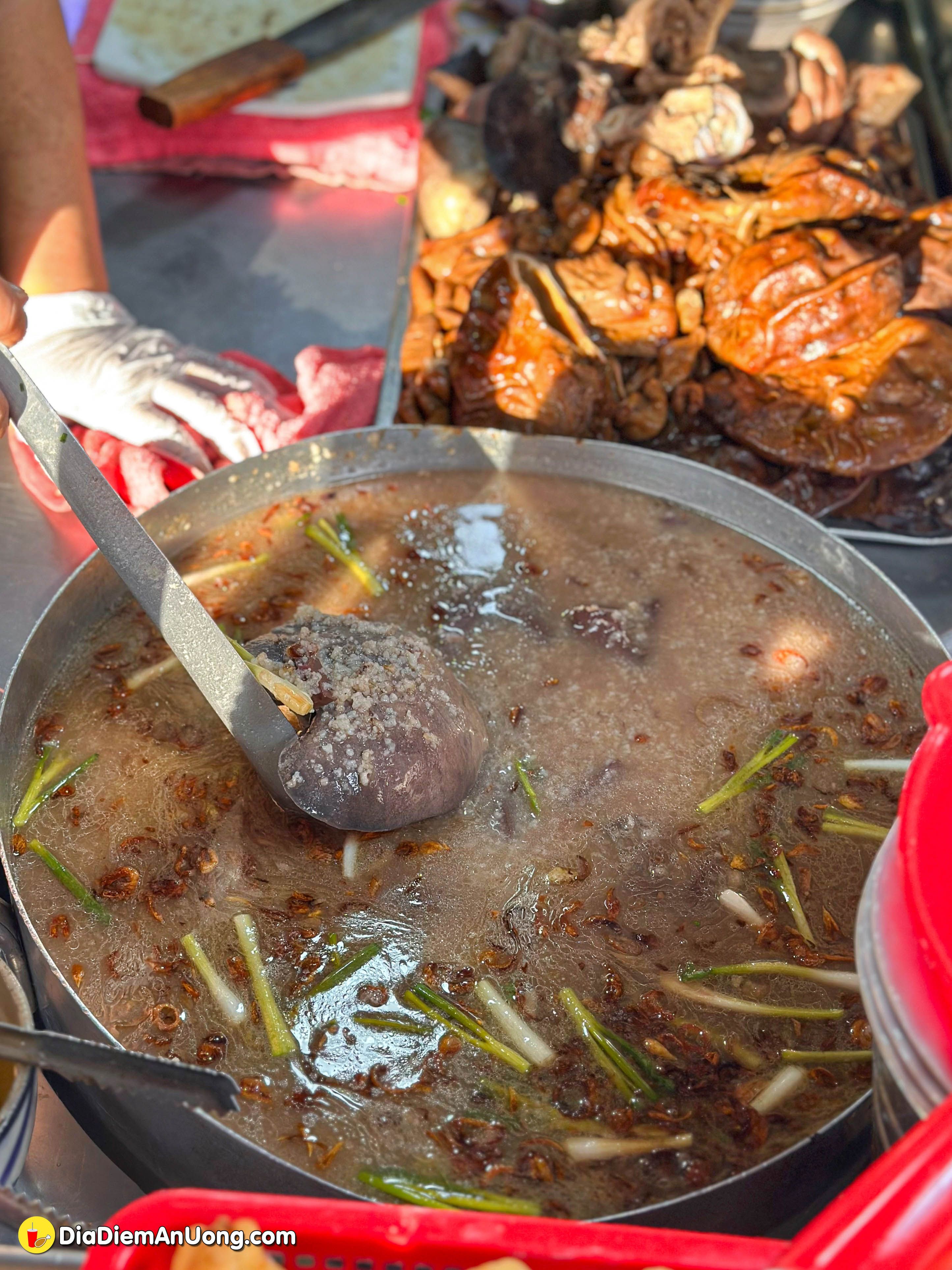 Đây chính là "ngôi sao" của bữa ăn. Thố linh và bao tử được khìa với nước dừa và gia vị, tạo nên màu nâu cánh gián cực kỳ bắt mắt. Món này có độ giòn dai vừa phải, khi nhai sẽ cảm nhận được vị béo béo, ngọt ngọt, thơm mùi khìa đặc trưng. Đây là một sự kết hợp lạ miệng nhưng lại vô cùng hợp với tô cháo.