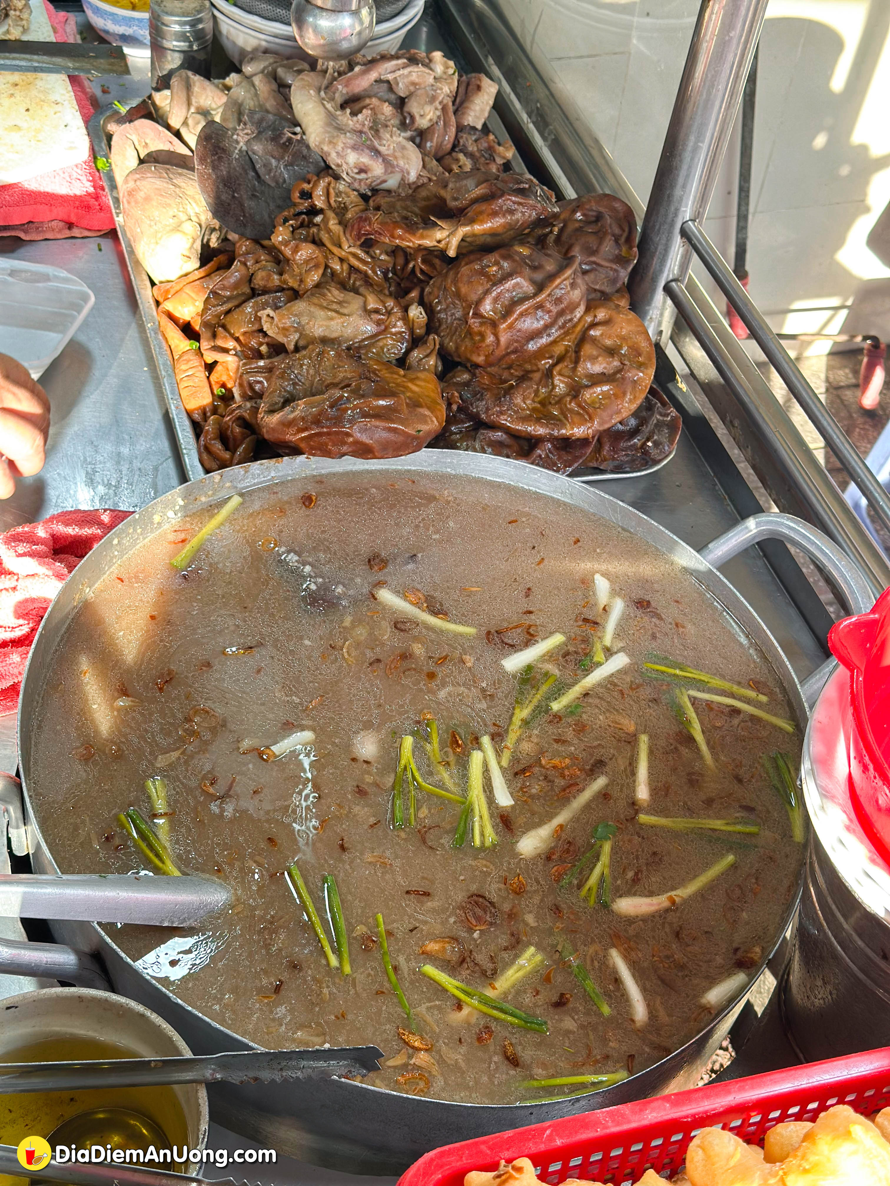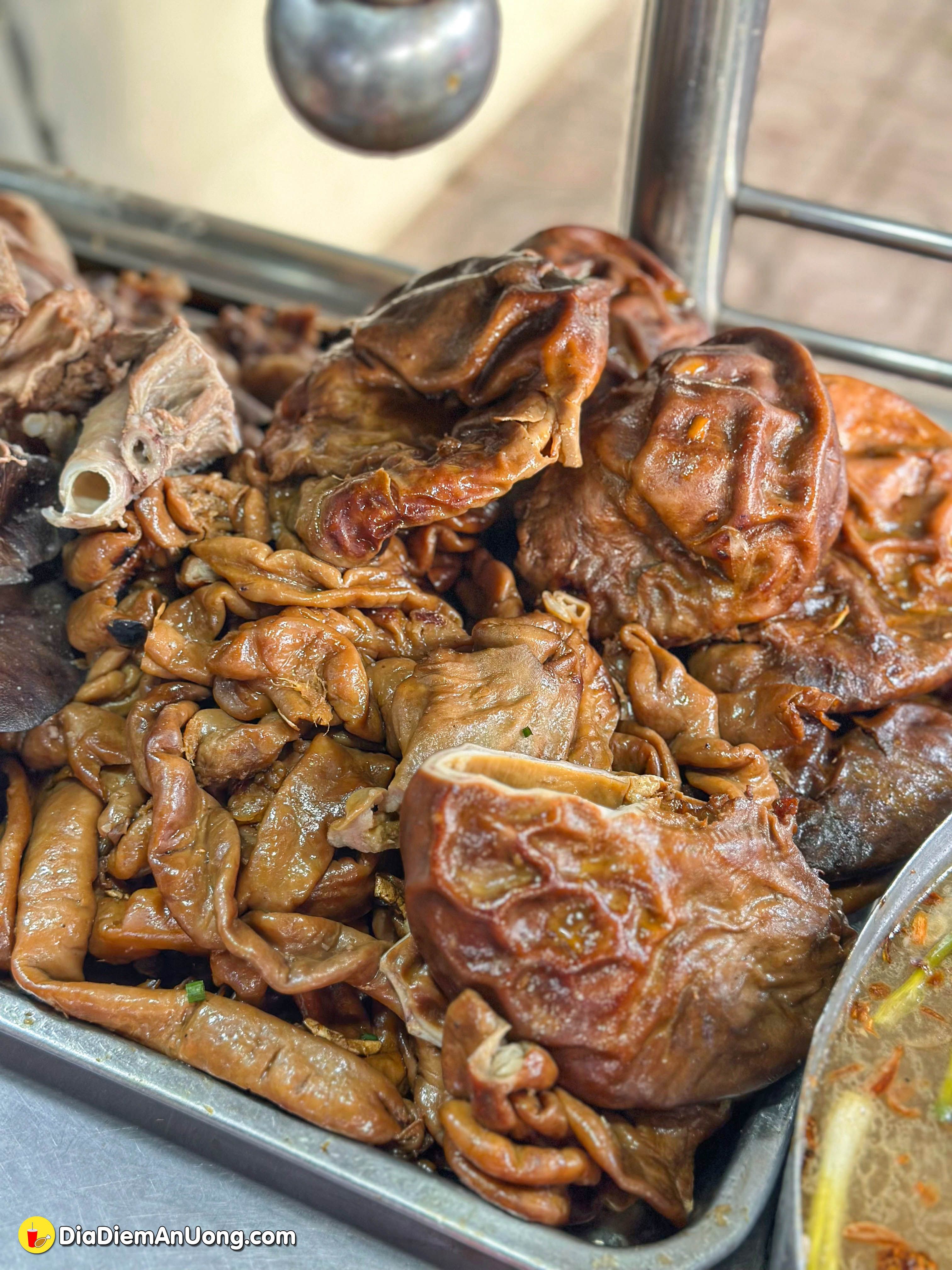 Đến quán, mình "mắt tròn mắt dẹt" với quầy topping được bày biện vô cùng hoành tráng. Ngoài những món quen thuộc như lòng, dồi, gan, tim luộc, điểm nhấn đặc biệt nhất ở đây chính là thố linh, bao tử khìa.