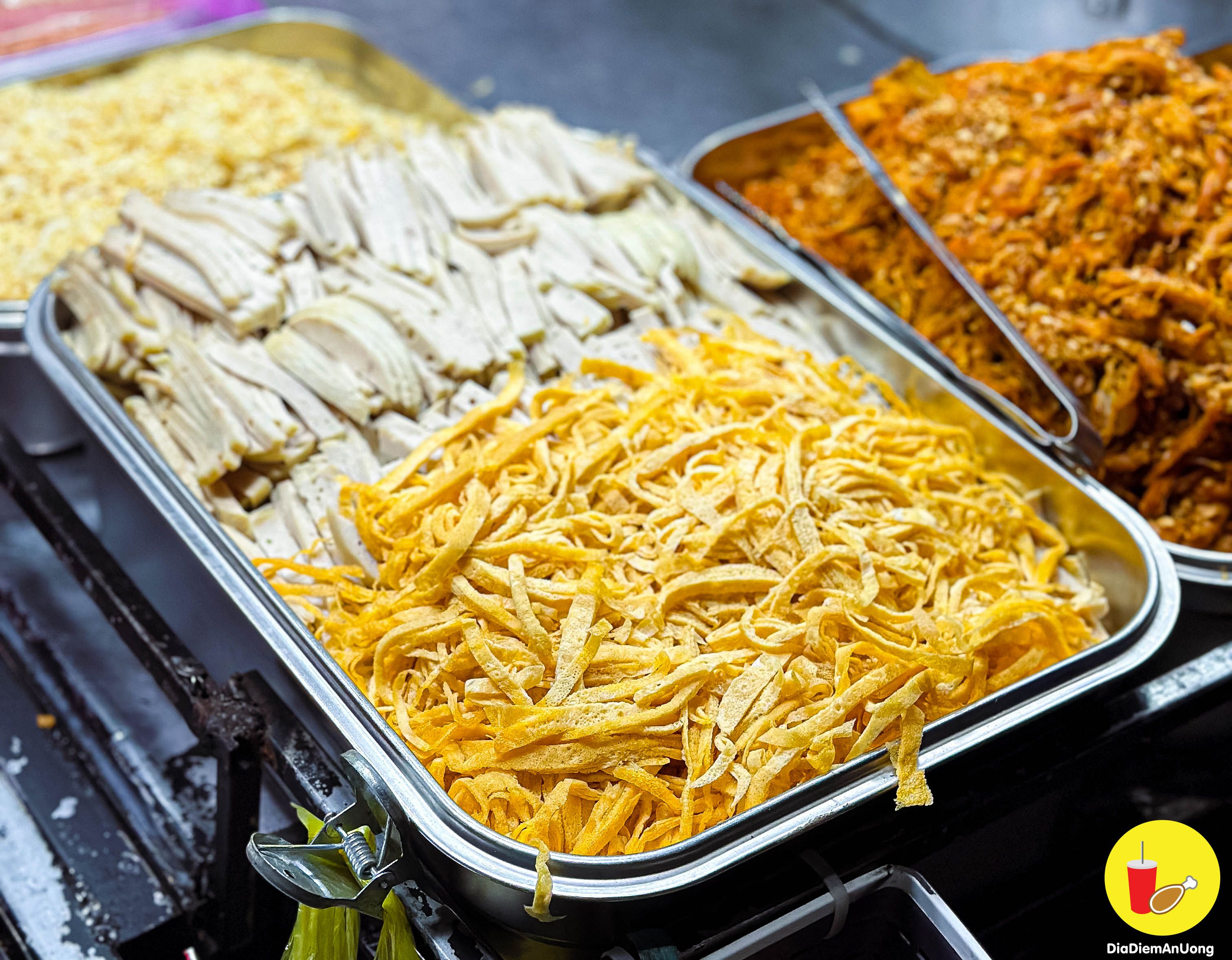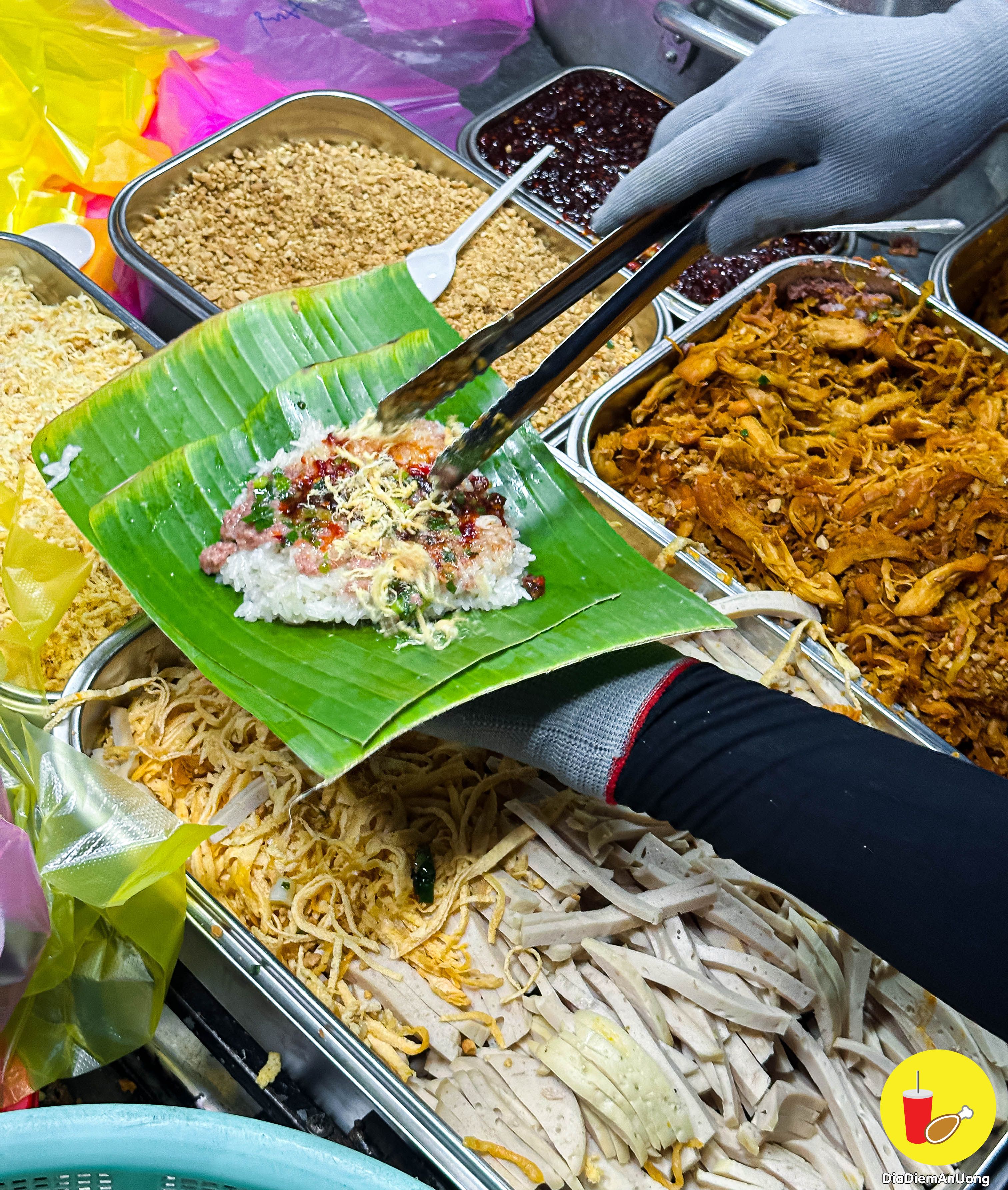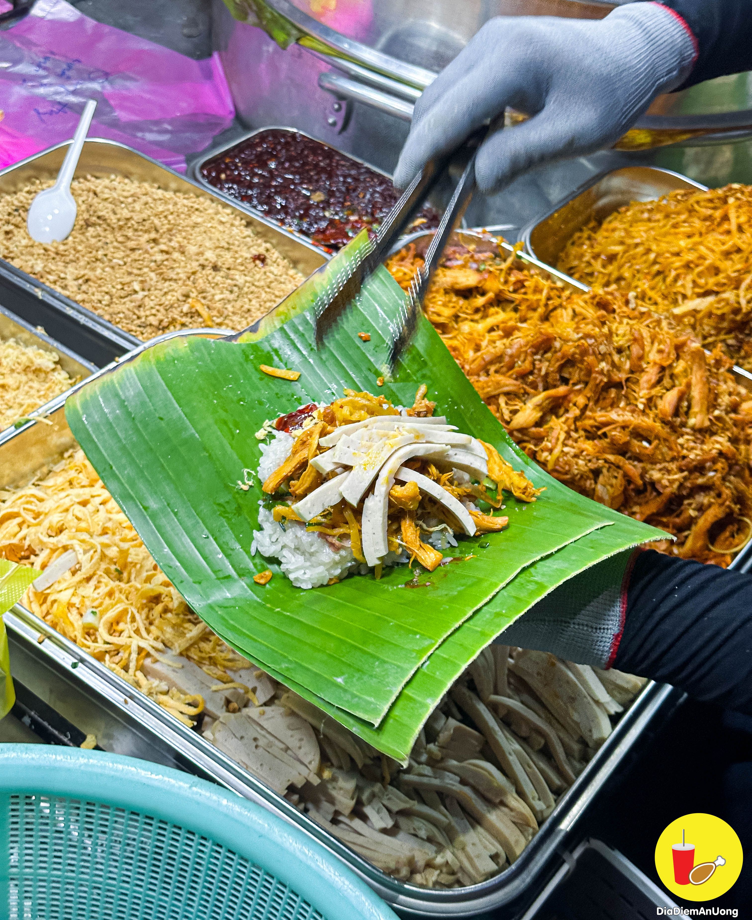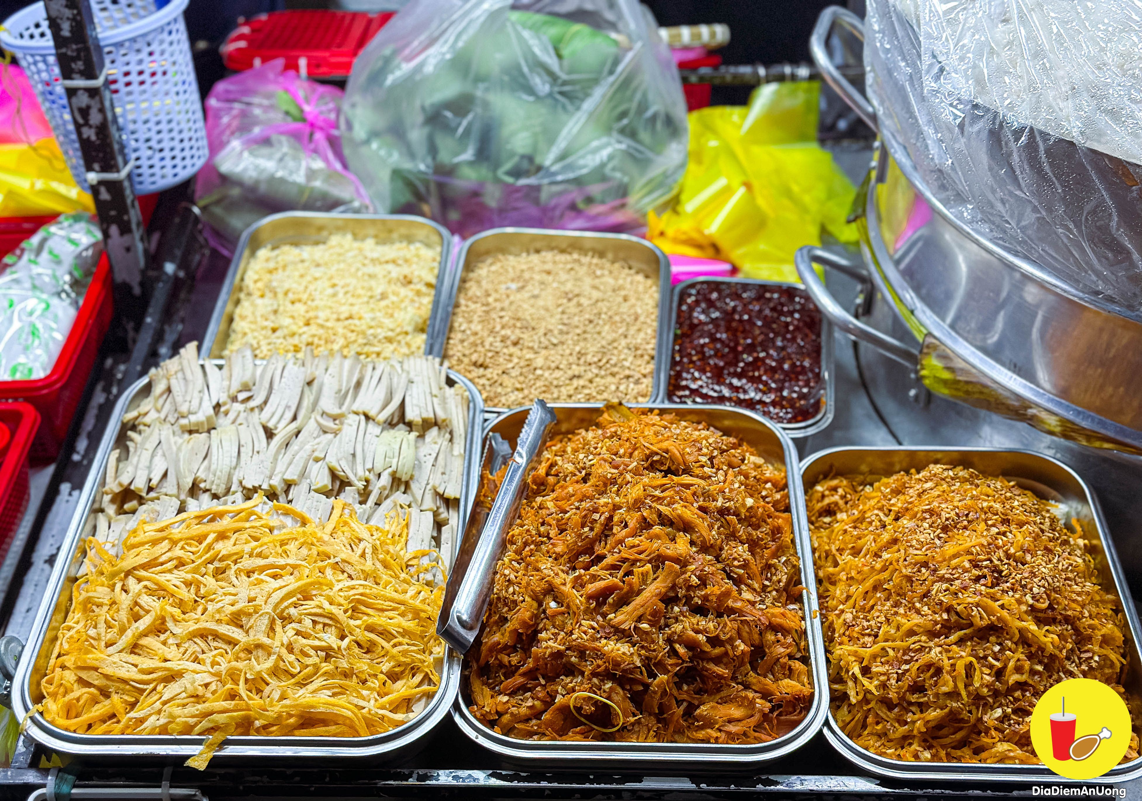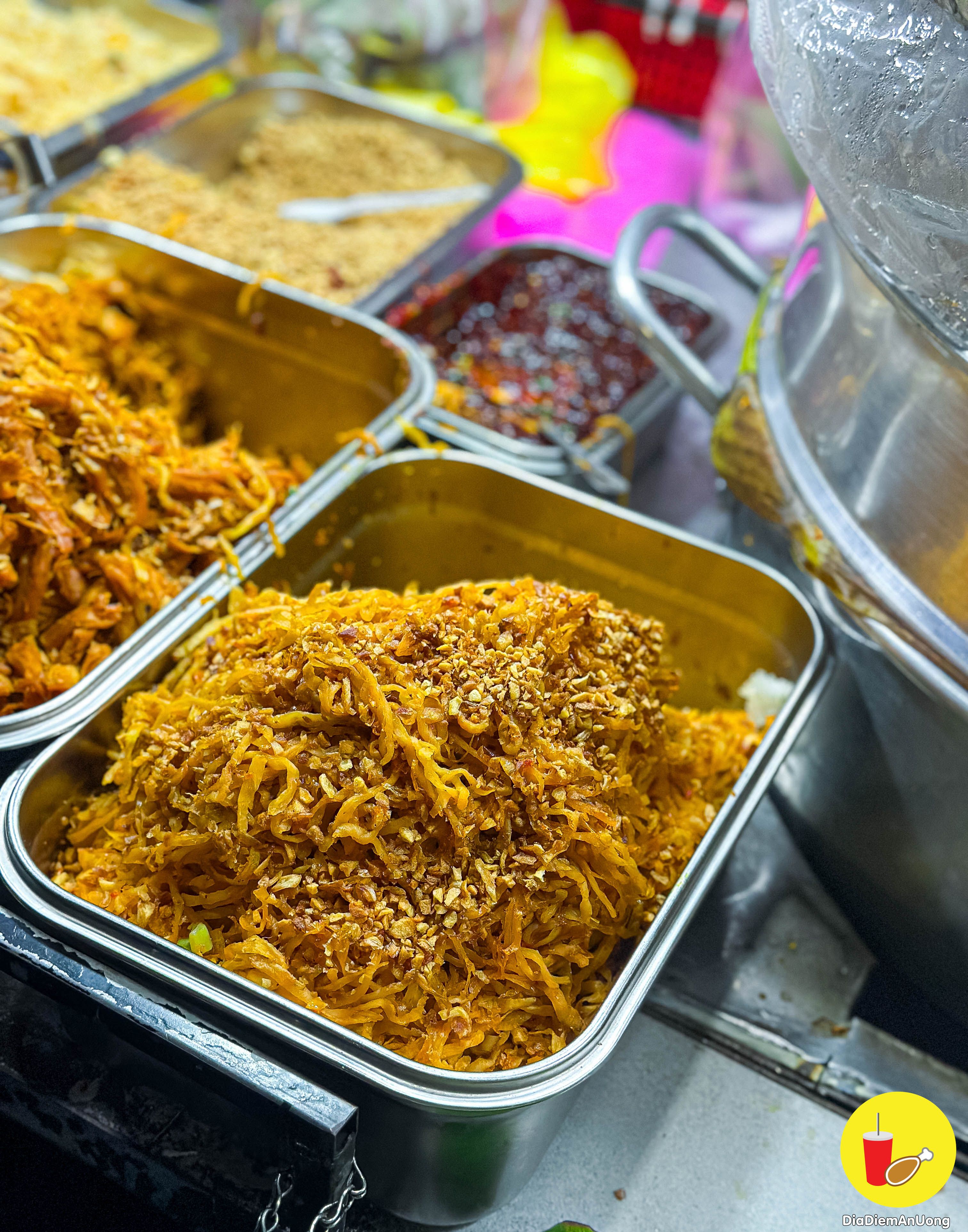 Phần topping xôi mặn đa dạng, có quá chừng loại: từ gà xé, củ cải ngâm, trứng sợi, chà bông, chả, đến ớt rim,… cũng đều do quán tự tay làm.