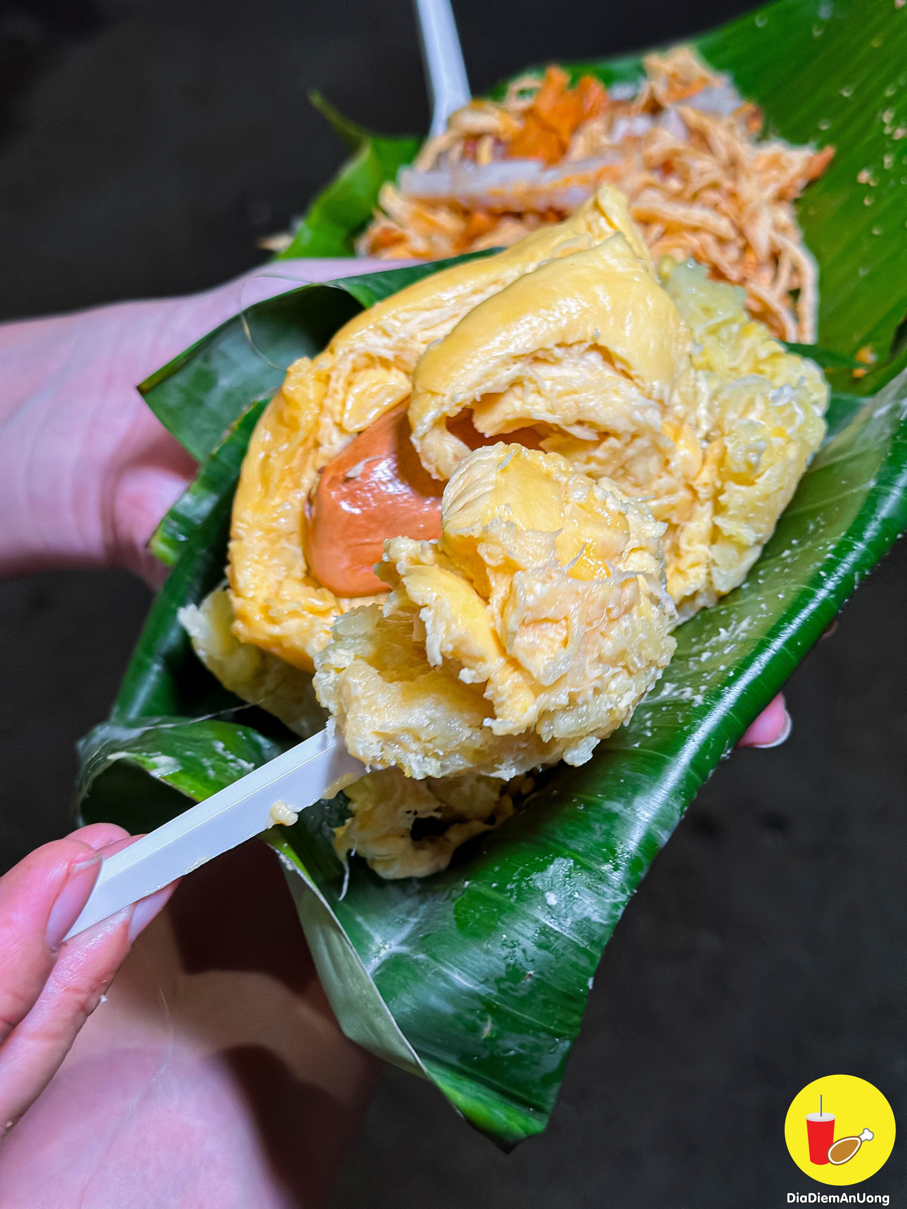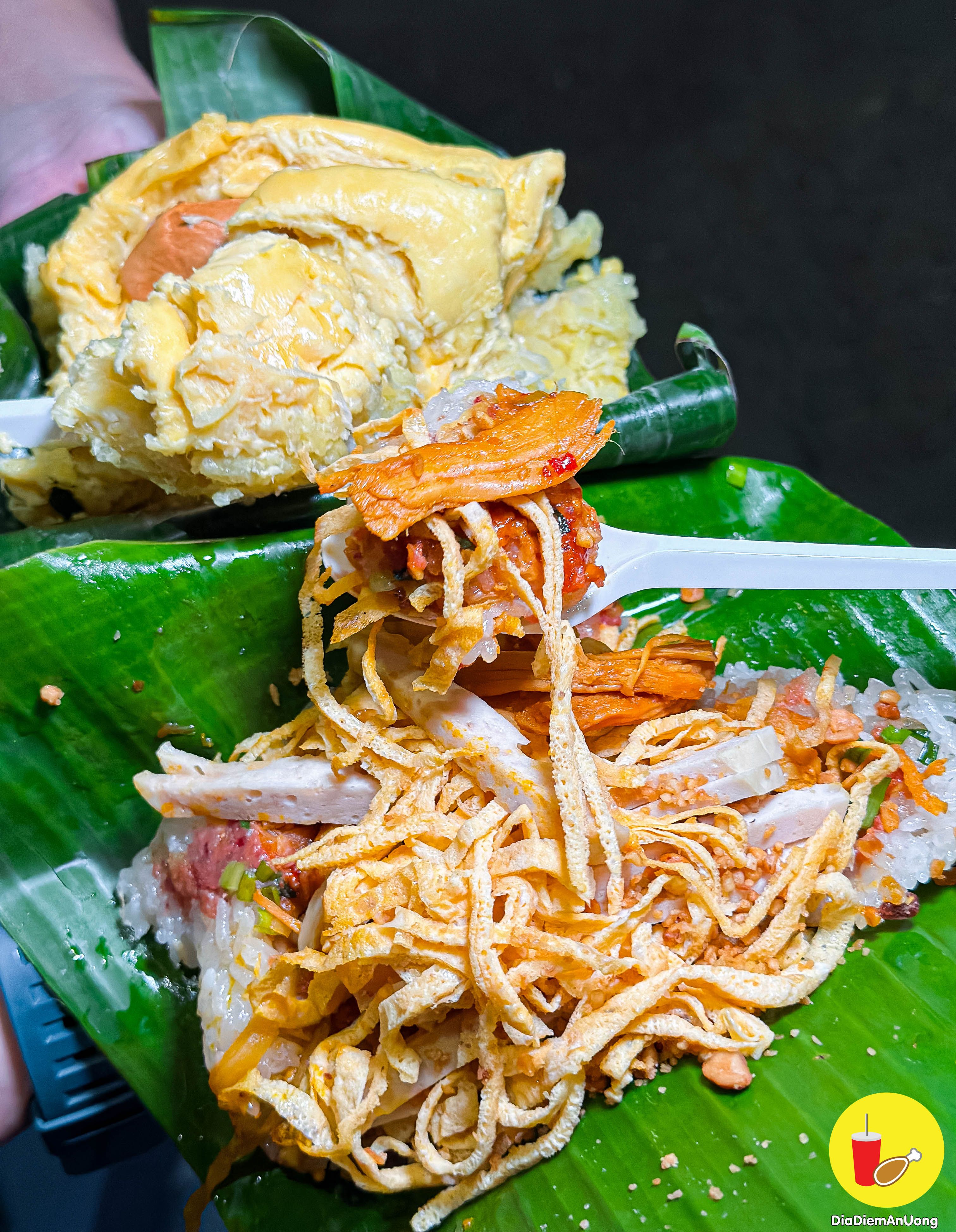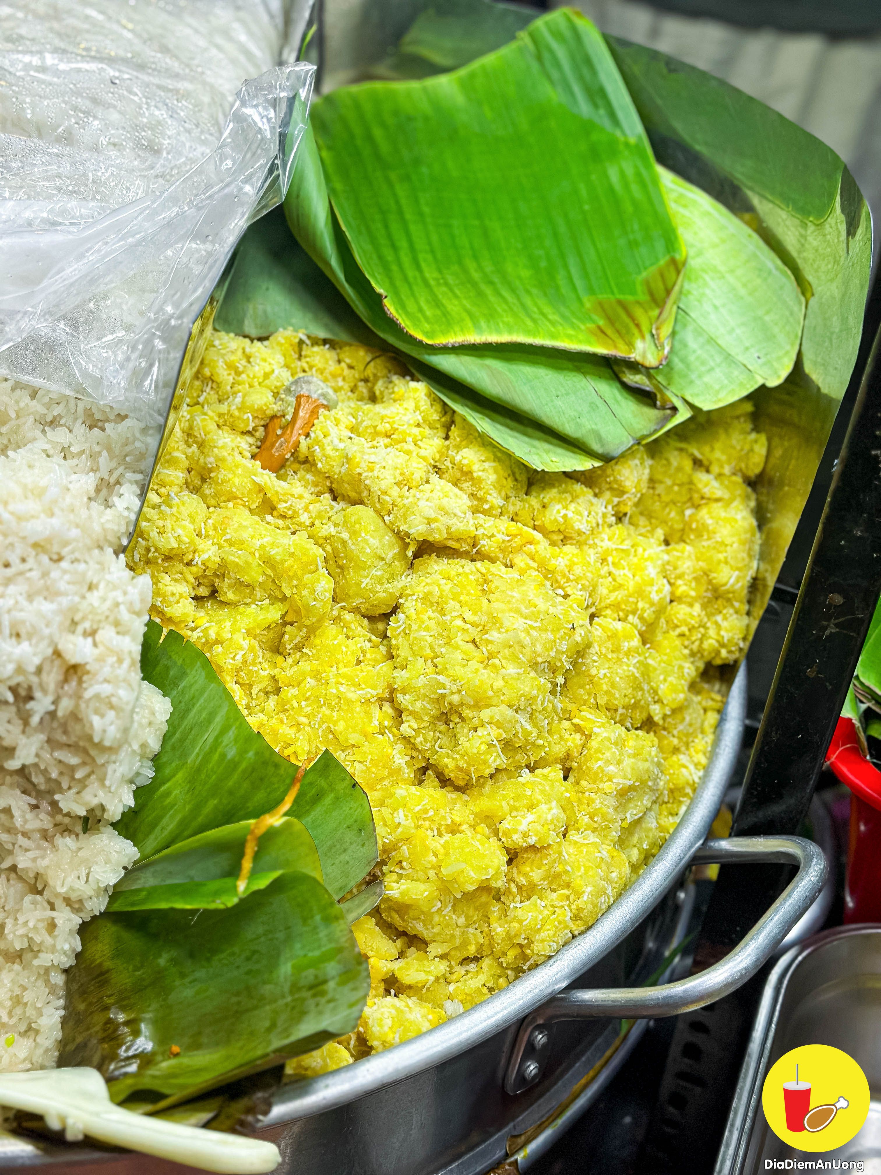 Lớp xôi vò dẻo hột, vị ngọt dịu, bên trong vừa có đậu xanh mà còn có thêm cơm sầu riêng vừa phải, luôn được giữ nóng hổi xong gói thêm lá chuối nữa nên càng làm tăng thêm vị thơm ngon.