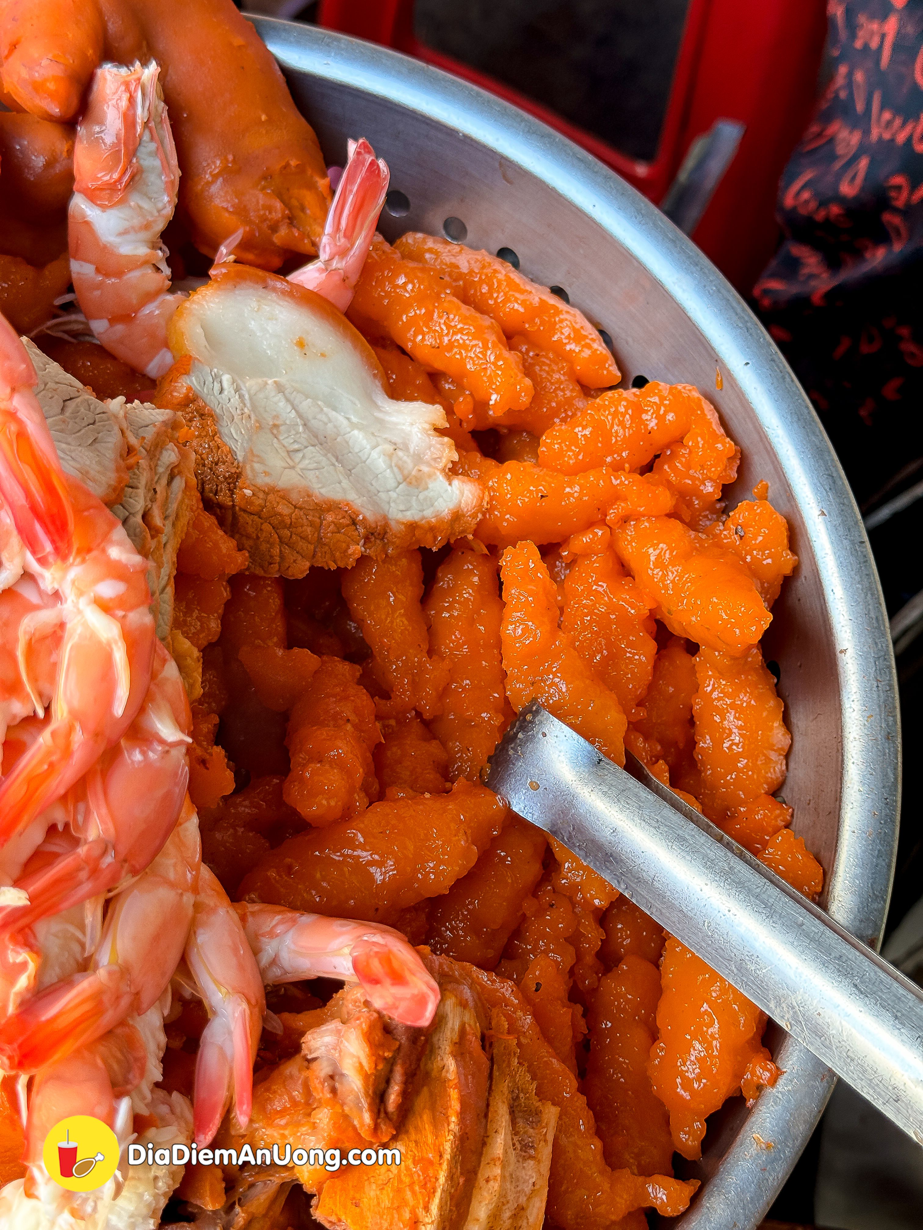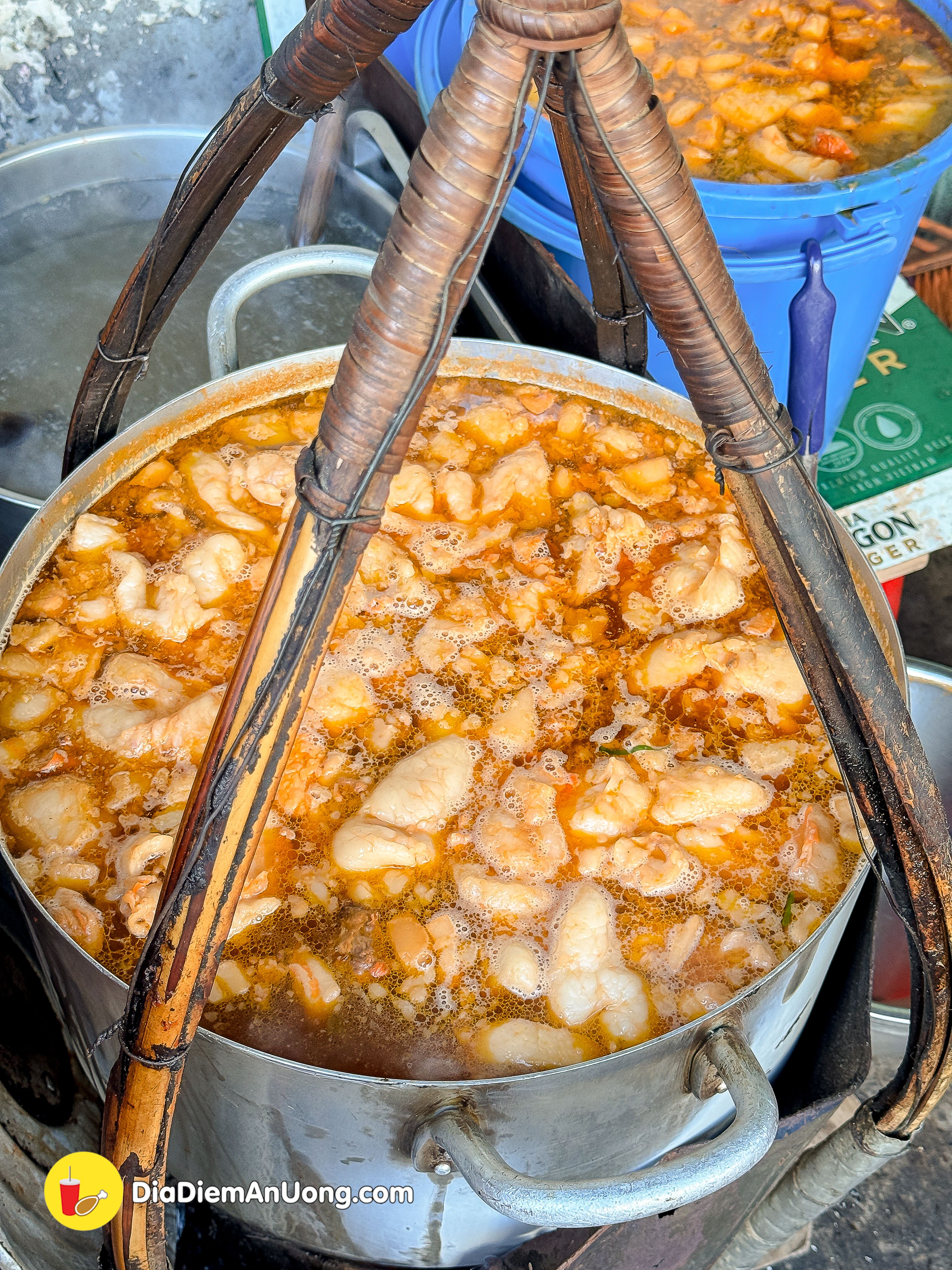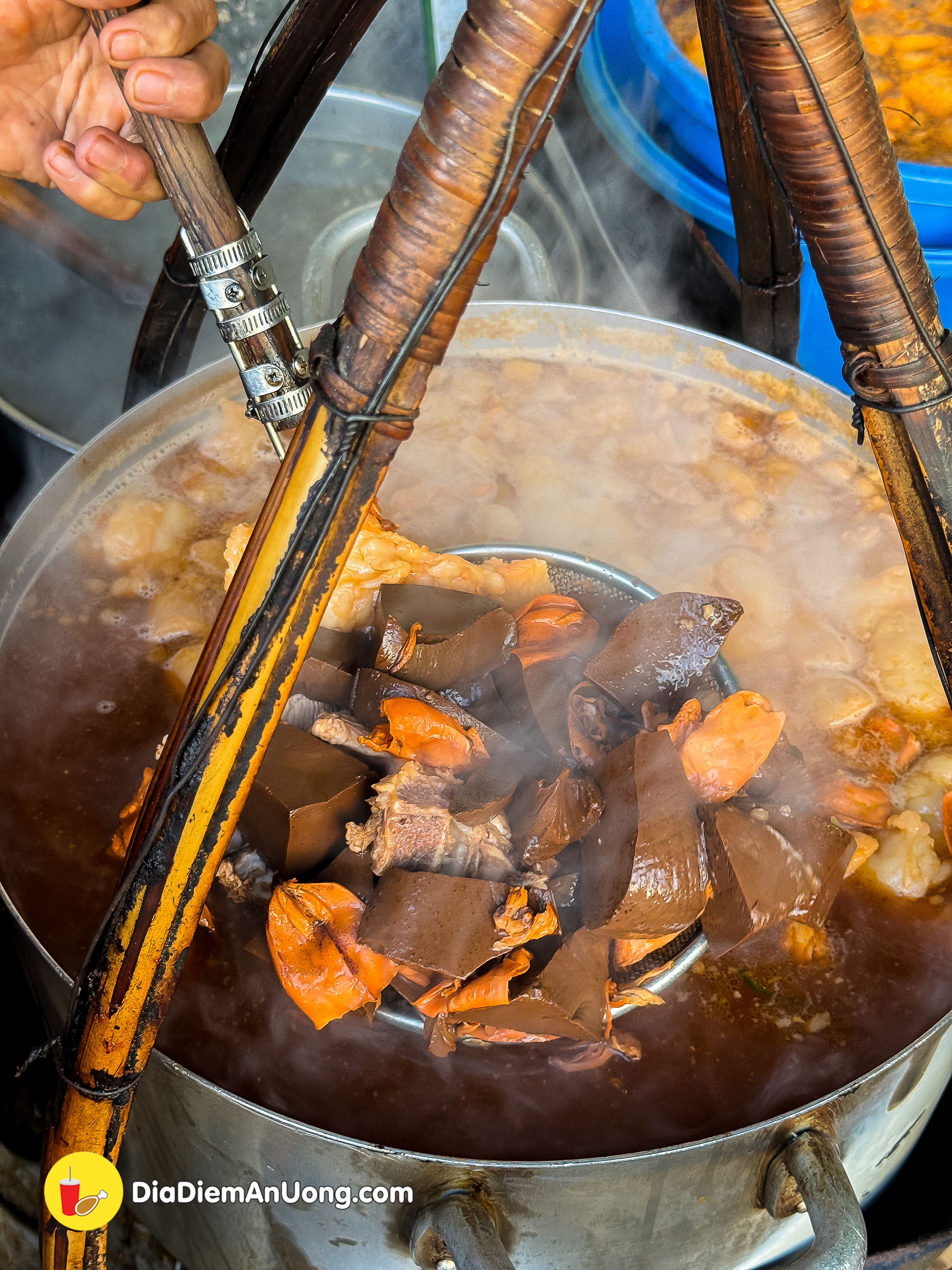 Nồi nước lèo này được nấu chủ yếu từ mực khô cùng với xương, như mấy bồ thấy thì trong nồi này không những có xương, khô mực, huyết mà còn có cả mỡ nổi rất là ngon. Cái này thì ai ăn người bán mới bán, mà mở nổi thì được cho miễn phí cùng bún, rau thêm luôn nè.