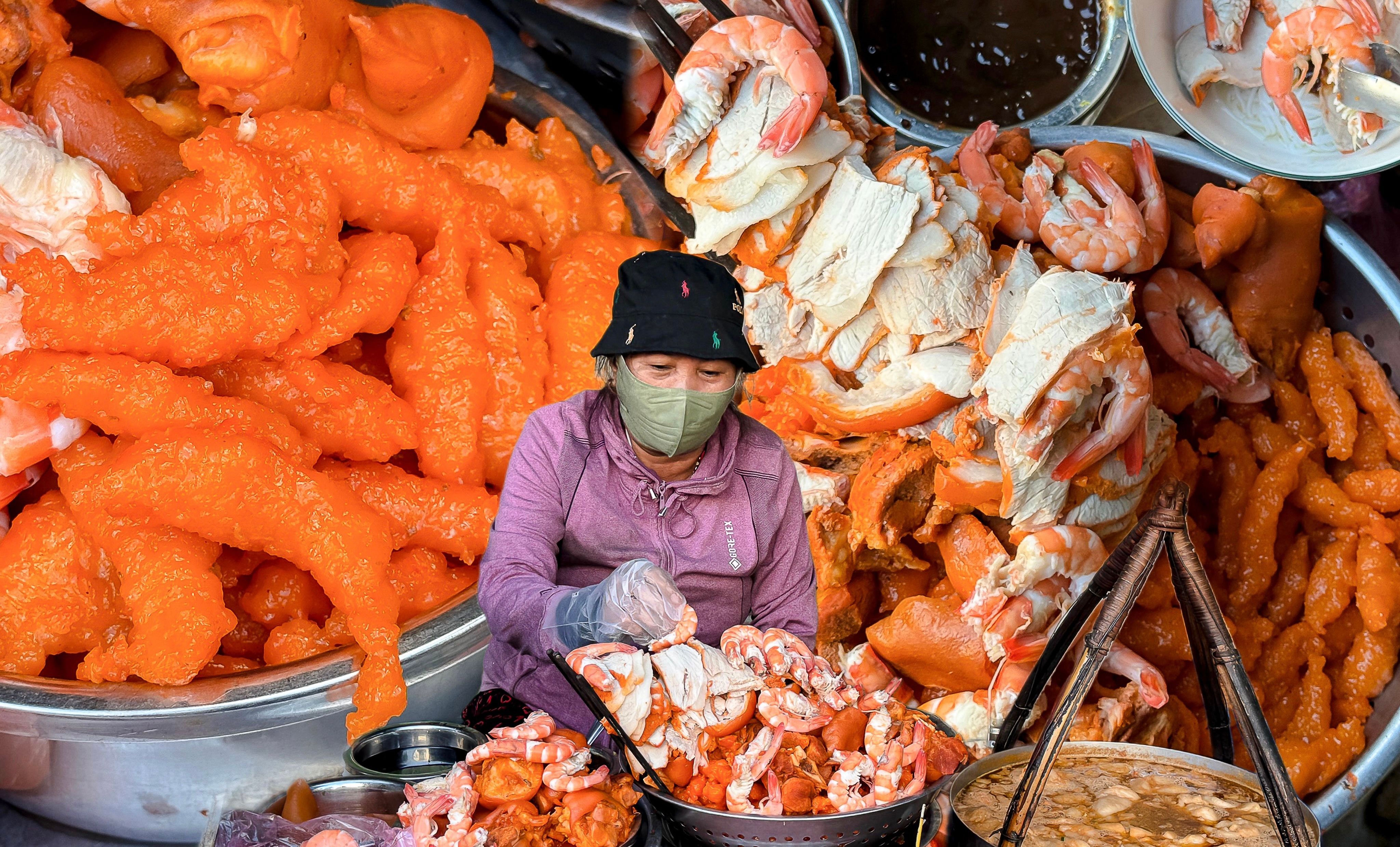 Gánh Bún Suông vỉa hè đông có tiếng Quận 4 hào sảng miễn phí, bún,rau,tóp mỡ thêm