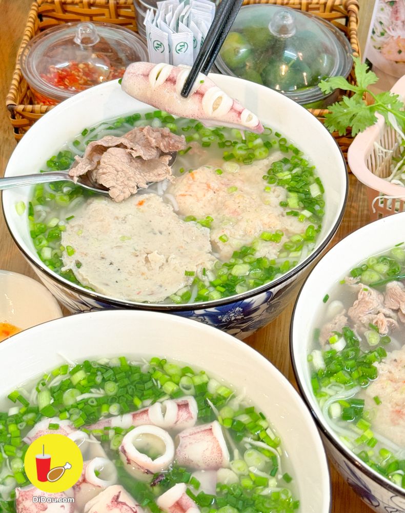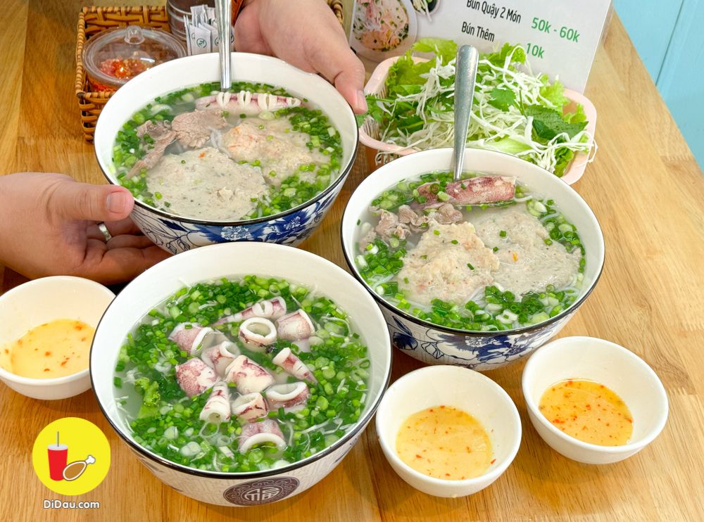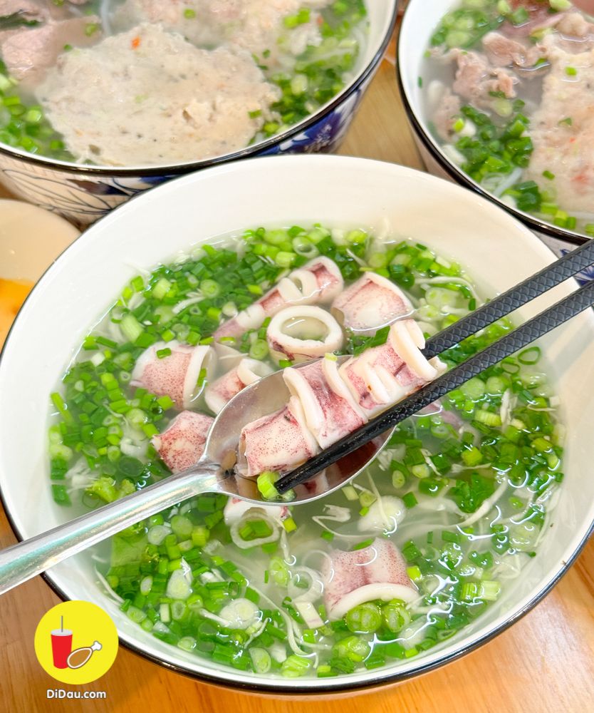 Menu đa dạng, mà gọi ít món thì ăn không đã nên tui order Bát Đầy Đủ có Mực, Chả Cá, Chả Tôm và Thịt Bò. Ngoài ra order thêm Bát Mực Ống nóng hổi. Nước dùng ngọt thanh, hoàn toàn không có bột ngọt đâu mấy bồ ạ, tui cam đoan luôn vì tui bị dị ứng nhưng qua đây ăn mà vẫn có thể phơi phới đánh chén hết mà.