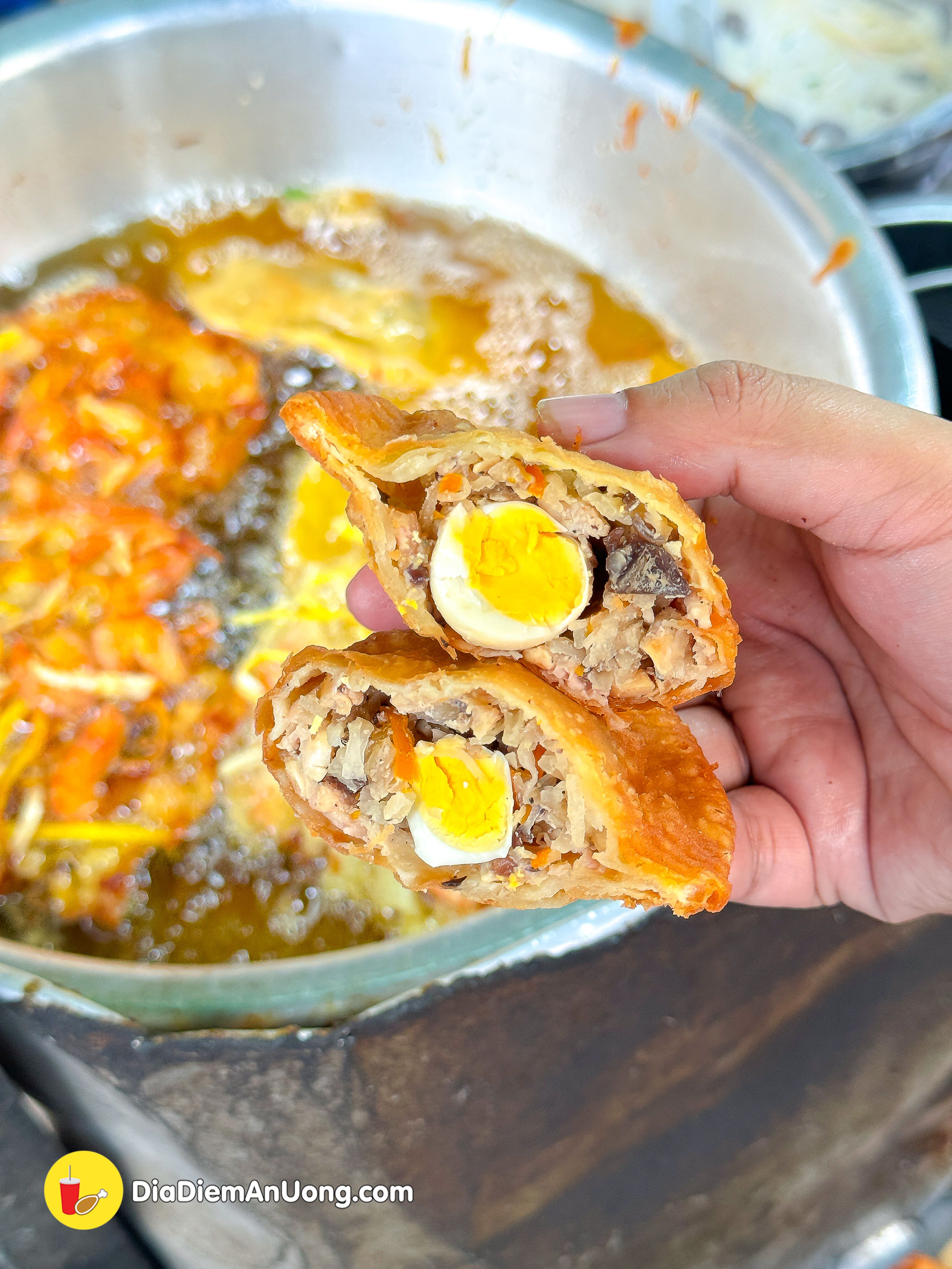 Tiếp đến là món Bánh Quai Vạc bao gồm trứng cút, thịt bằm và rau củ. Ở đây người ta chiên sơ trước cho săn lại, khi nào có khách tới chỉ cần chiên thêm lần nữa đảm bảo món ăn nóng hổi vừa thổi vừa ăn luôn nhen.