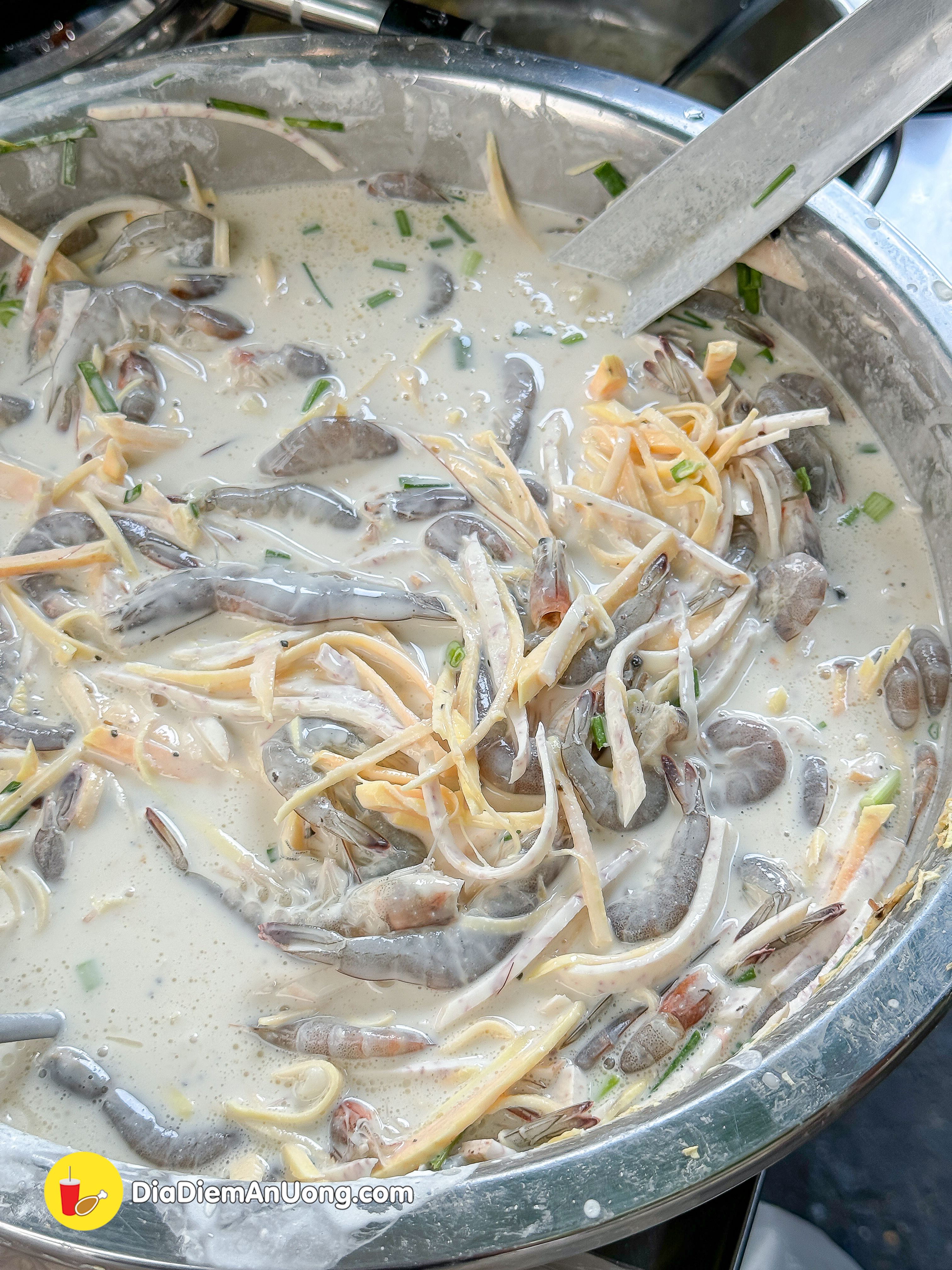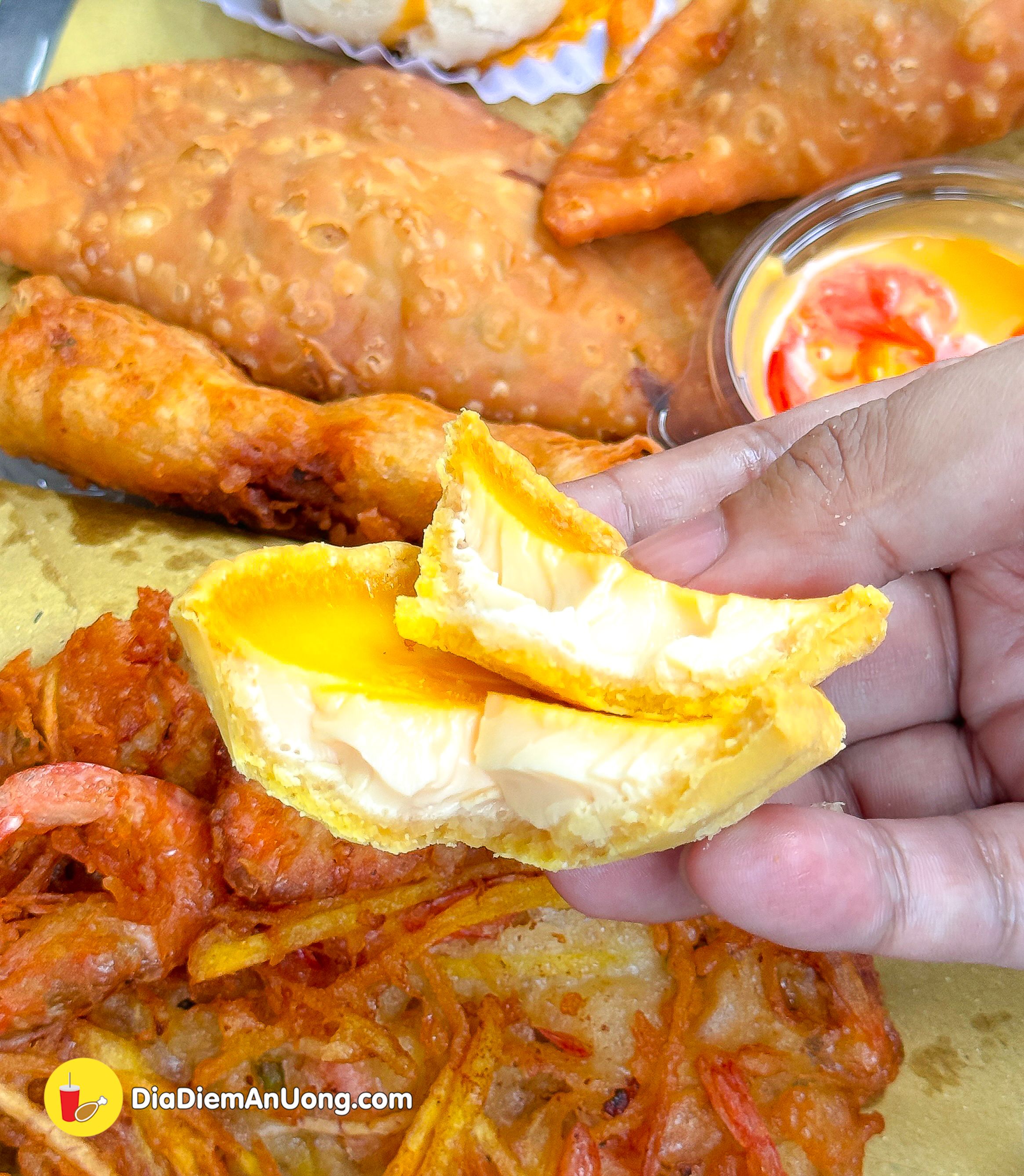 Lớp vỏ bên ngoài được áo một màu vàng giòn trông rất đẹp mắt, phần khoai thì giòn tan, phần bột béo thơm ngon và những con tôm ngọt thịt chất lượng.