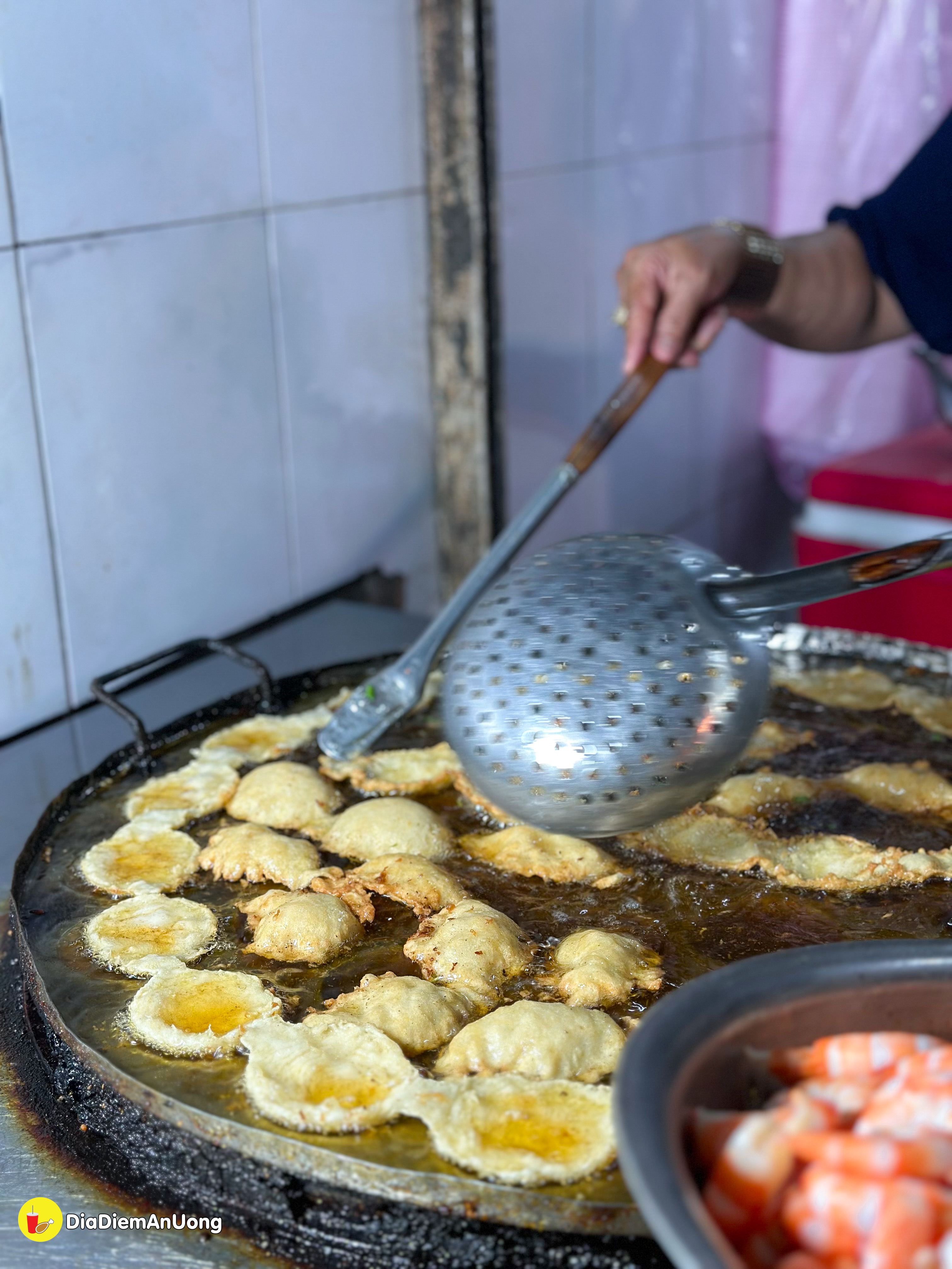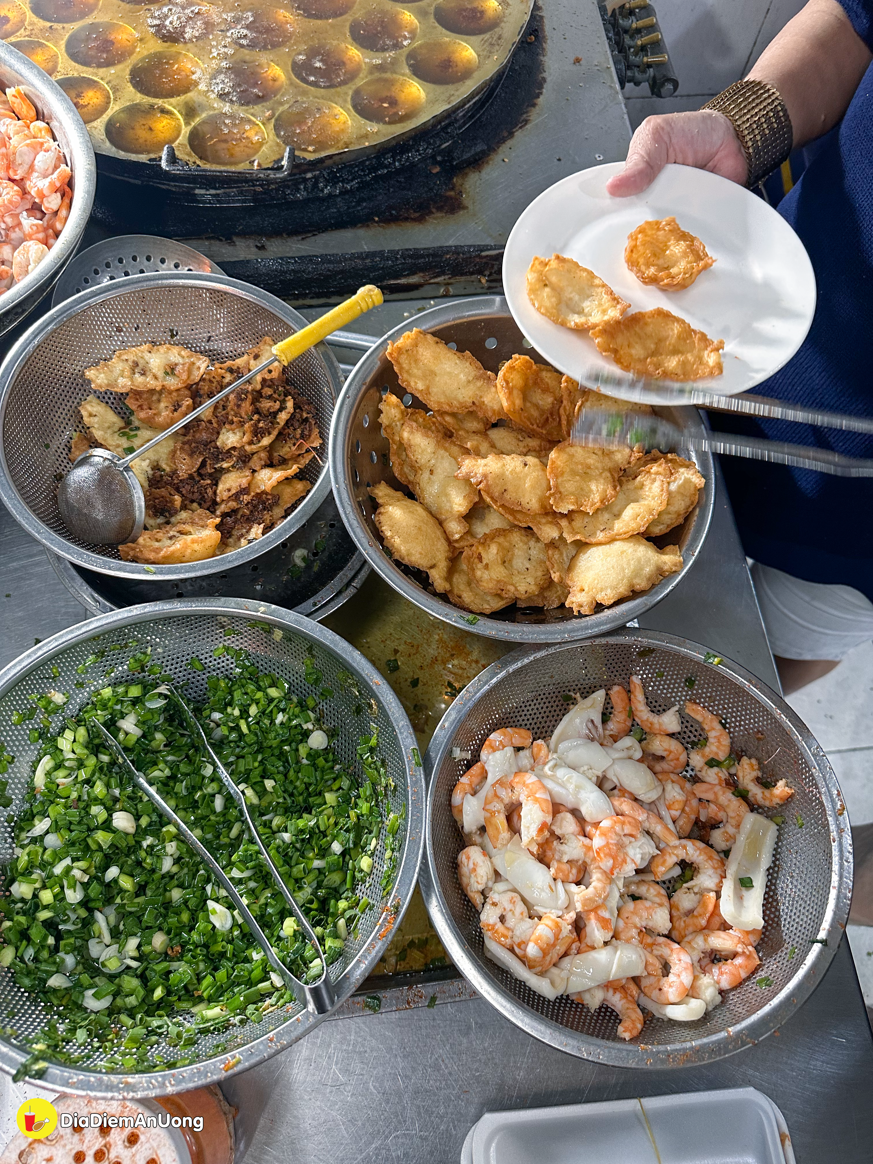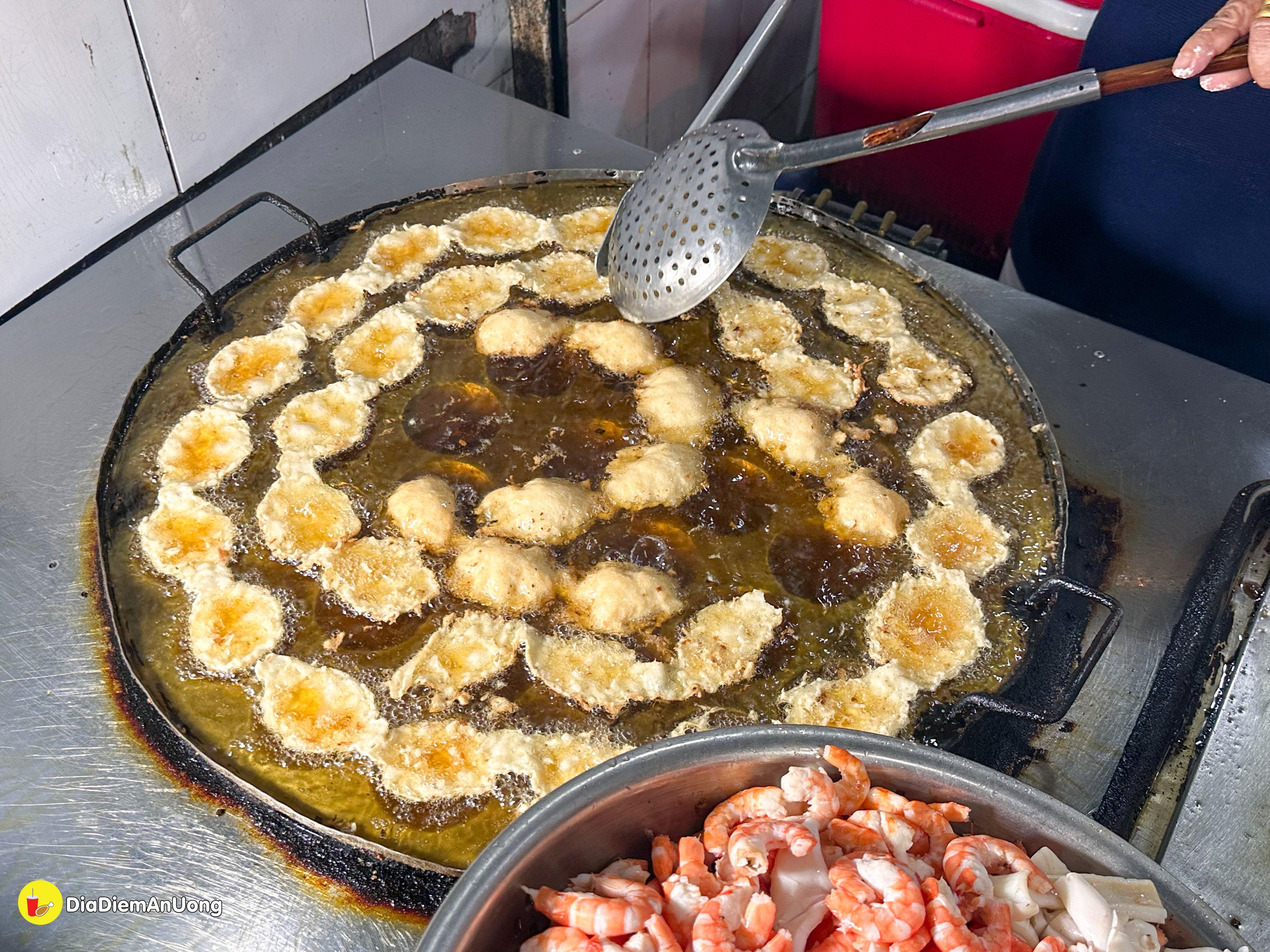 Quán nổi bật với món bánh khọt tôm mực vô cùng hấp dẫn, vào quán sẽ bị thu hút ngay bởi chảo chiên bánh to đùng, bánh được chiên ngập dầu, giòn rụm thích lắm.