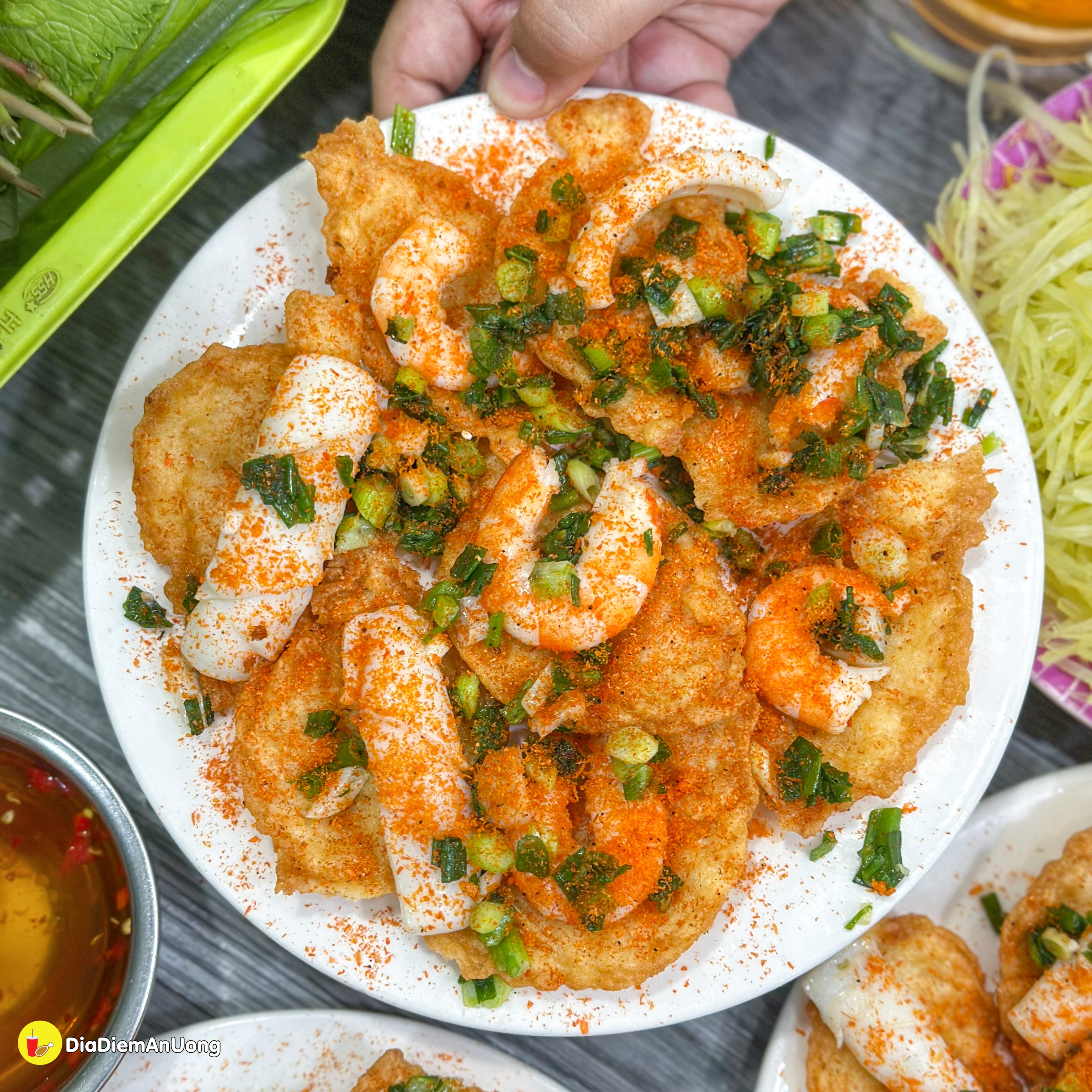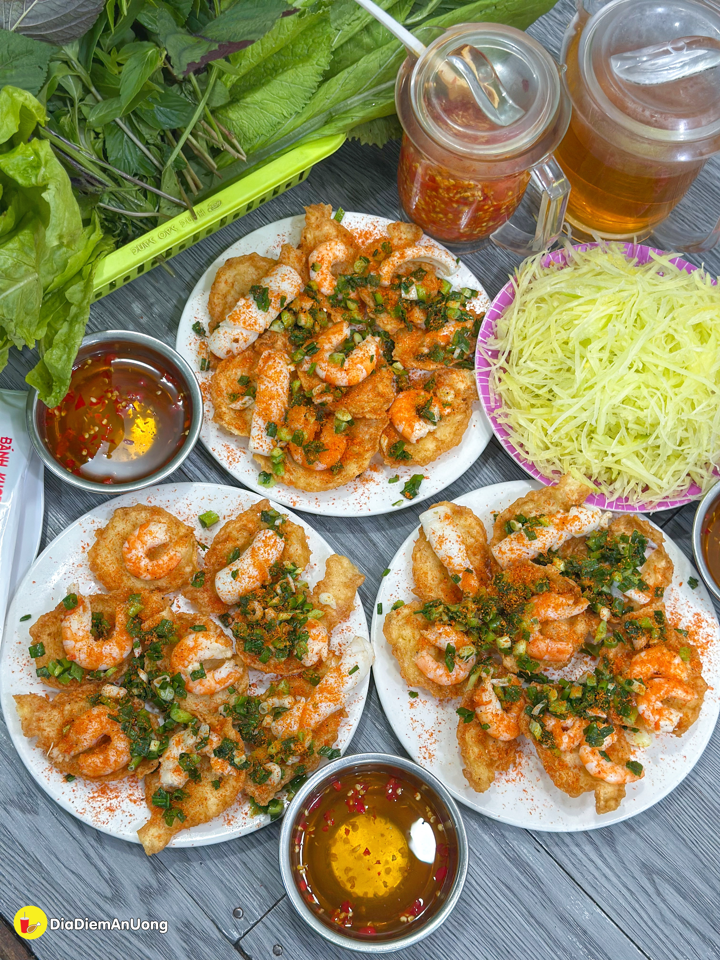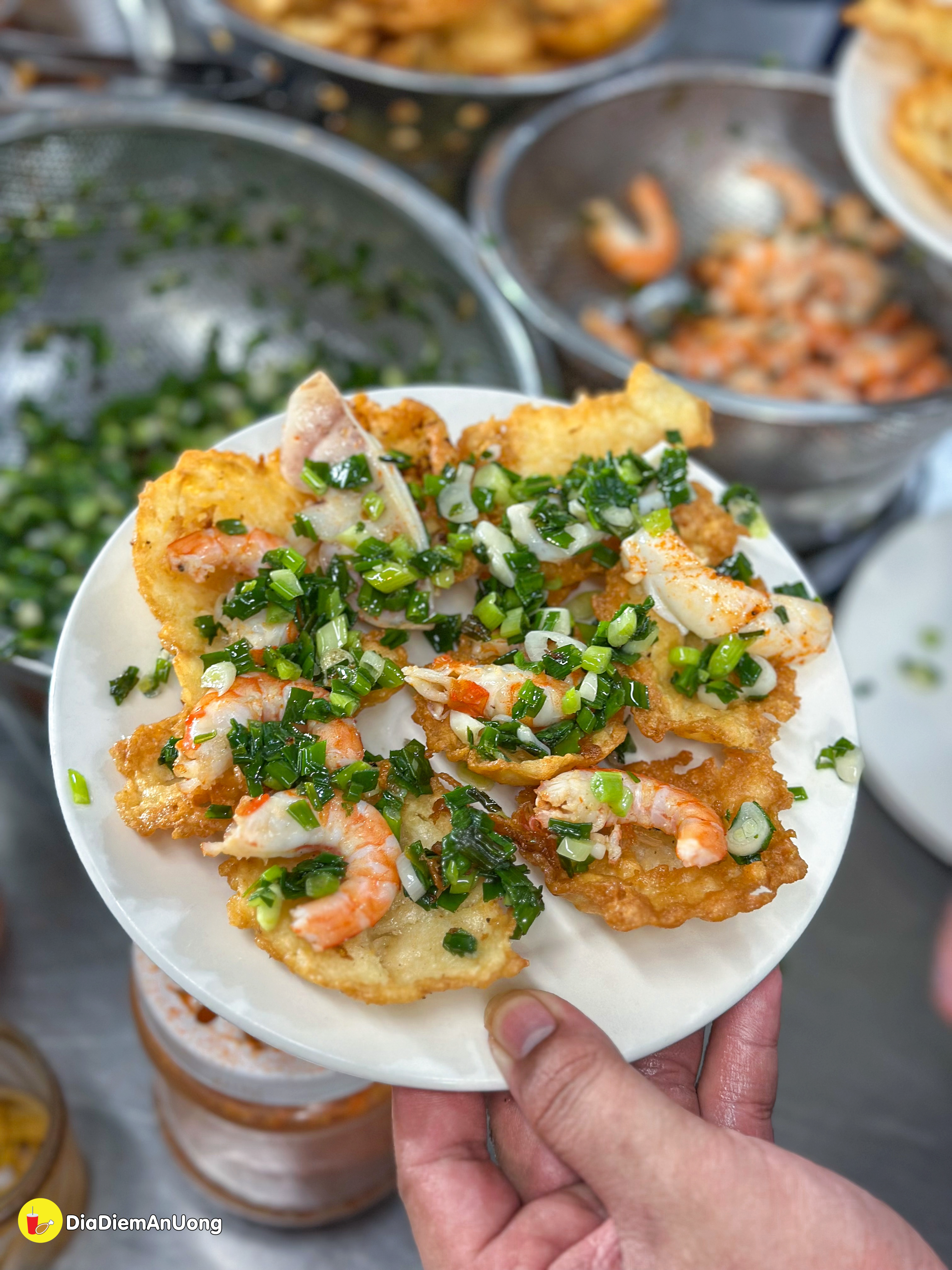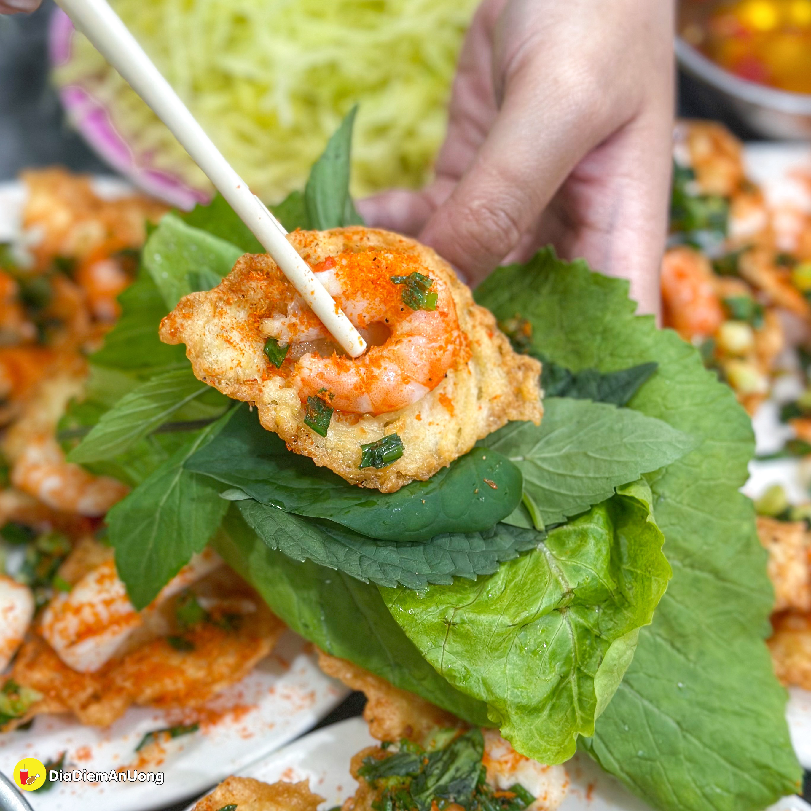 Quán nổi bật với món bánh khọt tôm mực vô cùng hấp dẫn, vào quán sẽ bị thu hút ngay bởi chảo chiên bánh to đùng, bánh được chiên ngập dầu, giòn rụm thích lắm.