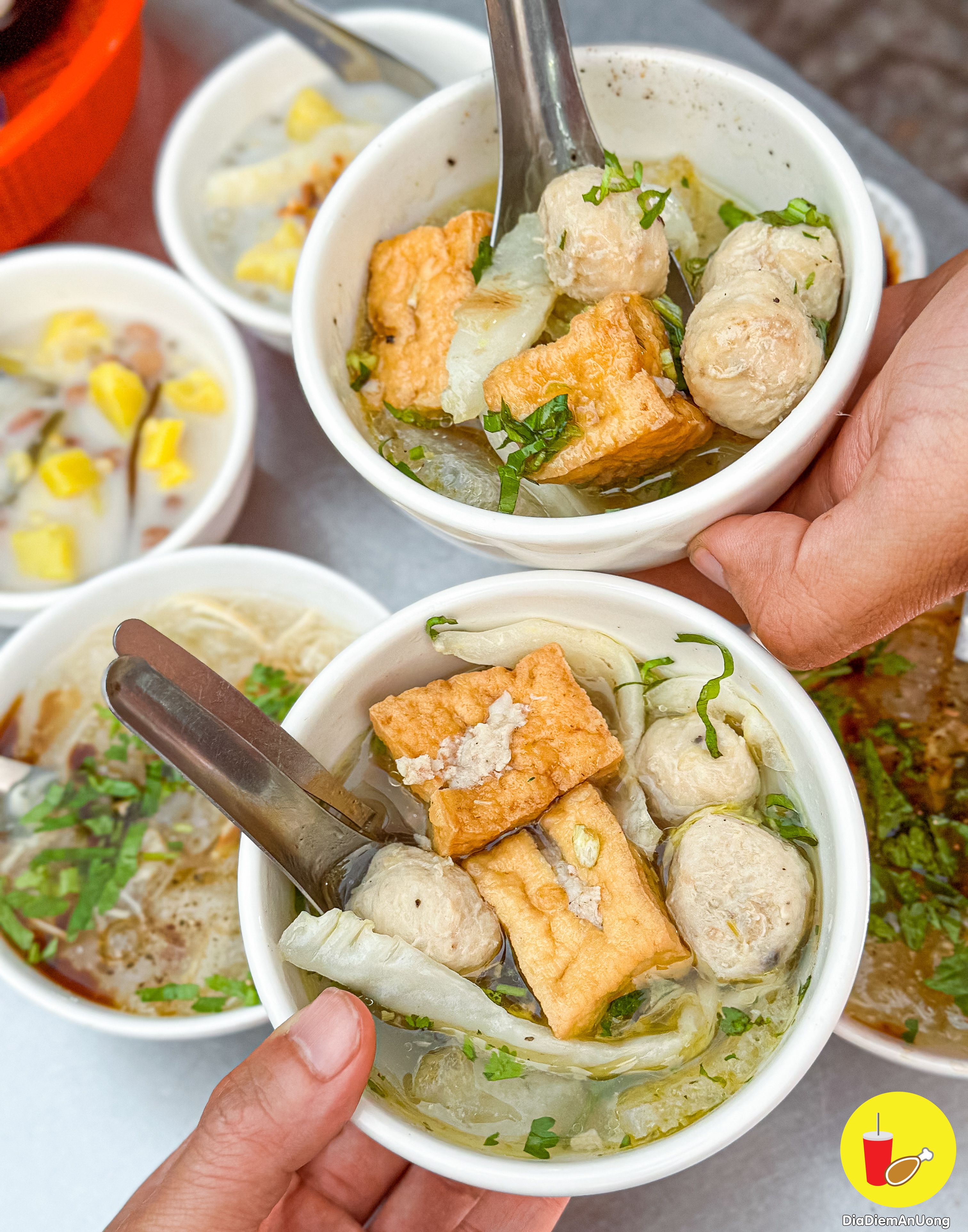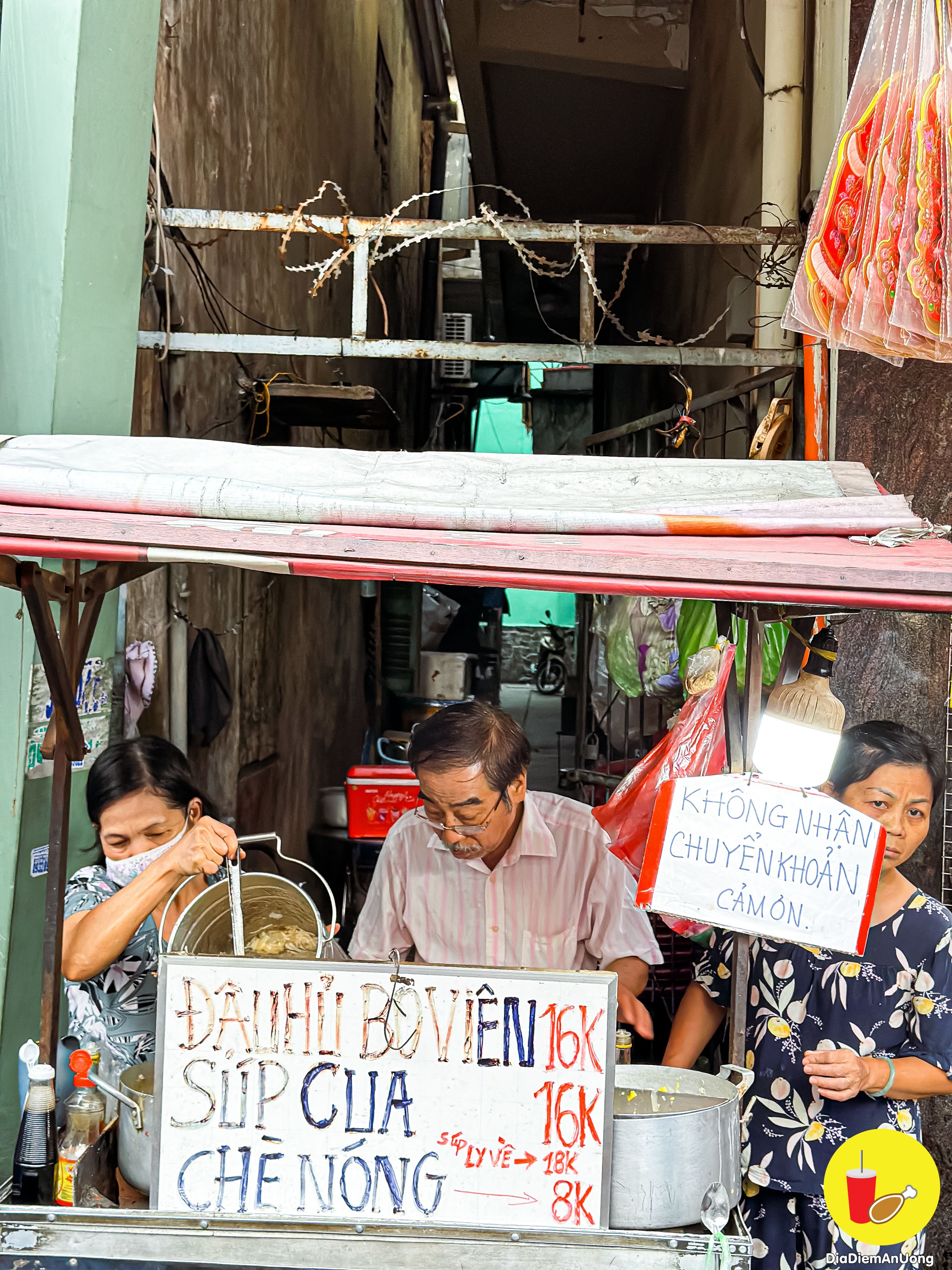 Không có biển hiệu, nhưng khi nhìn vào xe đồ ăn thấy menu đơn giản nhưng cái giá cực kỳ rẻ: đậu hũ bò viên/súp cua 16k, có thêm chè nóng 8k. Dân tình cuối tháng hay đang lép ví cũng không lo mà cứ vào ăn thôi vì cái giá khá là bình dân.