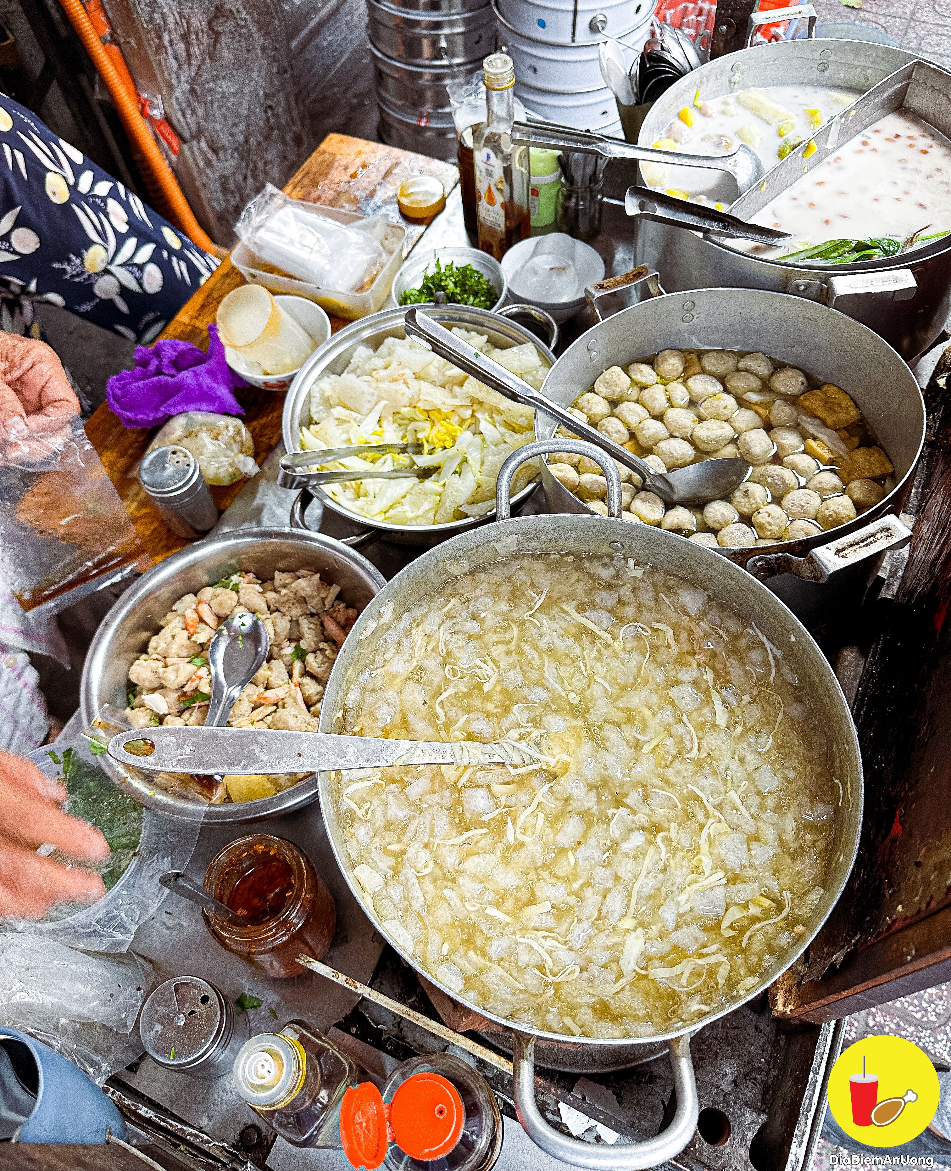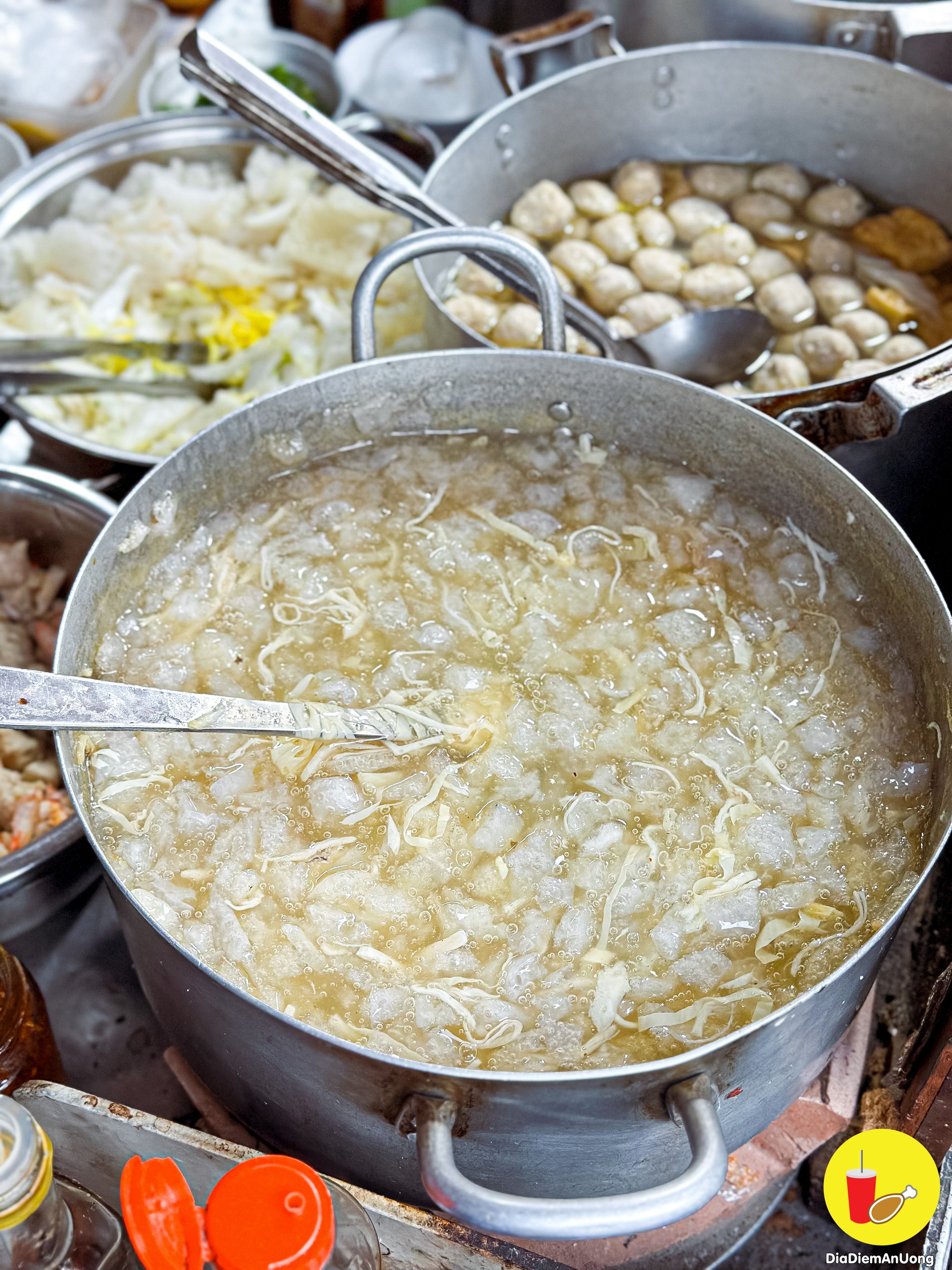 Súp cua bên trong có da heo, trứng, chả lụa, 1 ít cua, mọc,… kế bên là nồi bò viên, có đậu hũ được nhồi nhân bên trong, thêm cải thảo,… 3 nồi này lúc nào cũng được giữ nóng bằng bên than nên càng tăng thêm độ hấp dẫn cho món ăn.
