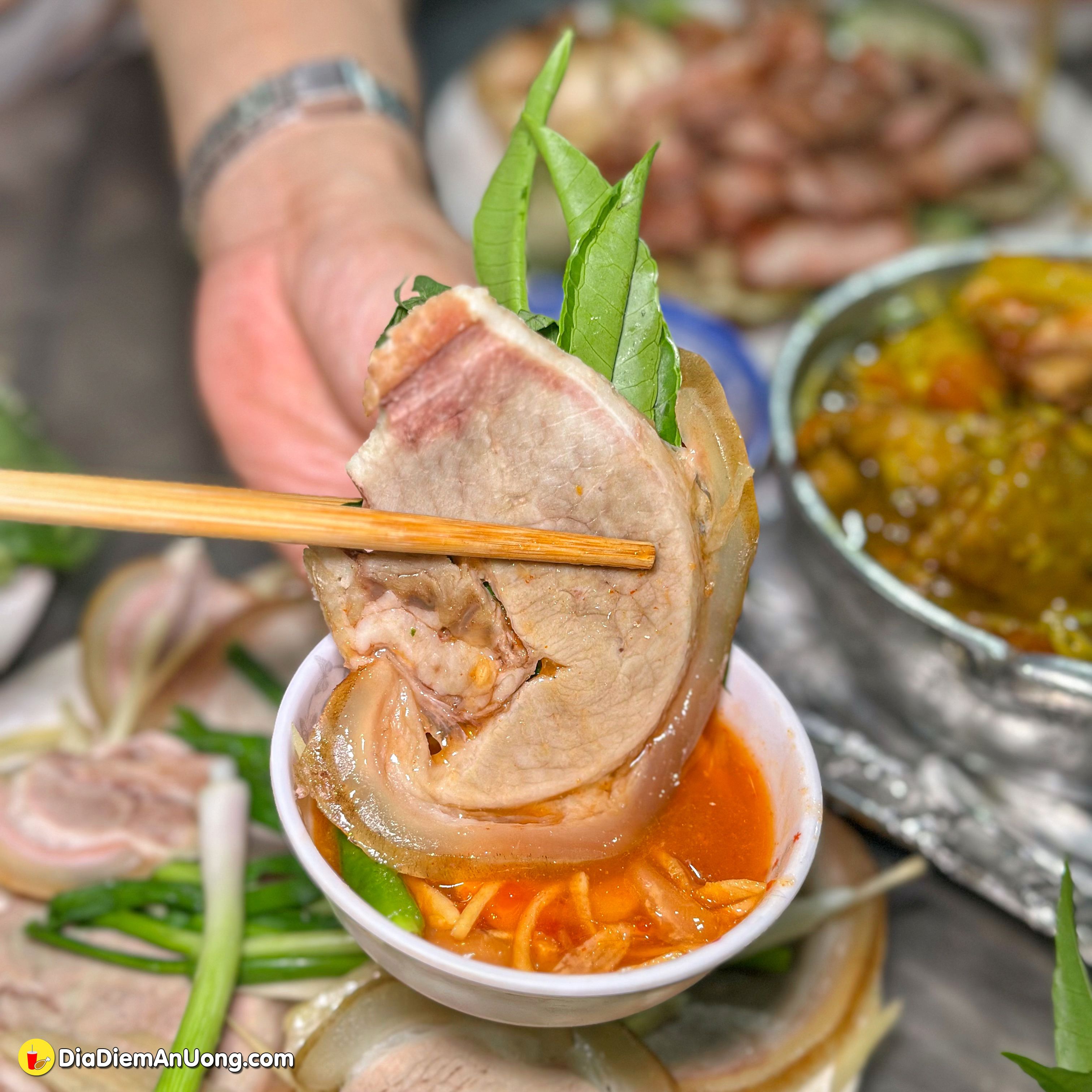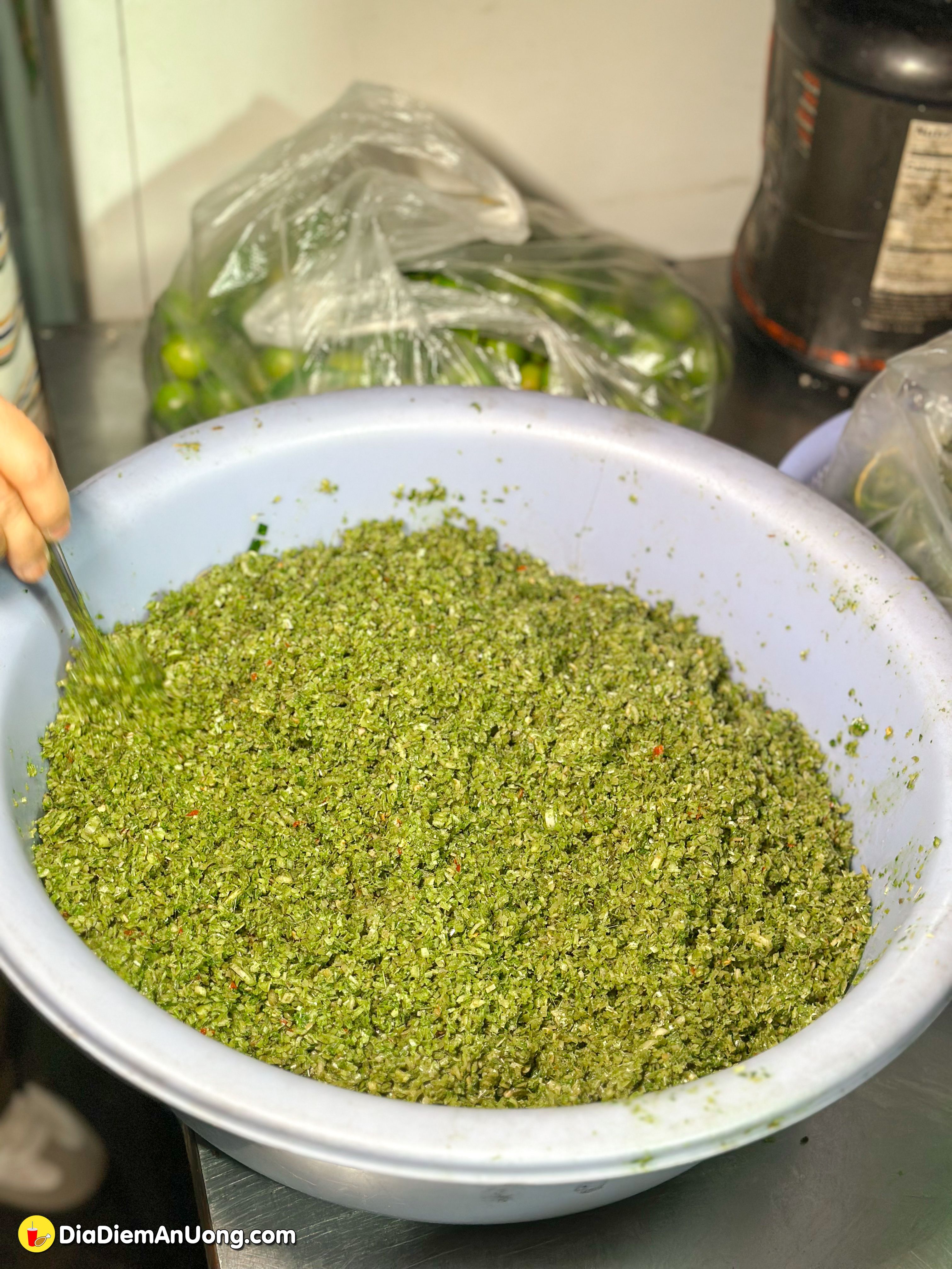 Điều làm nên thương hiệu của chú Thành chính là món muối sả. Nhìn vào cái thau muối sả khổng lồ, xanh mướt và thơm nồng nàn là đủ thấy cái "tâm" của quán rồi. Thành phần có cả lá é nên ăn vị chua chua mằn mặn, lạ miệng nhưng rất bắt vị khi chấm với gà.