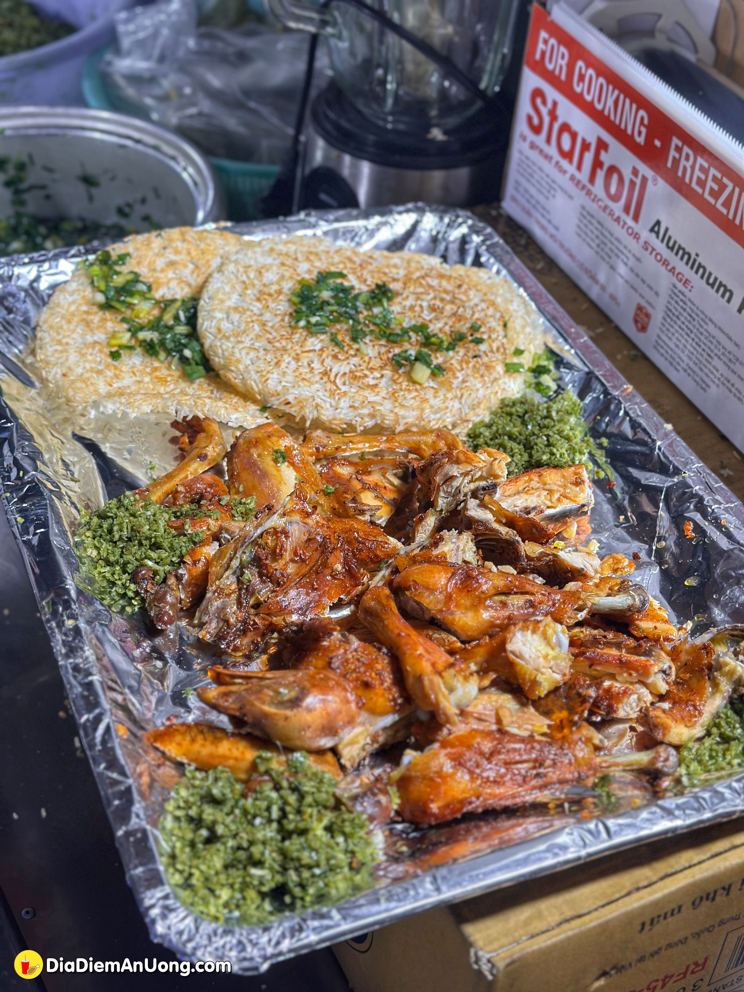 Một phần gà nướng khi bưng ra được bày trên giấy bạc, ăn kèm với cơm cháy mỡ hành, đồ chua và tất nhiên là không thể thiếu bát muối sả thần thánh.