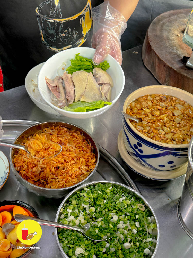 Còn này là Miến Đùi Gà Trộn Khô. Miến khô mà gặp gà ta da giòn đúng chuẩn thì xác định là dính luôn. Miến trộn kiểu khô nhưng không bị cứng hay dính bệt. Sợi miến trong, dai nhẹ, thấm sốt đậm đà, hành phi thơm và tóp mỡ beo béo. Gà được lóc tay cực khéo, trình bày đẹp mắt.