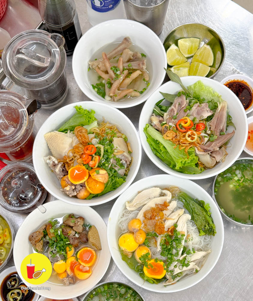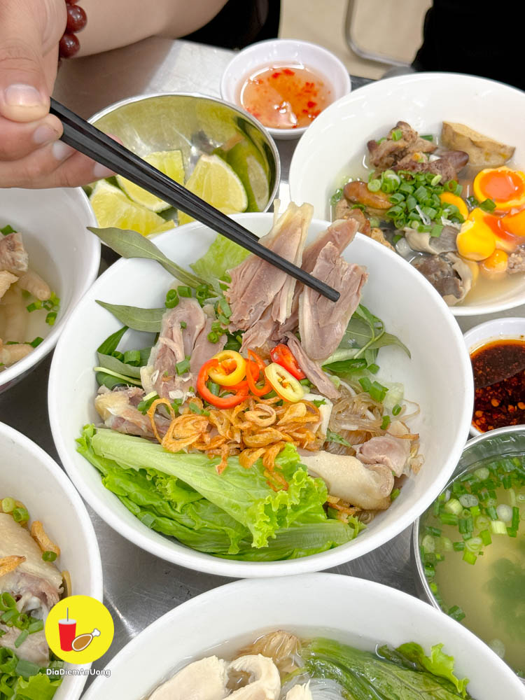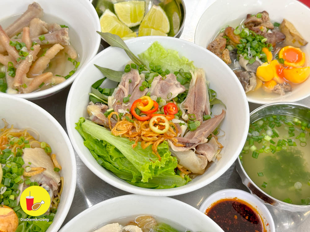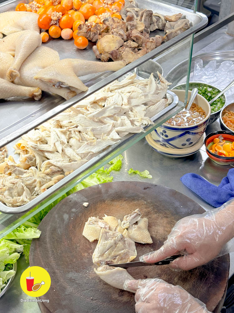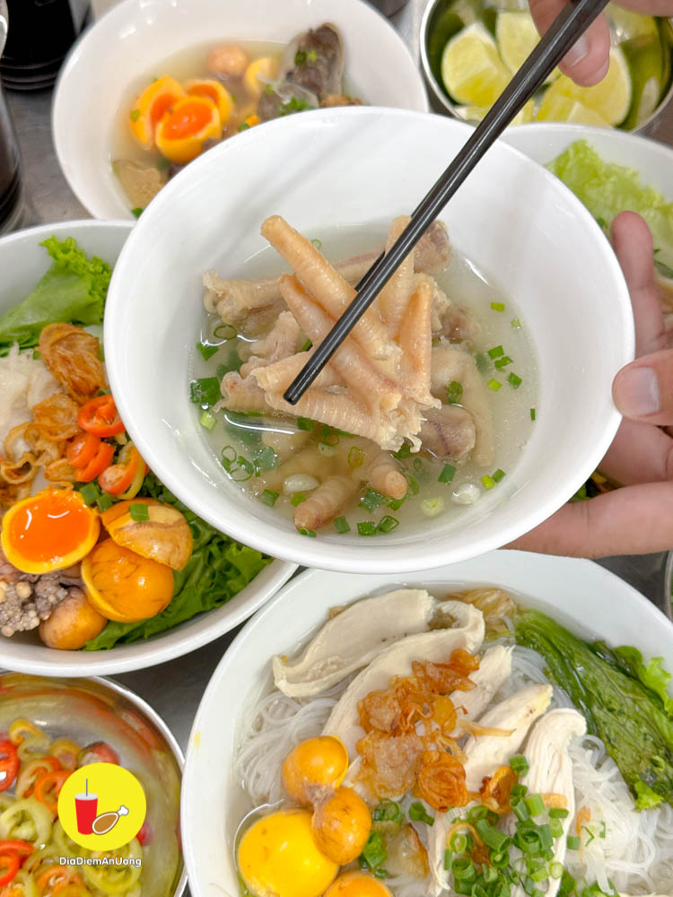 Nước lèo chủ yếu được nấu từ xương gà nên vị thơm ngon thanh ngọt, quán bán đầy đủ từ má đùi, ức gà, bộ lòng gà trứng non cho tới chân gà và phao câu. Điểm đặc biệt ở đây chính là phương pháp lóc xương gà riêng, với cách lóc này thì đảm bảo ăn gà không lo bị dính tay.