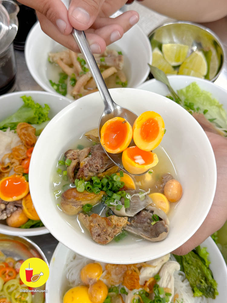 Tiếp đến là tô Hủ Tiếu Gà nước ăn cùng trứng lòng đào. Nước dùng trong veo, ngọt thanh từ xương và thịt gà, không váng dầu, không bột ngọt gắt cổ. Điểm cộng sáng nhất chính là trứng lòng đào – lòng đỏ sánh mịn, béo nhẹ, quyện vào sợi hủ tiếu ăn cực "đã miệng". Chỉ cần chan miếng nước dùng, cắn một miếng gà, thêm chút trứng lòng đào là đủ để bạn phải xuýt xoa.