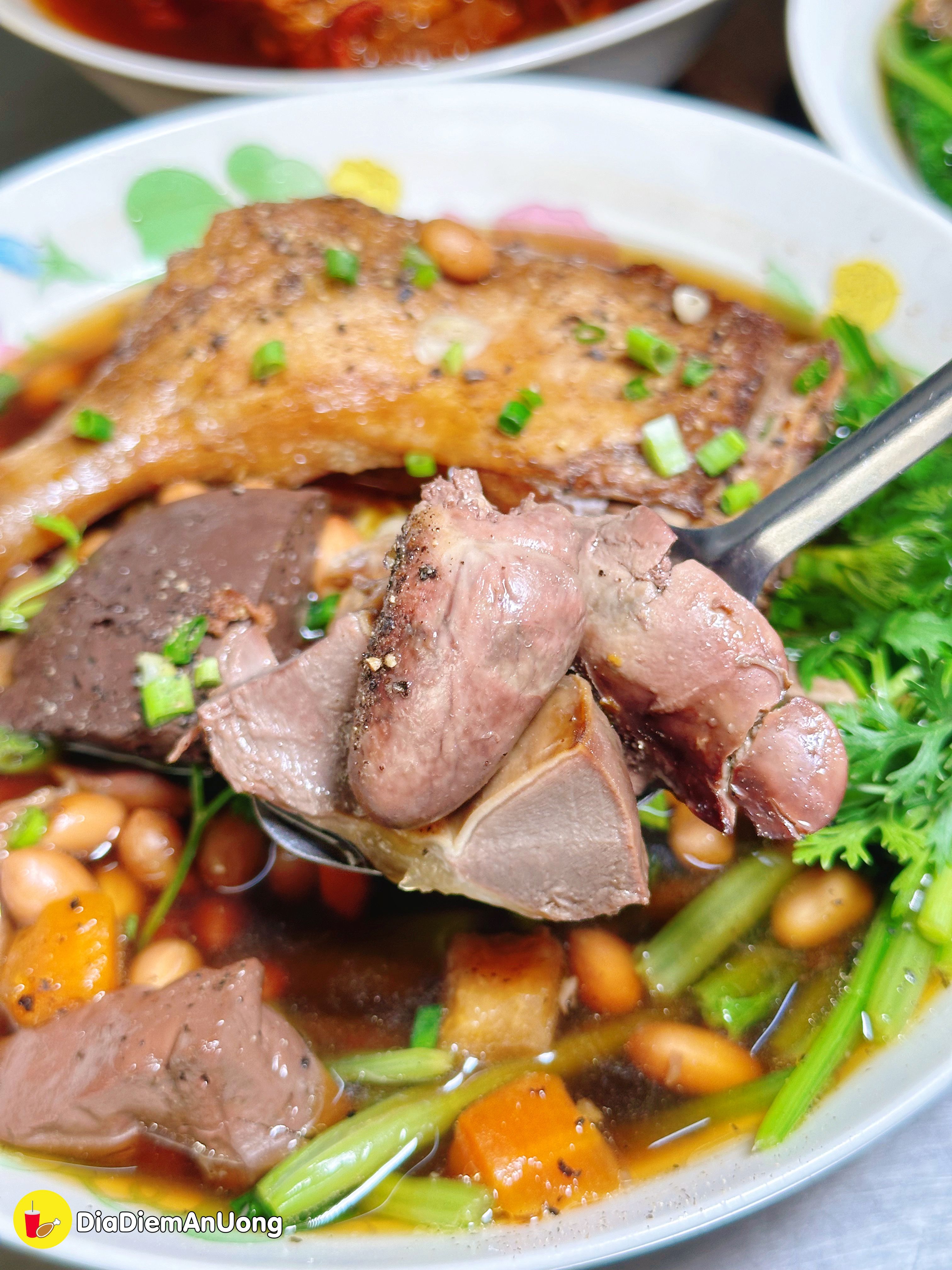 Vịt ở đây được tiềm tầm 12 tiếng nên thịt mềm, thấm vị dễ ăn. Nước lèo nấu thuốc bắc như truyền thống nhưng cho cùng các nguyên liệu tạo độ ngọt thanh như củ cải, đặc biệt là đậu phộng.