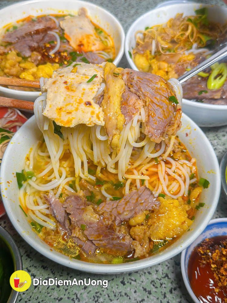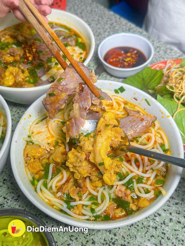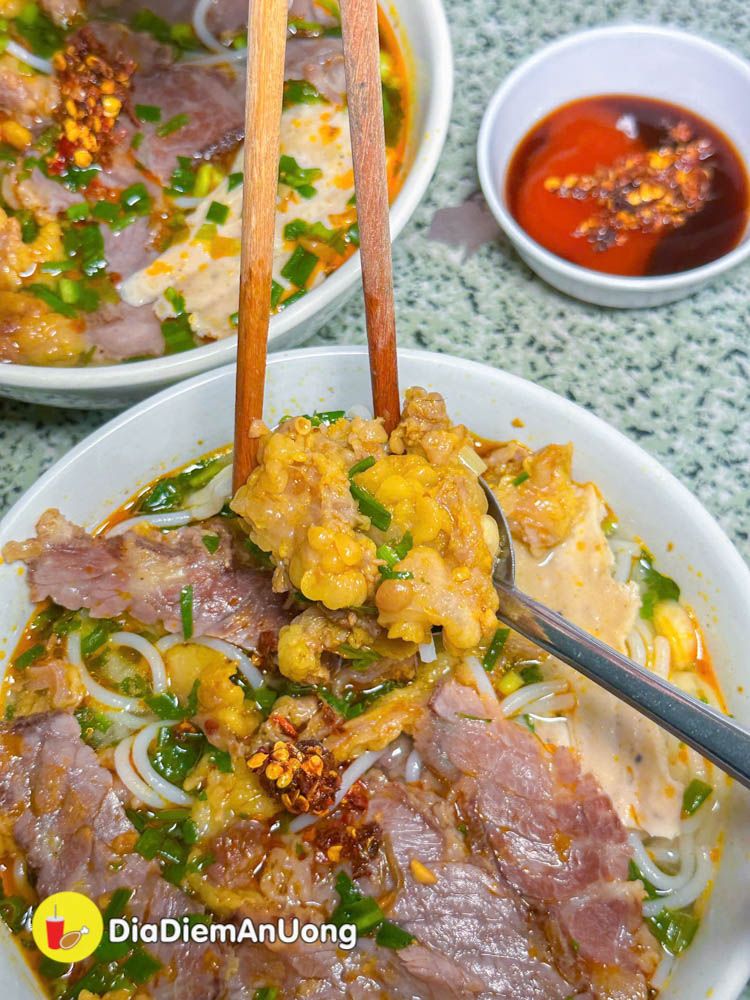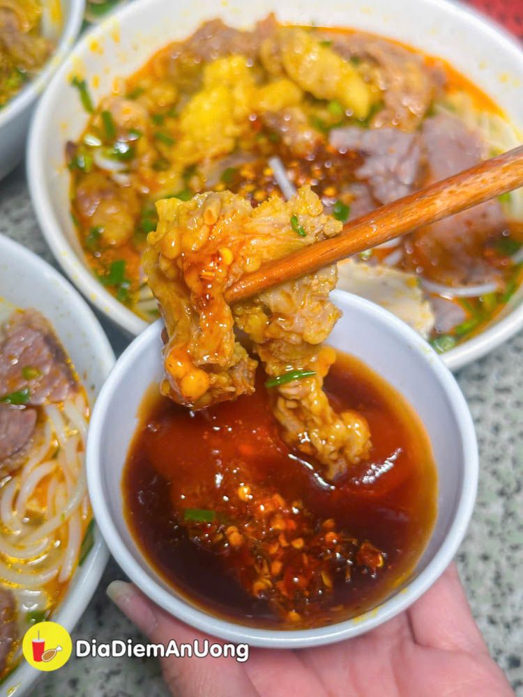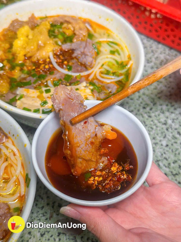 Một điểm khác biệt nữa là bún bò ở đây mọi người thường ăn với mắm tôm. Ngoài bàn chú có để sẵn mắm tôm ai thích vị mắm đậm xíu thì có thể chấm cùng hoặc cho trực tiếp vào tô nha