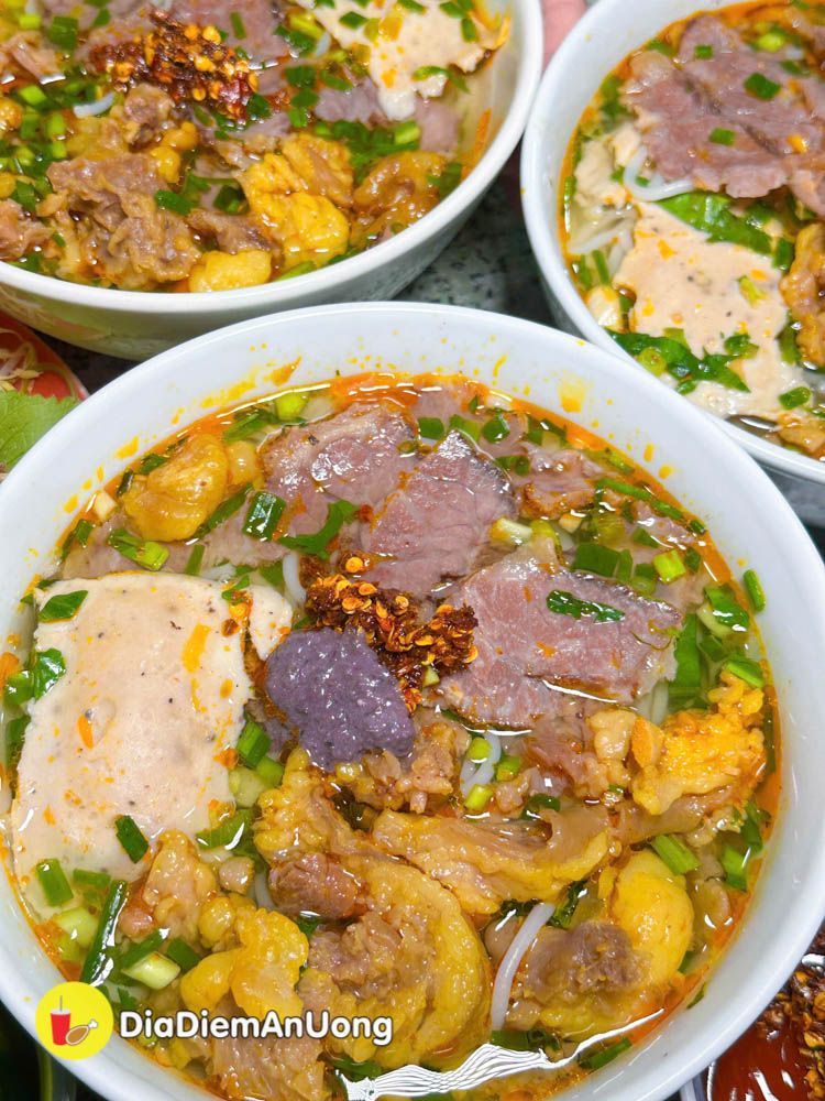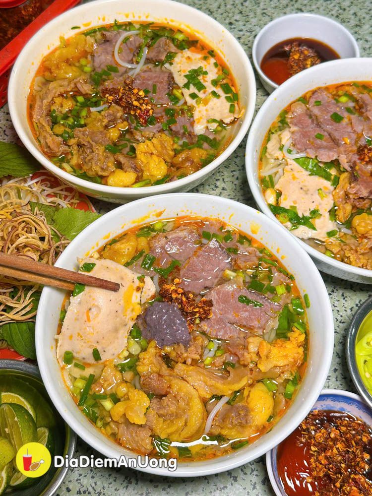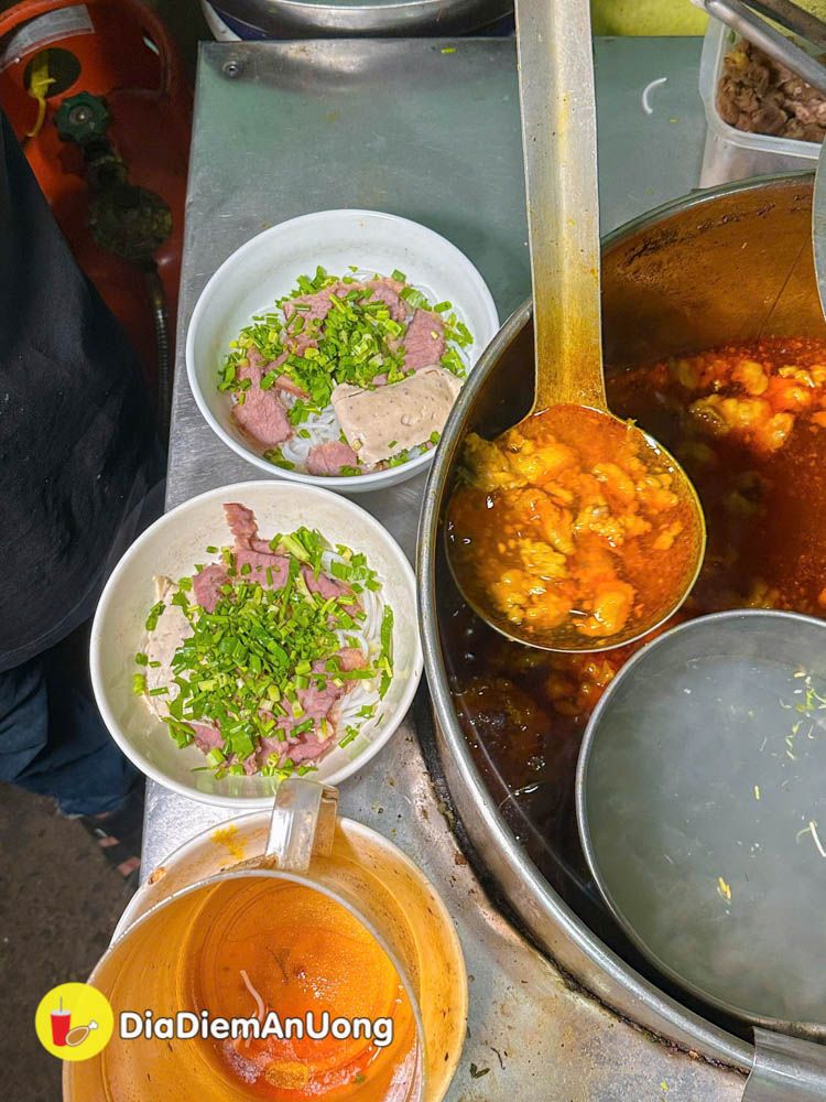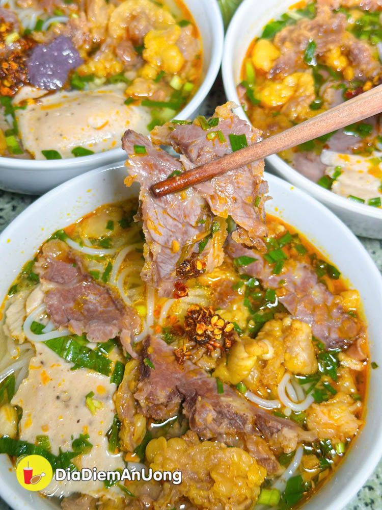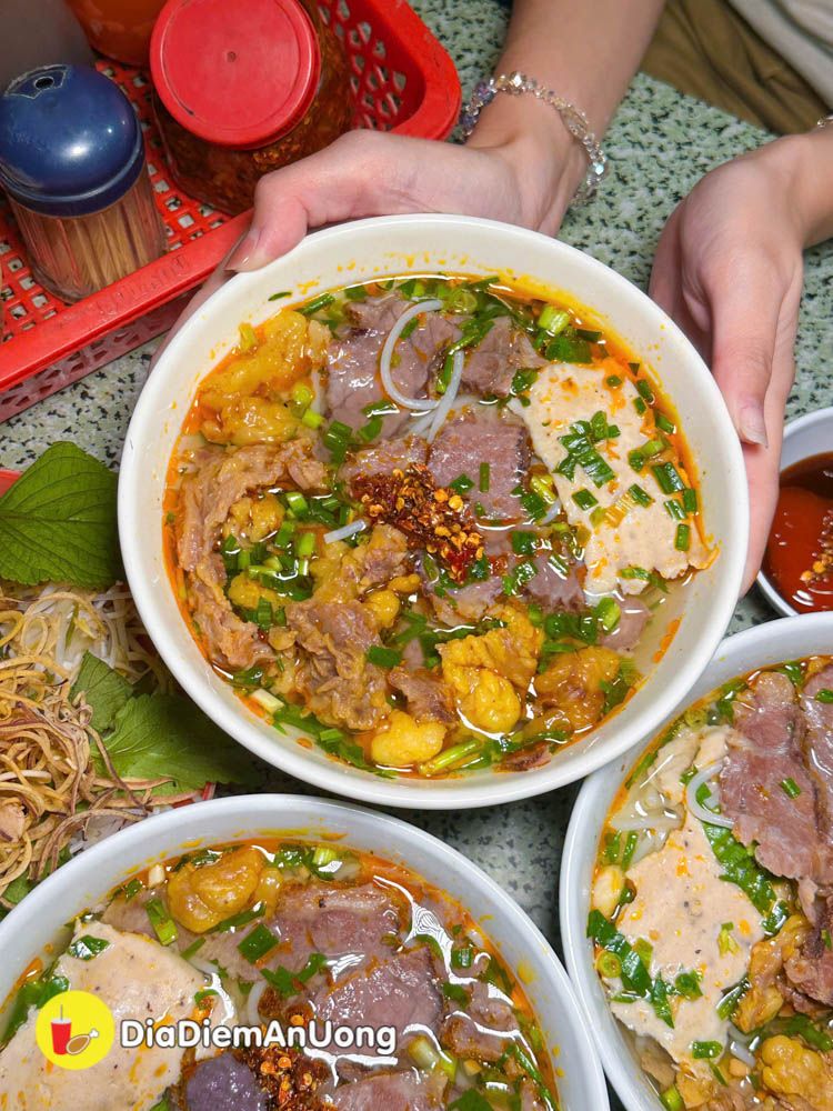 Một điểm khác biệt nữa là bún bò ở đây mọi người thường ăn với mắm tôm. Ngoài bàn chú có để sẵn mắm tôm ai thích vị mắm đậm xíu thì có thể chấm cùng hoặc cho trực tiếp vào tô nha