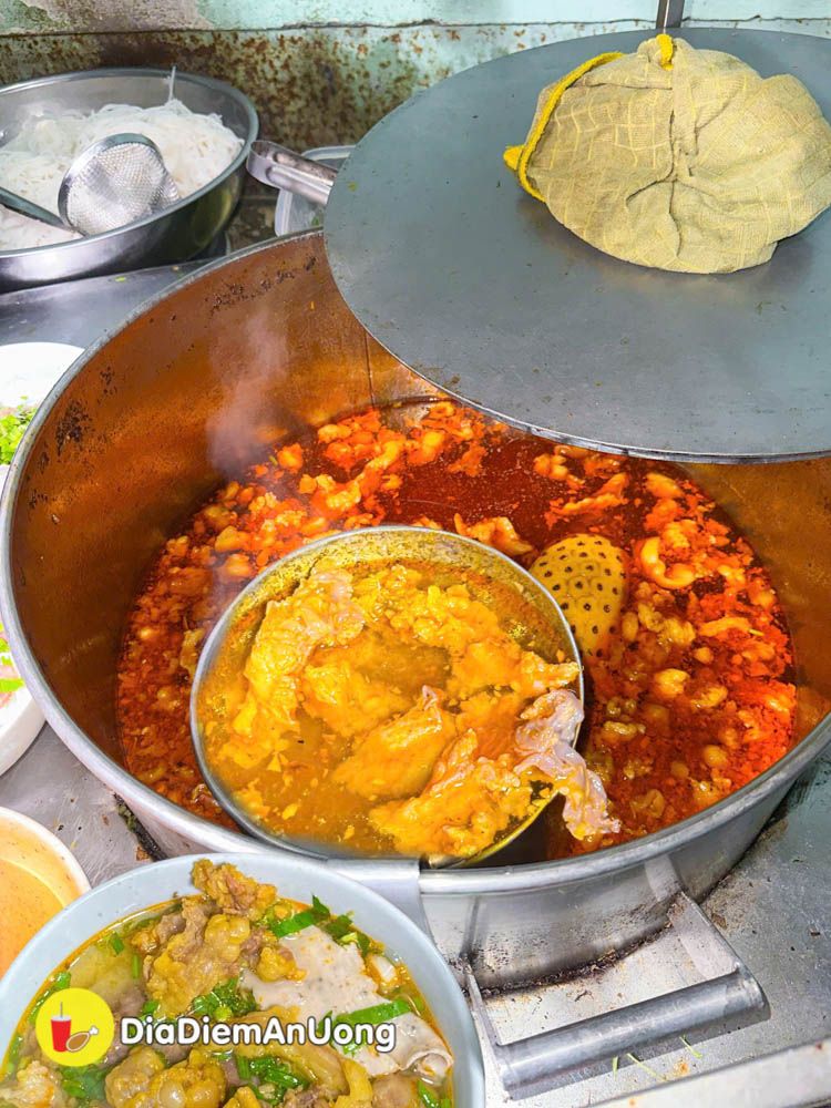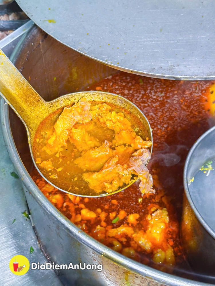 Nồi nước lèo của chú không quá đậm gia vị, chủ yếu giữ nguyên hương vị cơ bản của nước hầm bò với thơm, sả cho thêm tí ruốc huế thôi