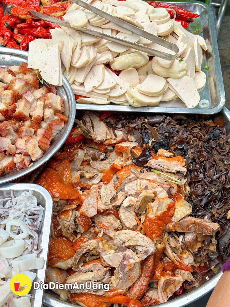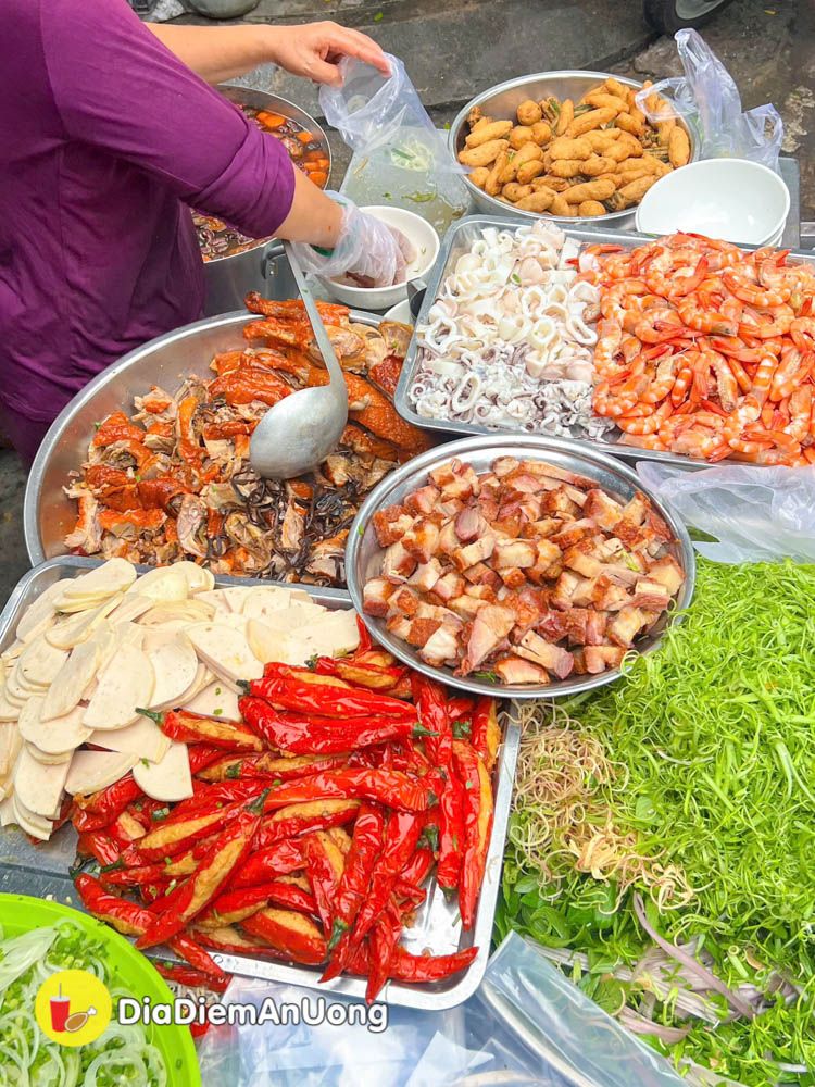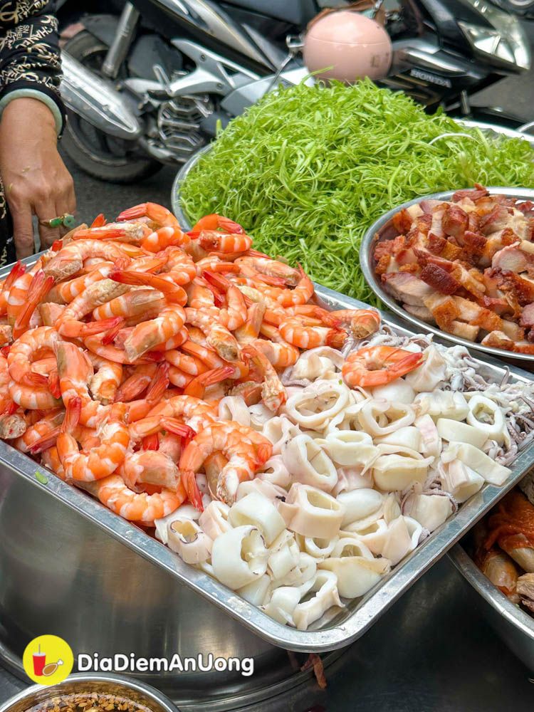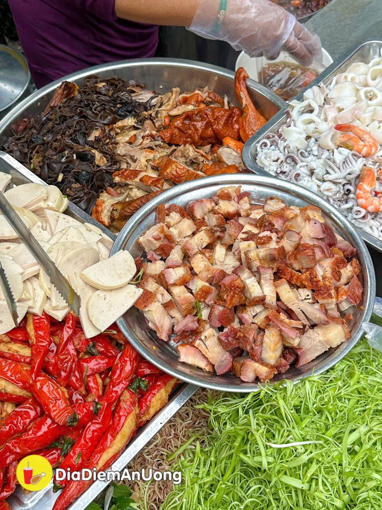 Do bán đông nên chị Hiền bày mấy mâm topping nhìn hấp dẫn lắm, tôm - mực - heo quay - chả cá - chả lụa...Ghé đây nhìn bàn đồ ăn ê hề như vậy là tui mê rồi á