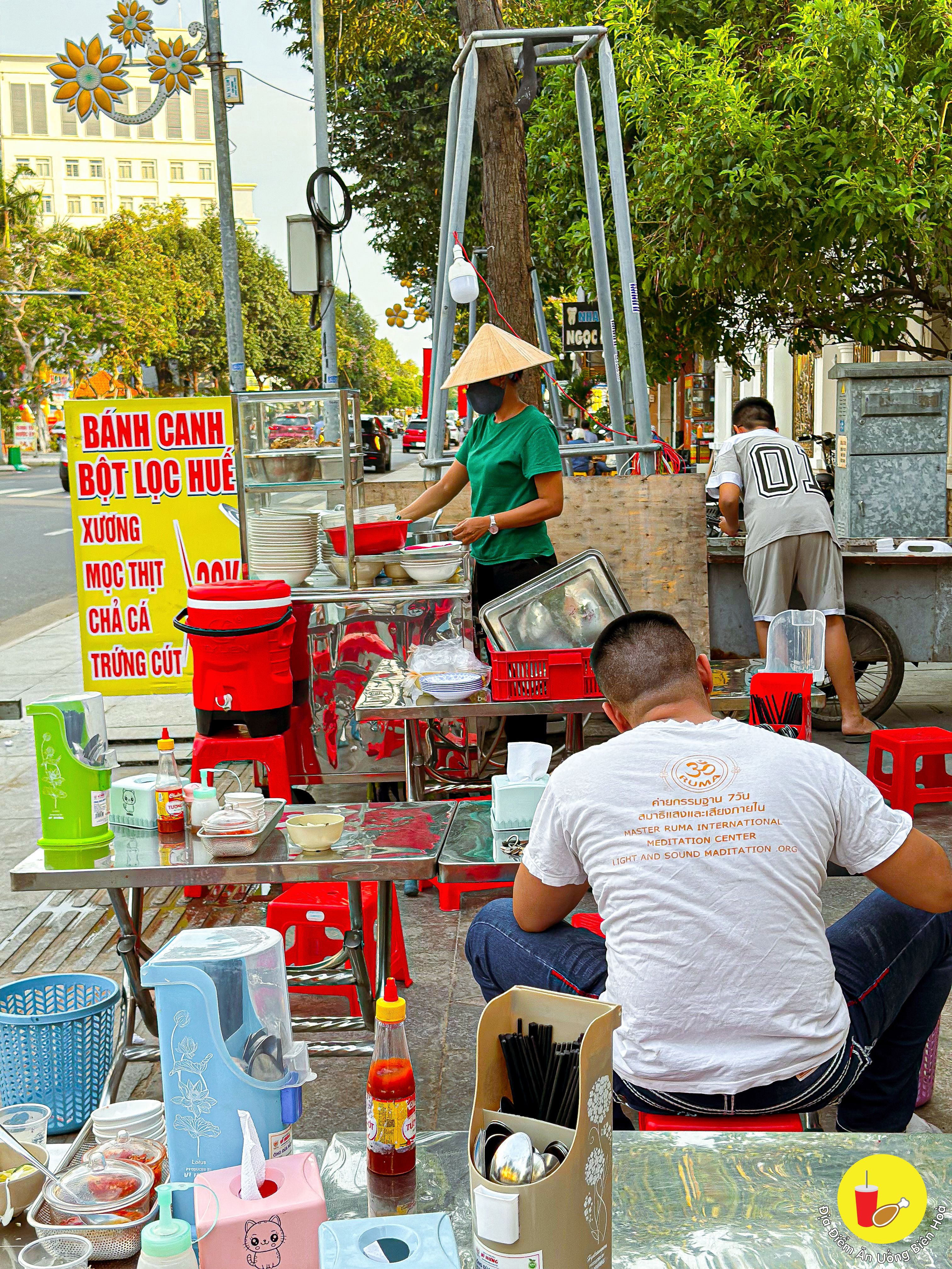 Xe bánh canh nhỏ bánh lề đường thôi nhưng khi đi ngang qua thấy tấm bảng để Bánh canh bột lọc Huế là thấy mới lạ muốn vô ăn thử lần cho biết.