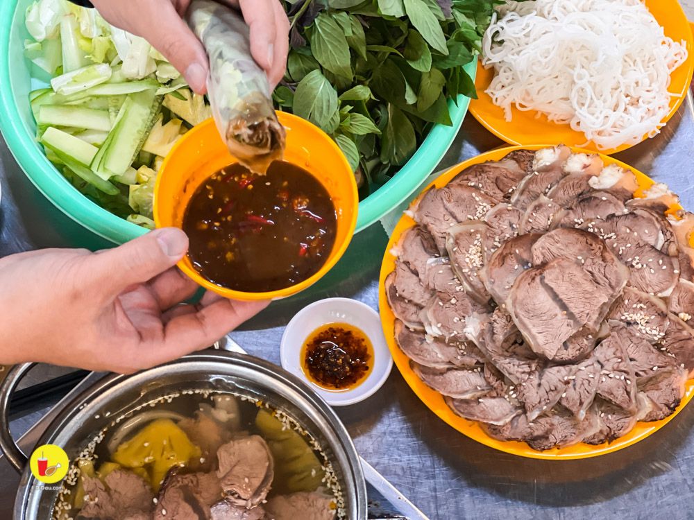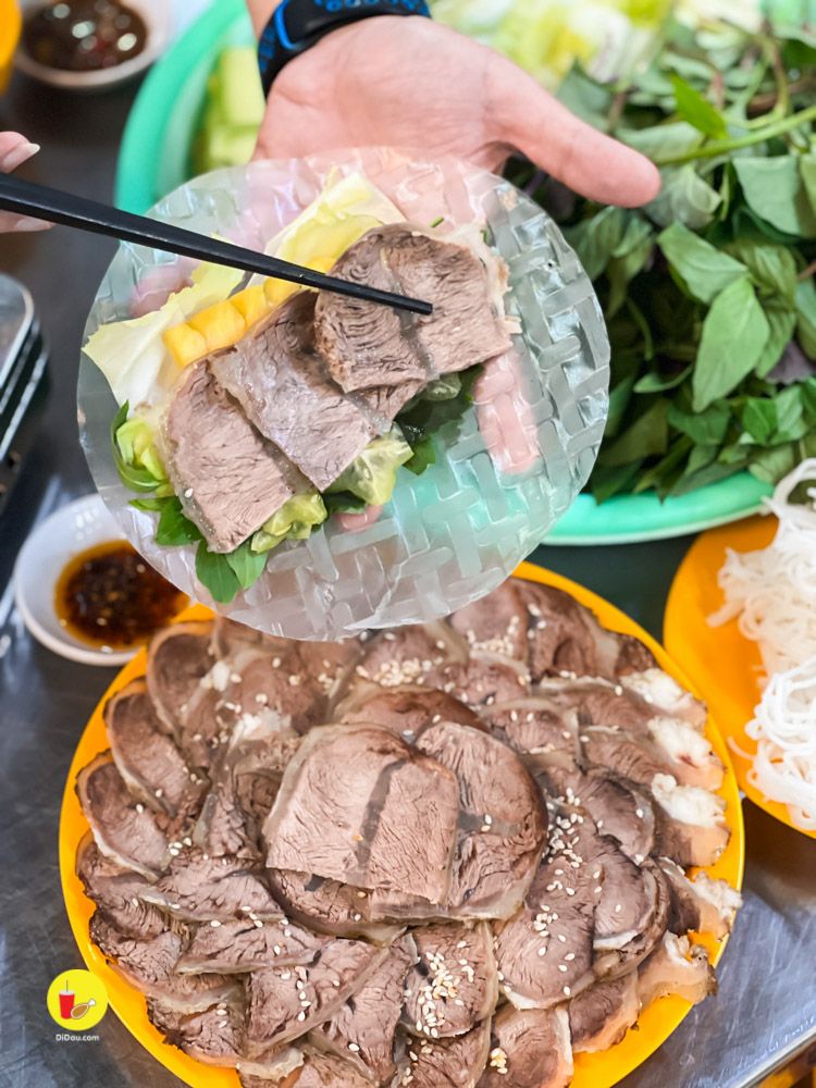 Bò tươi đỏ mọng lướt nhẹ qua nước giấm cho hơi tái lại là dùng ngay mới cảm nhận được hết vị ngọt tự nhiên và độ mềm siêu đã, cuốn với chút rau và bún chấm đẫm trong mắm nêm thì thiệt là mỹ vị.
