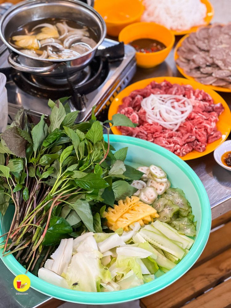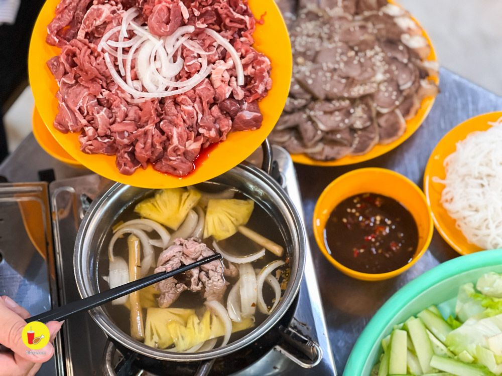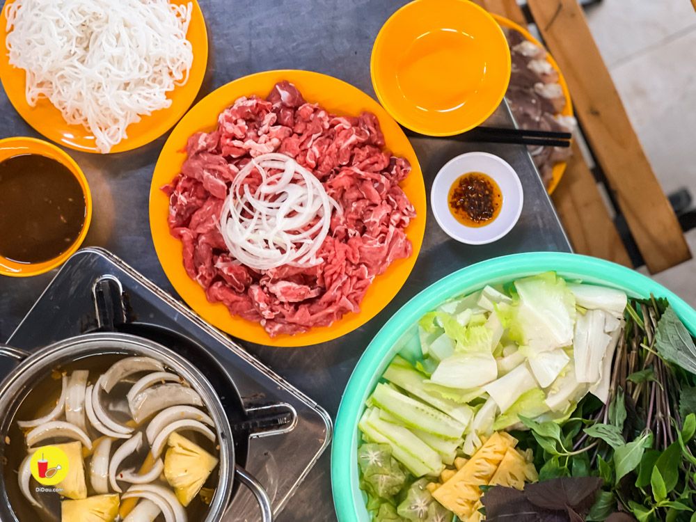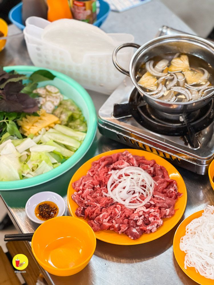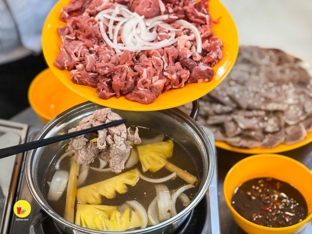 Bây giờ chỉ cần nổi lửa lên cho nước giấm chua chua - ngọt ngọt - thanh thanh nóng sôi là có thể nhúng liền các miếng bò thơm ngon. Nước giấm được pha rất vừa, thơm lừng mùi hành tây và trái khóm nên nhúng bò cực bắt vị nha.