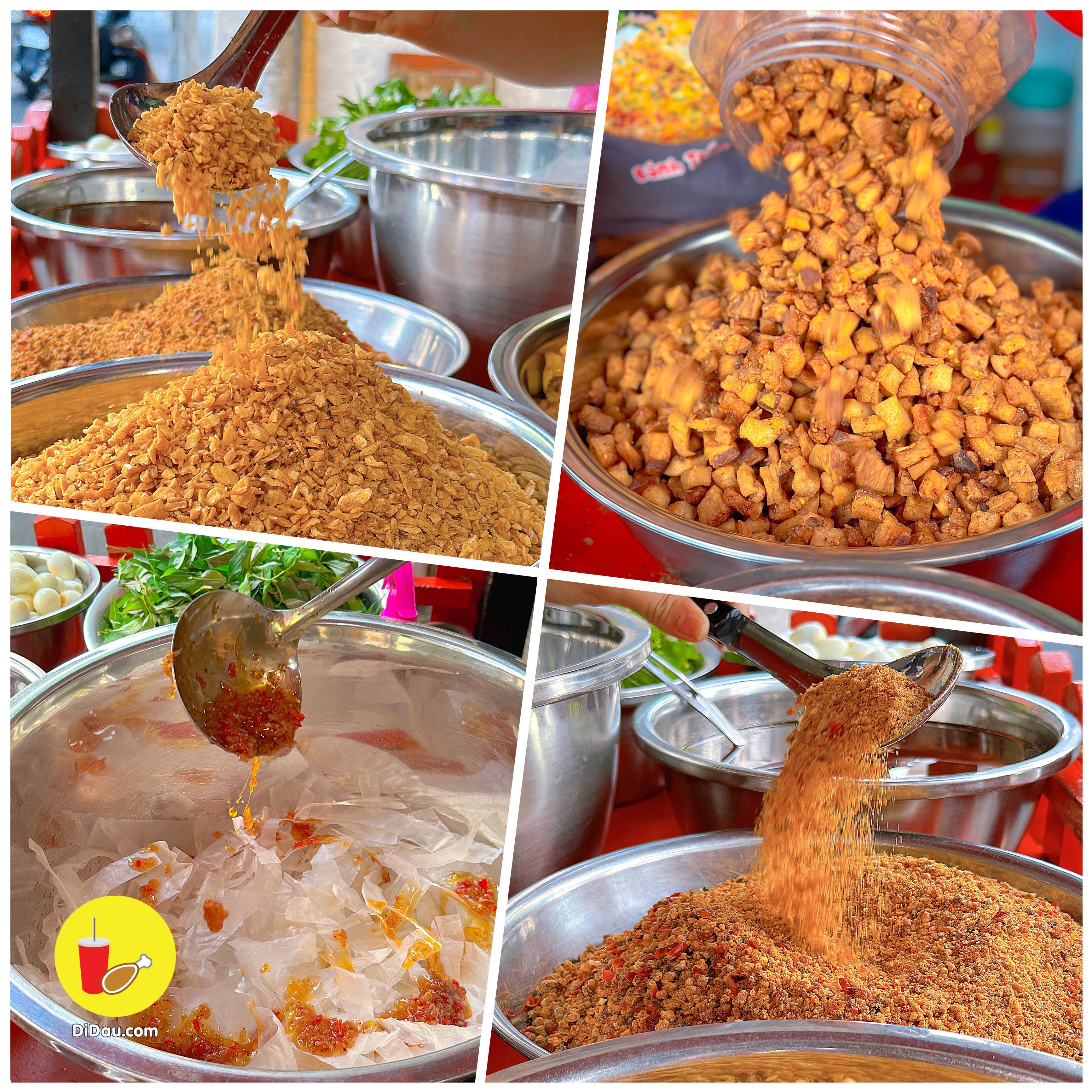 Ngoài bánh tráng trộn sate, muối ớt,….thì quán còn có bánh tráng mỡ hành, thịt băm. Phần nào cũng có kèm tóp mỡ theo hết nha !!!!