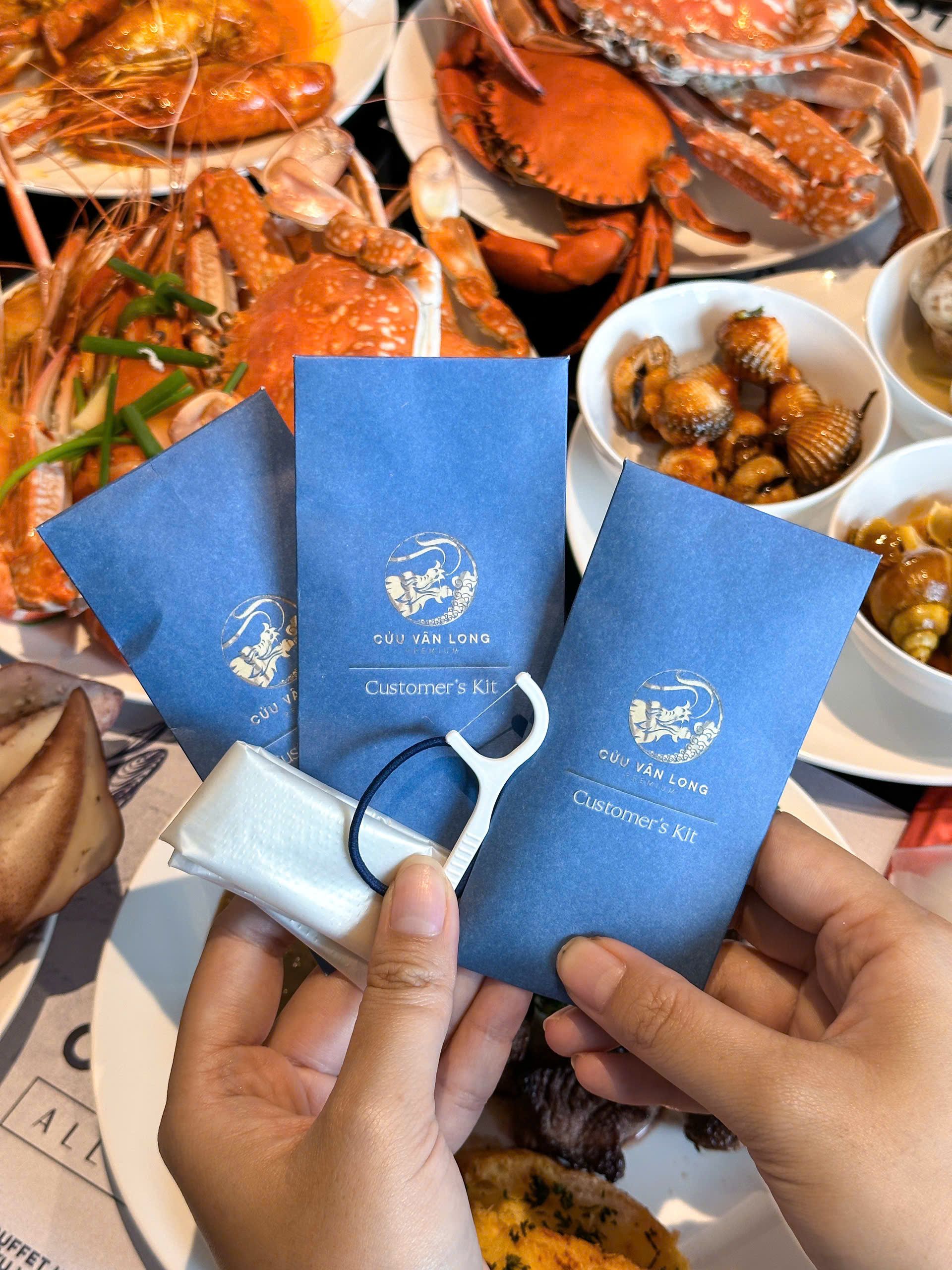 Ăn ngon, view đẹp thôi chưa đủ, CVLP còn ghi điểm tuyệt đối về dịch vụ. Có bộ Kit với đầy đủ bao tay, tăm chỉ nha khoa và thun cột tóc này là tui thoải mái chiến tới bến ^^.