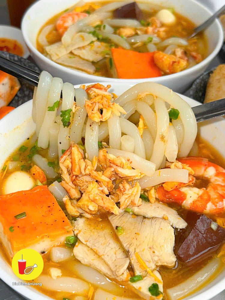 Sợi bánh canh thì tui thấy cũng khác so với cọng bánh canh mua ngoài chợ. Nó to hơn, dẻo mềm thấm trọn nước bánh canh cua thơm đậm đà