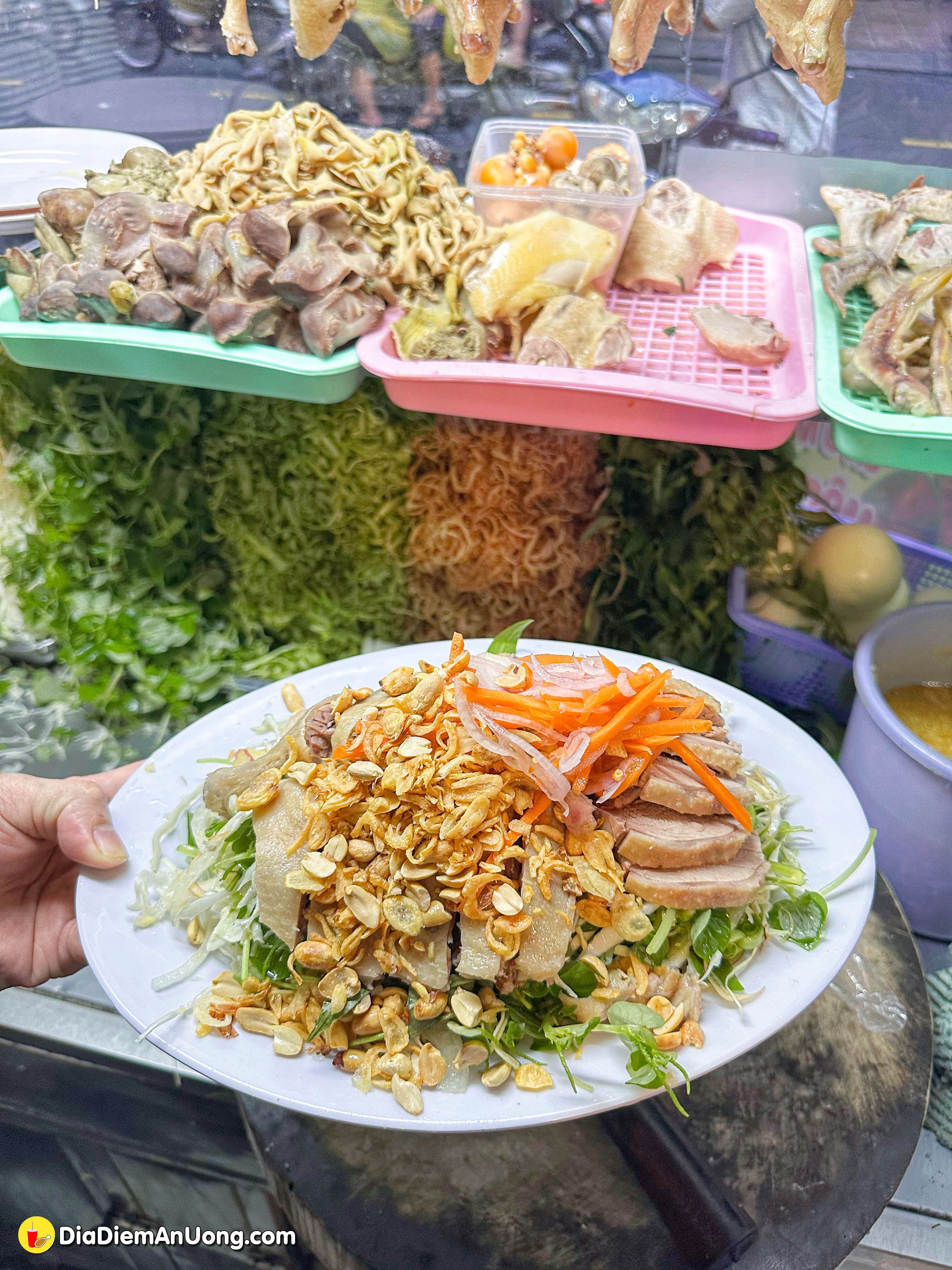 Thịt vịt được chặt vừa miếng, trộn cùng bắp cải, rau răm, hành tây thái mỏng. Tất cả được nêm nếm vừa phải để không lấn át vị ngọt của thịt vịt. Điểm đặc biệt là độ giòn của rau, vị bùi bùi của đậu phộng rang và hành phi thơm lừng rắc đều trên mặt.