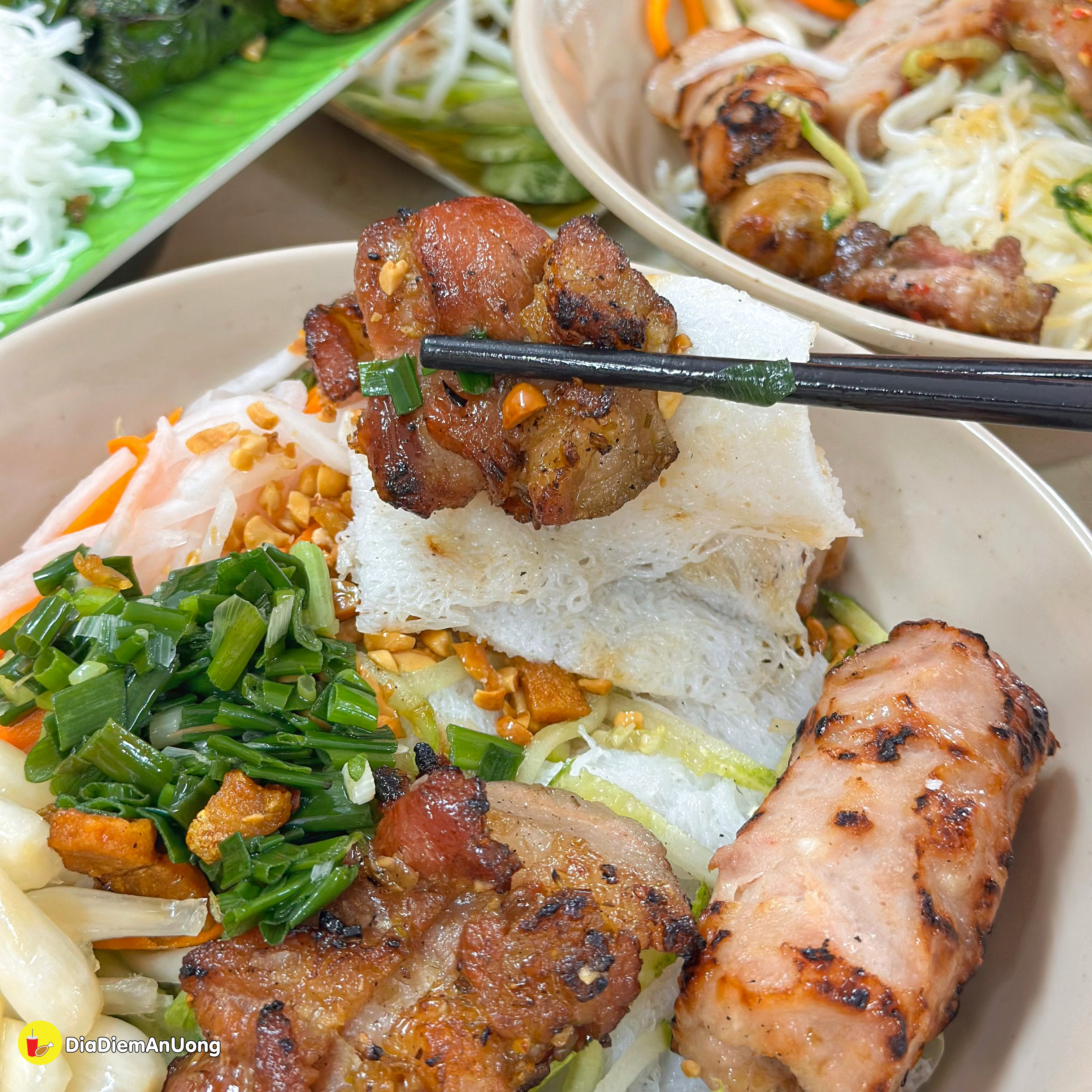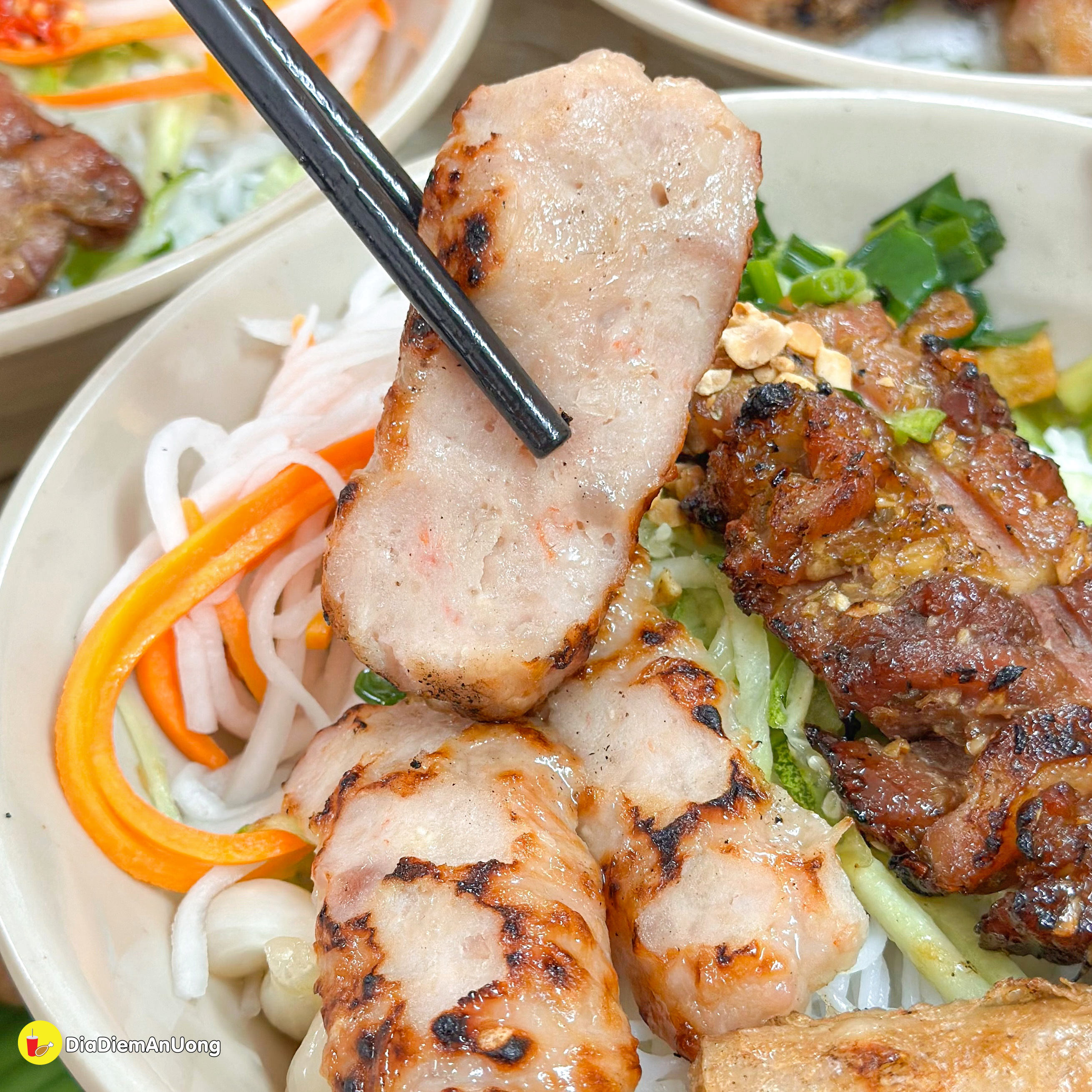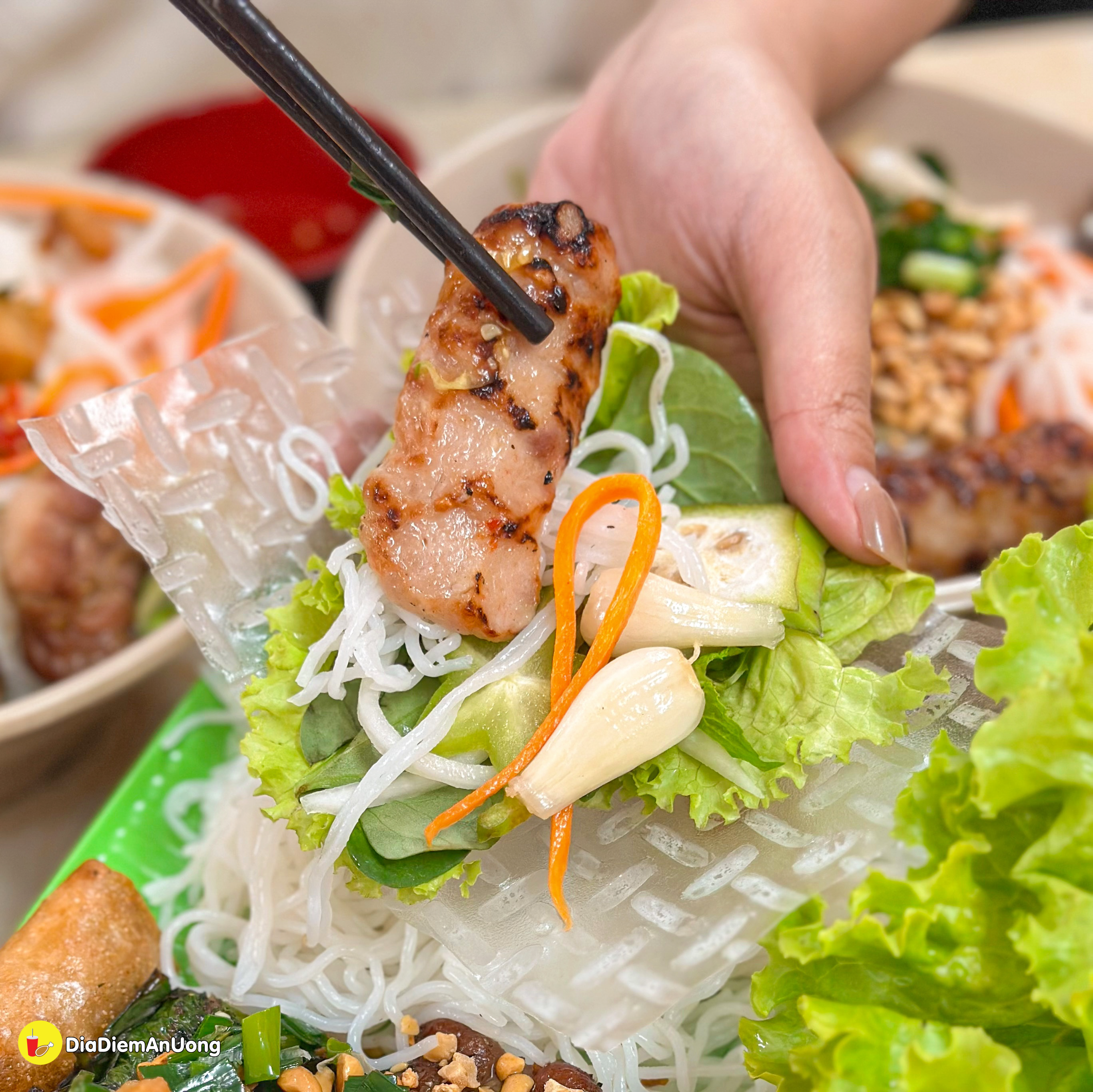 Món bún thịt nướng ở đây được đánh giá cao nhờ thịt nướng thơm ngon, được ướp gia vị vừa miệng và nướng chín tới, giữ được độ mềm và ngọt tự nhiên. Thịt được cắt miếng cũng dày nhưng ăn vẫn mềm mộng thấm vị.