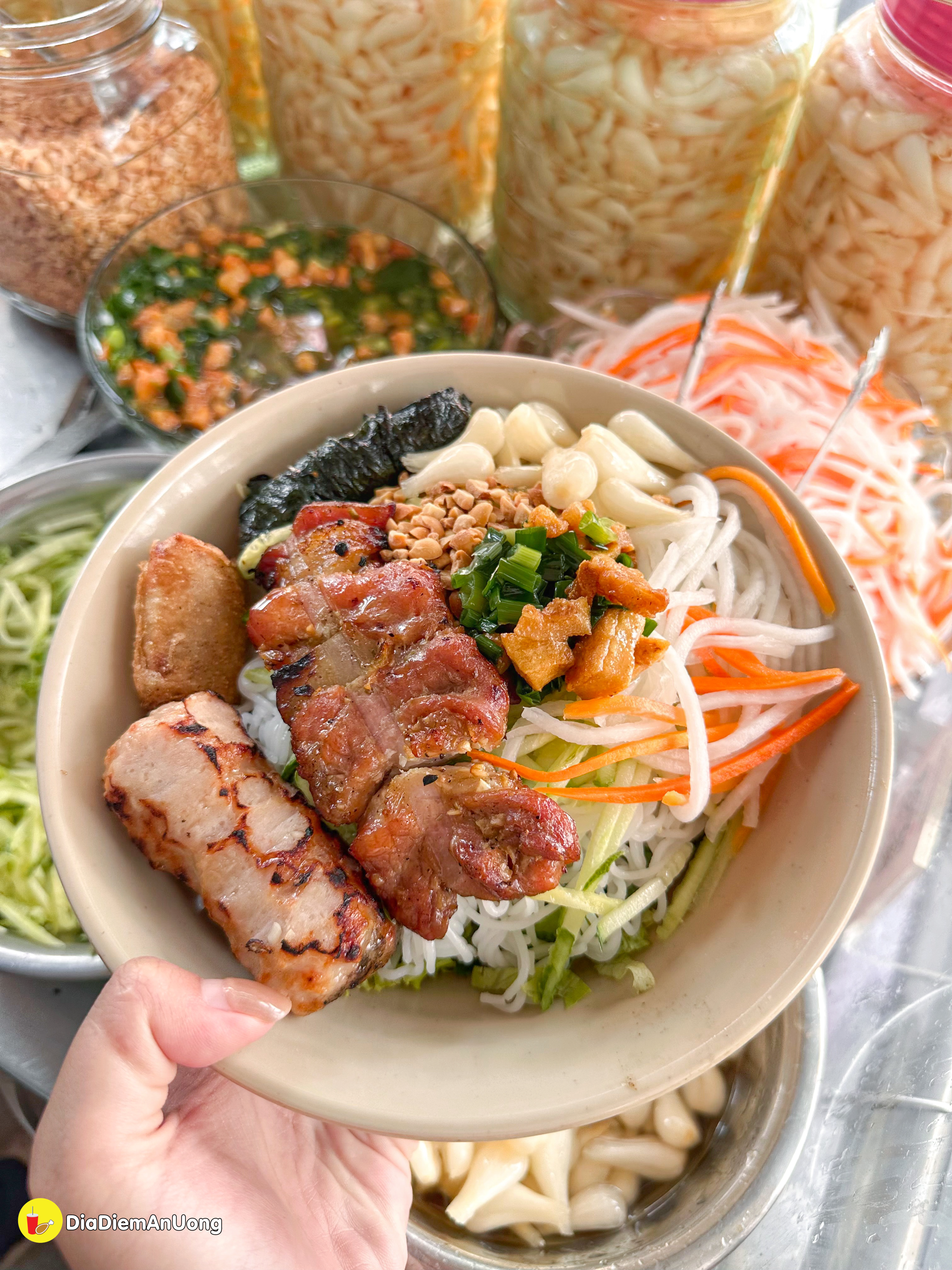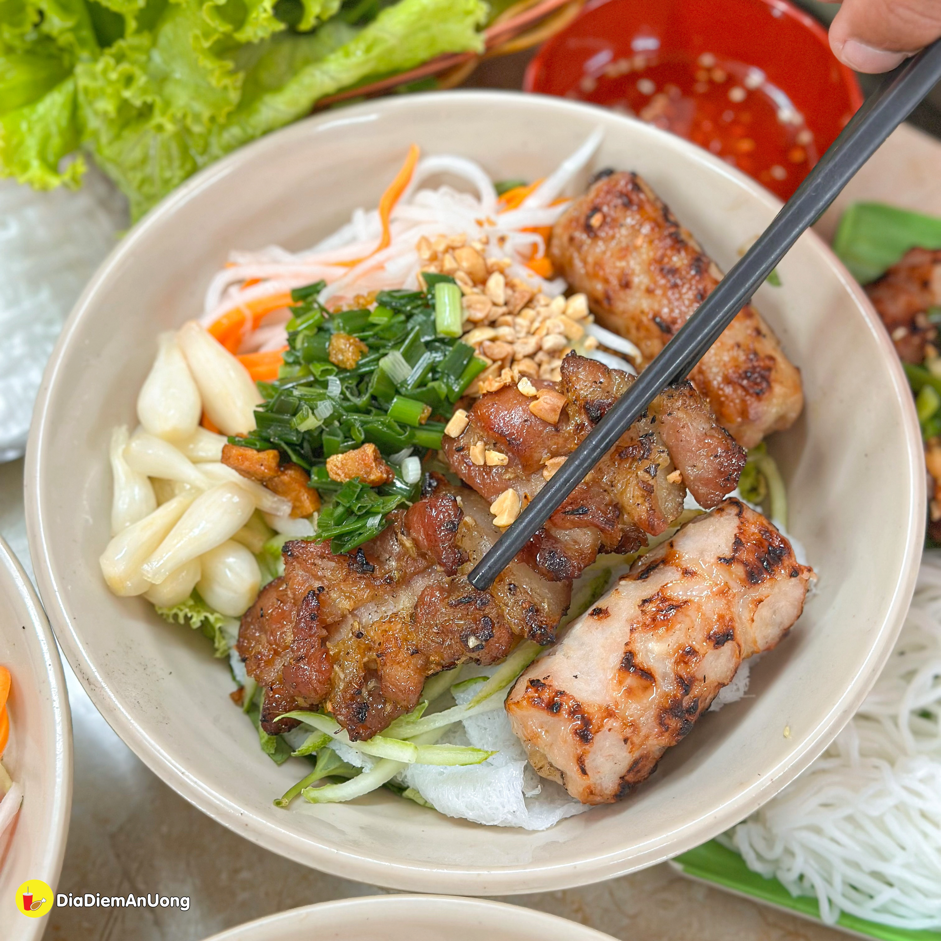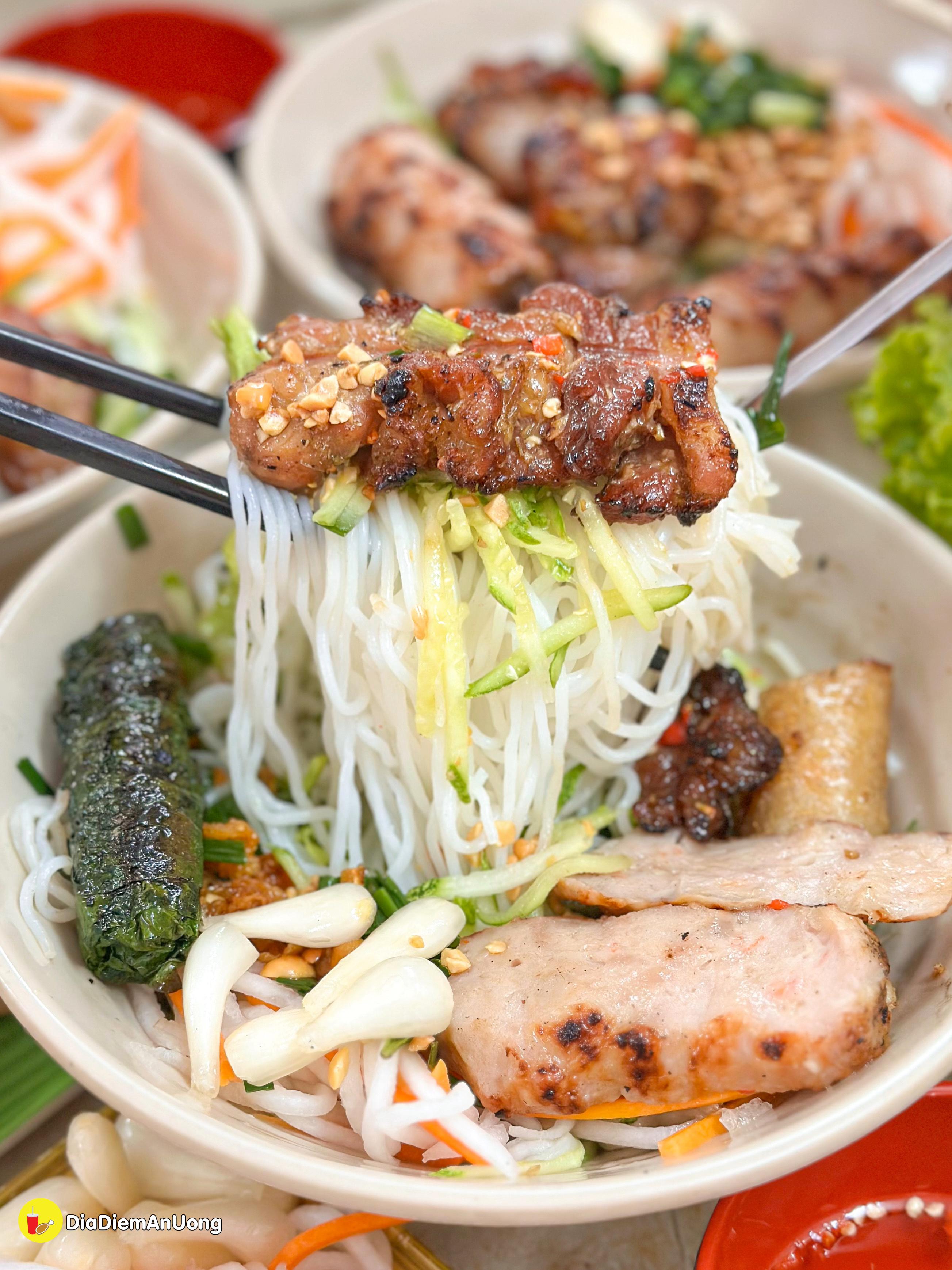 Món bún thịt nướng ở đây được đánh giá cao nhờ thịt nướng thơm ngon, được ướp gia vị vừa miệng và nướng chín tới, giữ được độ mềm và ngọt tự nhiên. Thịt được cắt miếng cũng dày nhưng ăn vẫn mềm mộng thấm vị.